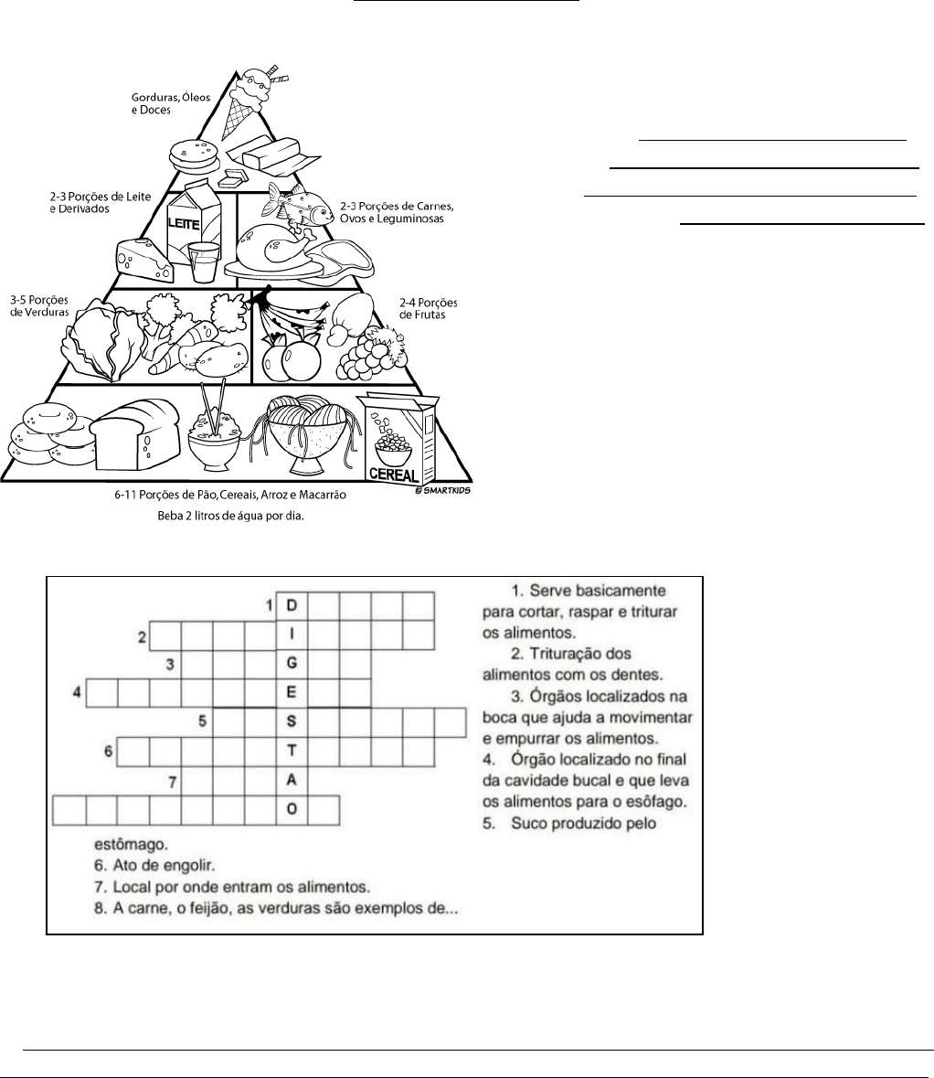 Escola:____________________________________________________DATA: ____/_____/_______ Aluno (a): _____________________________________________________________ 5º ano 02 AVALIAÇÃO DE CIÊNCIAS 1- Observe a Pirâmide Alimentar e responda. (2,0) a) Qual a porção que devemos ingerir de: · Carboidratos: _ · Verduras: · Frutas: · Leite e derivados: b) Quais alimentos são importantes para a nossa alimentação: ( ) somente carnes e ovos. ( ) somente carnes e cereais. ( ) bastantes hortaliças, leite e doces. ( ) porções adequadas de cada grupo de alimentos. 2- Leia as dicas da cruzadinha e preencha com palavras sobre o sistema digestório. (2,0) 3- Por que o sistema digestório é importante para as pessoas? (2,0) R: 4- Em nossas aulas estudamos o sistema respiratório. Agora com atenção leia as questões e responda as perguntas. (2,0) a) Qual é o órgão do sistema respiratório que também faz parte do sistema digestório? ( ) Pulmão ( ) Estômago ( ) Faringe b) É um músculo que se contrai ajudando na respiração e é responsável pelo soluço. ( ) Diafragma ( ) Traqueia ( ) Pulmão c) São dois órgãos do sistema respiratório que distribui o oxigênio para o corpo. ( ) Nariz ( ) Pulmões ( ) Boca 5- Loteria do sistema circulatório: leia as afirmativas e pinte sim para as informações verdadeiras ou não para as falsas. (2,0) O coração é um órgão muscular com quatro cavidades cheias de sangue. Sim Não O sangue circula por todo nosso corpo através dos vasos sanguíneos. Sim Não A circulação é a digestão dos alimentos em nosso corpo. Sim Não O sangue transporta ao corpo o oxigênio e os nutrientes dos alimentos. Sim Não Nos alvéolos pulmonares, o oxigênio do ar passa para o sangue e o gás carbônico passa do ar para os pulmões. Sim Não A artéria aorta é um grande vaso sanguíneo do corpo humano. Sim Não O sangue leva o gás cabônico para todas as partes do nosso corpo. Sim Não BOA PROVA!! ASS. PAIS/RESPONSÁVEIS:_________________________________