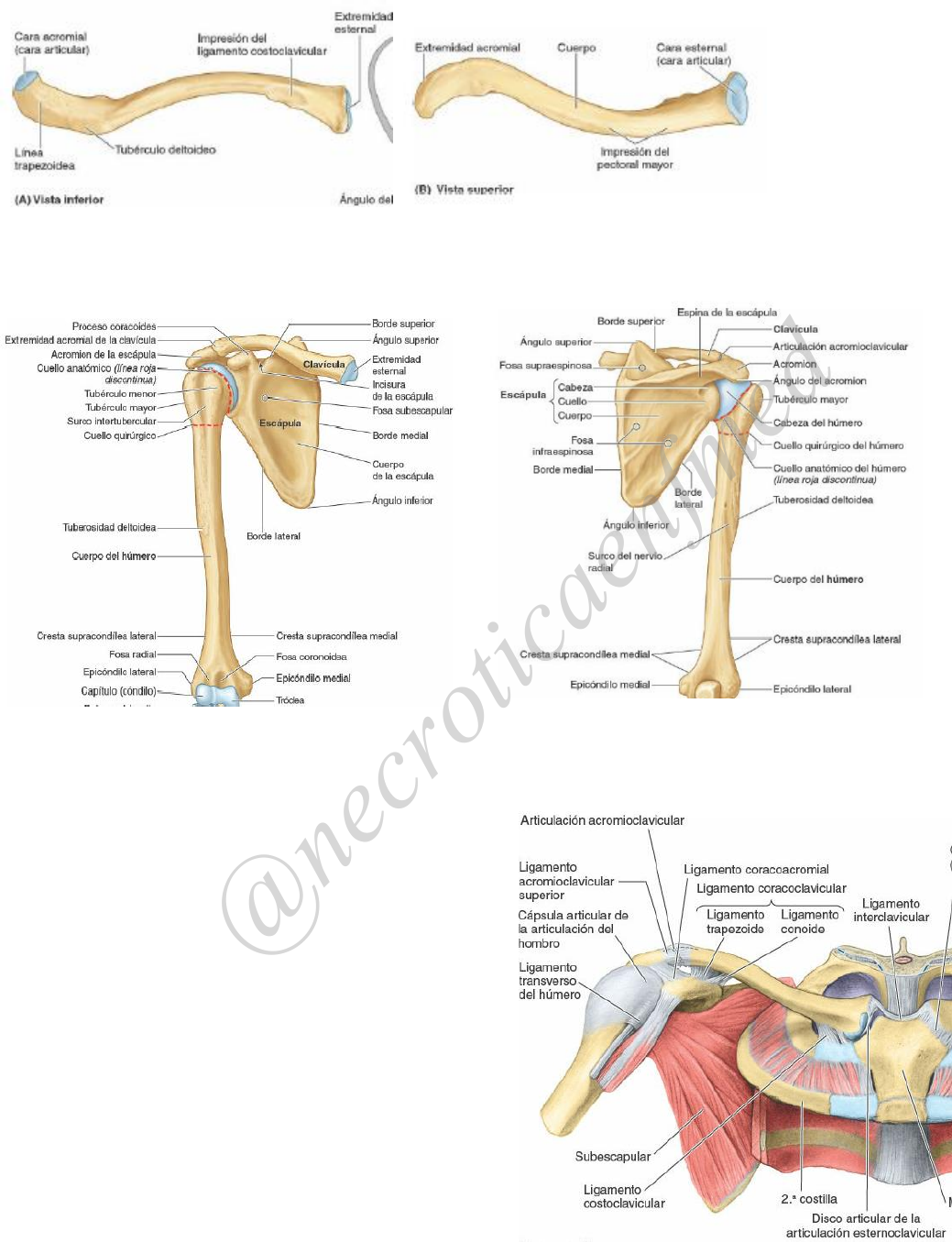 Miembro superior Huesos 1 Clavícula: Hueso plano alargado. Función de protección. Escápula: Hueso plano. Función de protección. Húmero: Hueso largo. Función de palanca Articulaciones Acromioclavicular o Tipo sinovial o Género Plana o Cápsula articular o Reforzada por fibras del trapecio o Movimiento de: desplazamiento de acromion o Ligamentos: acromioclavicular (sup e inf), coracoacromial, coracoclavicular (trapezoide/conoide) Esternoclavicular o COMPLEJA o Tipo sinovial o Género silla de montar o Cápsula articular-Disco articular o Dividido en dos compartimientos o Movimientos: elevación/desc, rotación, retracción/protacc. @ ne cr ot ica en fm ed Glenohumeral o Tipo sinovial o Género esferoide o Rodete glenoideo fibrocartilaginoso o Manguito rotador musculotendinoso o Cápsula articular : Aberturas entre tubérculos del húmero, inferior al proceso coracoides.Parte inferior más débil o Arco coracoacromial: estructura protectora osteoligamentosa o Bolsa subacromial: Facilita el movimiento del tendón supraespinoso o Movimientos: TODOS o Bolsas en torno: con líquido sinovial: Subescapular (Protege el tendón) y Subacromial Músculos Pectoral mayor Nervio (N) Pectoral MyL Aduce y Rota el húmero medialmente Tira de la escápula anterior e inferiormente Pectoral Menor N. Pectoral Medial Mismos movimientos que el mayor Subclavio N. Subclavio Desciende clavícula y la fija Serrato Anterior N. Torácico Largo Protrae y rota la escápula @ ne cr ot ica en fm ed Subescapular N. subescapular superior e inferior Rota medialmente el húmero y ayuda a la estabilidad del acromion. Posteriores Trapecio N. Accesorio Porción ascendente: desciende escápula Porción descendente: asciende la escápula Retrae escápula Elev. de la escápula- Romb. N. dorsal de la escápula y cervicales Eleva y rota escápula inclinando cavidad glenoidea inferiormente. Romboides Mym: N.Dorsal de la escápula. Al rotar desciende la cavidad glenoidea. Dorsal Ancho N. Coracodorsal Extiende, aduce y rota medialmente el húmero Eleva el cuerpo hacia los brazos al trepar Infraespinoso- Supraespinoso - Redondos Mym Infraespinoso: N. Supraescapular. Rota lateralmente Supraespinoso: N. Supraescapular. Inicia abducción del brazo. Redondo Mayor: N. Subescapular inf. Aduce y rota medial. Redondo Menor: N. Axilar. Rota lateral @ ne cr ot ica en fm ed Del Brazo Biceps N. Musculocutáneo Supina el brazo y al hacerlo flexiona el antebrazo Braquial N. Radial y N. Musculocutáneo Flexiona el antebrazo en todas las posiciones Coracobraquial N. Musculocutáneo Aduce el brazo y ayuda a flexionarlo Triceps N.Radial Principal extensor Deltoides (N. Axilar) Porción Clavicular Flexiona y rota el brazo medialmente Porción Acromial Abduce el brazo Porción Espinal Extiende y rota el brazo lateralmente Manguito de los rotadores Todos son rotadores del Húmero. Protegen u dan estabilidad a la articulación glenohumeral. - Supraespinoso - Infraespinoso - Subescapular - Redondo menor @ ne cr ot ica en fm ed Axila Centro de distribución fascial, piramidal, relleno de tejido adiposo. Da paso a los nervios, venas, arterias y linfáticos. Los nódulos linfáticos están distribuidos en grupos y reciben linda en un orden específico. Límites: Superior/Vértice (Conducto cervicoaxilar: vía de paso entre el cuello y la axila) : 1°Costilla, clavícula y borde superior de la escápula. Inferior (fosa de la axila): Fascia axilar. Anterior: Pectoral mayor (conforma el pliegue de la axila) y menor. Posterior: Subescapular, redondo mayor y dorsal ancho ( los dos últimos= Pliegue posterior). Medial: 1° a 4° costilla y serrato anterior. Lateral: Surco intertubercular del húmero Contenido: Envueltos en una extensión similar a una manga de la fascia cervical=Vaina axilar. Arteria axilar, Vena axilar, nódulos linfáticos axilares y plexo braquial (los fascículos). Huesos 2 Ulna y Radio: Largos. Función de palanca. Mano Carpo: Cortos. Falange y metacarpiano: Largos @ ne cr ot ica en fm ed Articulaciones Radioulnar Proximal o Tipo sinovial o Grupo Trocoide o Movimiento: Supinación y pronación Radioulnar Distal o Tipo sinovial o Genero trocoide o Movimiento: Desplazamiento (rotación) Radiocarpiana o Tipo sinovial o Género Elipsoidea o Mov: Flexoextensión, abducción- aducción. Interocarpiana o Tipo sinovial o Genero Plana Del Pisiforme (mediocarpianas) Carpometacarpana e intermetacarpiana o Tipo sinovial o Género plana o Mov. débiles Del Pulgar o Tipo sinovial o Género Silla de montar o Mov. Múltiples Mateacarpofalángicas o Tipo Sinovial o Género Elipsoidea o Mov. Flexoextensión y abducción/aducción Interfalángicas o Tipo sinovial o Género troclear o Mov. Flexoextensión. o @ ne cr ot ica en fm ed Del codo o Tipo Sinovial o Genero Troclear (Humeroulnar: Troclear Humeroradial: Elipsoidea- Radioulnar: Trocoide) o Diartrosis o Mov. Flexoextensión: Pronación/Supinación o Irrigación por anastomosis o Inervación: Nervios- Musculocutáneo, Radial y Ulnar Músculos Antebrazo. Anteriores (de lateral a medial) Superficiales Intermedios Profundos N. Mediano Pronador redondo: Prona y flexiona Flexor radial del carpo: Abduce y flexiona Palmar largo: Tensa y flexiona N. Ulnar Flexor ulnar del carpo: Aduce y flexiona N. Mediano Flexor superficial de los dedos N. Interóseo ant. del N. Mediano Pronador cuadrado Flexor largo del pulgar Flexor profundo de los dedos (medial=N. Ulnar) @ ne cr ot ica en fm ed Posteriores Superficiales N. Radial Braquioradial: Flexiona (débilmente si está estirado) Extensor radial largo del carpo: + abduce Ramo profundo del N. Radial Extensor radial corto del carpo:+ abduce Extensor de los dedos Extensor del meñique Extensor ulnar del carpo: + aduce Ancóneo: ayuda a tríceps a extender, estabiliza art. de codo, abduce ulna durante la pronación. (N. Radial) Profundos Ramo profundo del N. Radial Supinador Abductor largo del pulgar: + Extiende Extensor corto del pulgar Extensor largo del pulgar: extiende 