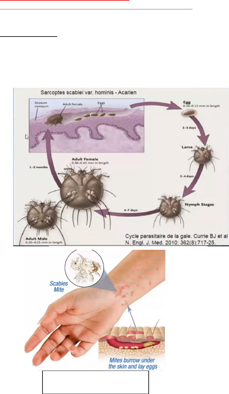 Isabela Bulhões Sthefanny Guedes 1 AULAS DE DERMATOLOGIA (2021) – PROVA 2 AULA 1 – DERMATOSES ZOOPARASITÁRIAS (Profa Danielle Bonatto) - Dermatozooses são infestações causadas por ácaros e insetos - Envolve a dermatologia sanitária ESCABIOSE (SARNA) - É causada pelo ácaro Sarcoptes scabiei, variante hominis. - Transmitida por contato pessoal - Sem preferência por sexo, idade ou raça - Parasito completa ciclo biológico dentro do hospedeiro. Fora do hospedeiro o ácaro morre em menos de 1 semana. - Macho não invade a pele e morre após a cópula - Fêmea fecundada penetra na camada córnea da pele e escava um túnel. Ela deposita 2 a 3 ovos por dia, durante algumas semanas. > Os ovos depositados vão se tornar larvas hexápodes, que se transformam em linfas octópodes e, por último, em ácaro adulto > Ciclo completo (ovo ao adulto) dura em média 2 semanas - Após a fecundação, a fêmea cava novos sulcos na pele - O sintoma mais importante é o prurido noturno intenso - Na semiologia, devemos considerar 3 fatores: sulco, distribuição das lesões, lesões secundárias - Sulco: pequena saliência, apresenta em uma das extremidades uma vésico-pápula (cabeça da fêmea do ácaro) - Distribuição: Espaços interdigitais mãos, punhos, axilas, nádegas, mamas, pênis > Em crianças, palmo-plantar e couro cabeludo - Lesões secundárias: ocorrem devido ao fato de as lesões da escabiose serem muito pruriginosas > Escoriações > Impetigo: abre-se uma porta de entrada para uma infecção bacteriana > Foliculite ou furúnculo. LESÃO CARACTERÍSTICA - Pápulas, vesículas e escoriações Isabela Bulhões Sthefanny Guedes 2 ESCABIOSE NODULAR - Lesões pápulo-nodulares maiores e muito comuns na região genital (pênis e bolsa escrotal) - Essas lesões são resultado de uma reação de hipersensibilidade à degradação do parasita - Muitas vezes, o paciente já está tratado e ele persiste com lesões nodulares ESCABIOSE CROSTOSA (SARNA NORUEGUESA) - É causada pelo mesmo parasita - Lesões exuberantes e verrucosas: em mãos, pés, face > Semelhantes à psoríase - Eritema e descamação em face e tronco - A lesão é altamente contagiosa (todo tipo de escabiose é, mas a forma crostosa é muito!!) - É comum ocorrer surtos em alas de hospitais e casas de repouso - Supressão da resposta celular T – por isso manifesta-se na forma crostosa - Acomete, principalmente, imunodeprimidos (HIV, transplantados), desnutridos, idosos (comum em casas de repouso) - Se um imunocompetente entrar em contato com um paciente com sarna crostosa, ele irá desenvolver a escabiose clássica As lesões em espaços interdigitais são muito características. Então, é importante, em um paciente com prurido, examinar punho, espaços interdigitais e região inframamária - Nas crianças, devemos lembrar da região palmo-plantar e facial - A observação do túnel é rara! Isabela Bulhões Sthefanny Guedes 3 - Pele espessada, com lesões descamativas ou crostosas - Geralmente, idosos acamados não apresentam prurido ou apresentam prurido muito leve, o que dificulta o diagnóstico. DIAGNÓSTICO - Clínico!!! > Realiza-se o diagnóstico por meio da observação de lesões escoriadas, pápulas e vesículas – principalmente, em região interdigital, punho e região inframamária - Prurido, familiares, pessoas mesmo domicílio - Biópsia cutânea > Geralmente, não é realizada, porque demora em torno de 15 dias para a obtenção de resultado > Em casos de escabiose norueguesa ou em situações de difícil diagnóstico, pode-se realizar biópsia - Exame direto: visualização do ácaro no material raspado a microscopia (é mais rápida) TRATAMENTO - Permetrina 5% > Aplicar em todo corpo e deixar mínimo 8 horas > Não pode ser usada na gestação > Utilizada em crianças sem peso ou idade adequados para o uso de Ivermectina - Enxofre precipitado 5 a 10% (diluído em vaselina); > Primeira linha na gestação, aleitamento ou crianças a partir 1 mês > Aplicar por 24 horas, durante 3 dias consecutivos - Ivermectina (Revectina 6mg) > Tratamento mais utilizado (praticidade) > 200ug/kg dose única, repetir em 7 dias (usada crianças acima de 5 anos e de 15kg) - Tratar toda a família e os contactantes, mesmo sem sintomas - Evitar efeito "ping-pong" > Trata-se o doente, mas outro familiar não tratado contamina novamente os contactantes - Lavar roupas separadamente e passar com ferro quente - Pode-se isolar as roupas por 1 semana, visto que o ácaro não sobrevive mais do que esse tempo fora do hospedeiro - Por sensibilização, pode permanecer com prurido persistente ou nódulos > Tratamento com anti-histamínico e corticoide tópico > Se nódulos grandes na região genital, fazer infiltração de corticoide Isabela Bulhões Sthefanny Guedes 4 PEDICULOSE - Anaplura ou piolhos > Ectoparasitos pequenos > Parasitam o couro cabeludo e o corpo - 3 tipos de pediculose > Piolho da cabeça (Pediculus humans capitis) > Piolho do corpo (Pediculus humans corporis) = muquirana > Piolho pubiano (Phitirus pubis) = chato - Piolhos medem 2,1-3,6mm - Macho maior que a fêmea. PEDICULOSE DO COURO CABELUDO - A pediculose de couro cabeludo sempre deve estar no diagnóstico diferencial de qualquer forma de prurido – tanto no couro cabeludo, quanto na região occipital - Sugerida pela presença de prurido - Confirmada pela presença de ovos (lêndeas) ao exame clínico. > Lêndeas esbranquiçadas, aderentes a haste do cabelo - Encontro do parasita é mais difícil ao exame. - Transmissão: > Pelo contato pessoal (direto) dos indivíduos infestados. > Uso coletivo de utensílios como: pentes, bonés, travesseiros, lenços de cabeça, presilhas, almofadas, chapéus. - O parasita se alimenta de sangue humano e vive em torno de 30 dias - A fêmea deposita seus ovos (lêndeas) presos ao fio do cabelo > Deposita até 300 ovos durante a sua vida - Uma lêndea leva cerca de 10 dias para sair do ovo - O piolho chega a 3mm e vive até 4