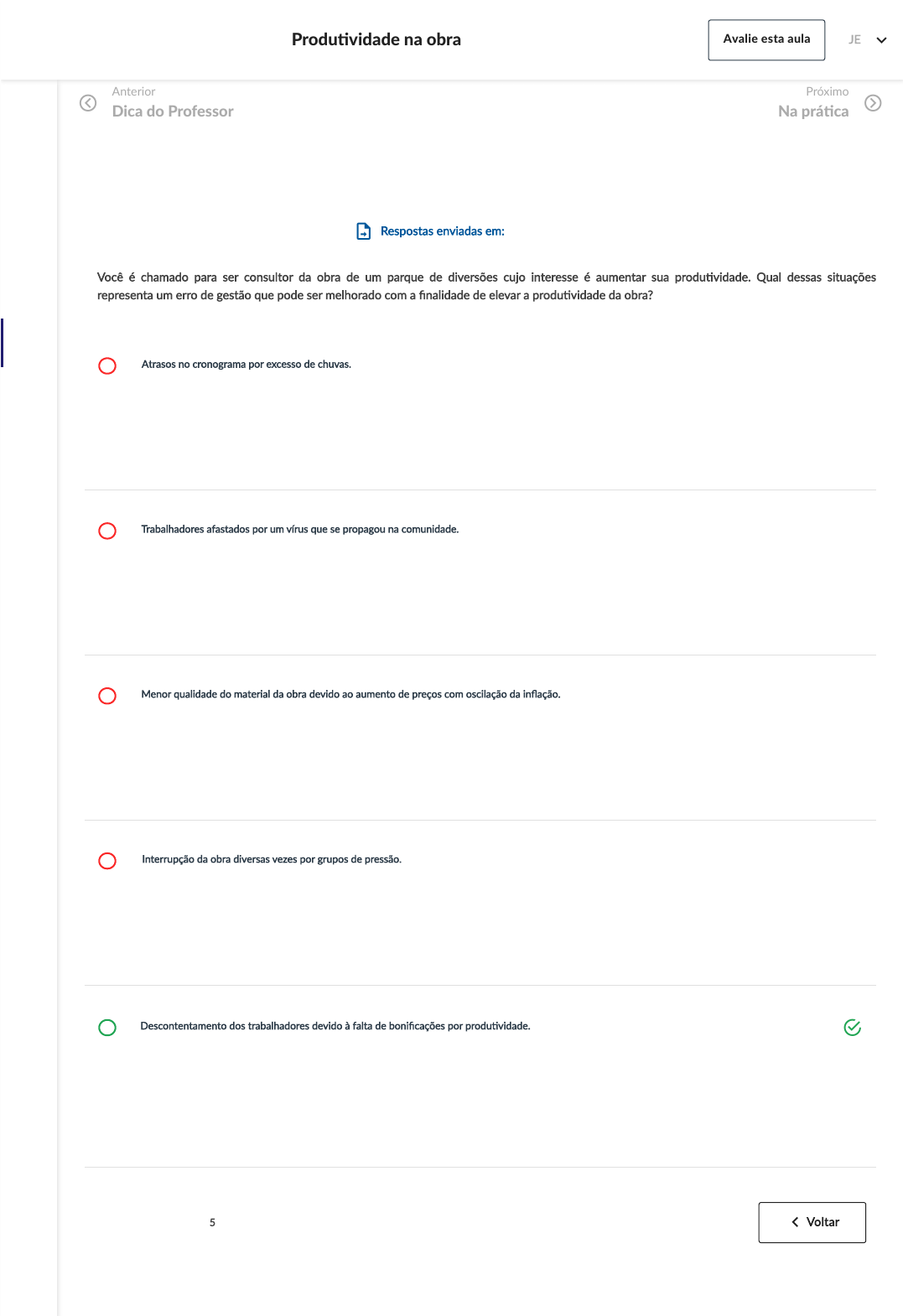Exercícios Respostas enviadas em: 28/03/2022 15:21 5. Você é chamado para ser consultor da obra de um parque de diversões cujo interesse é aumentar sua produ�vidade. Qual dessas situações representa um erro de gestão que pode ser melhorado com a finalidade de elevar a produ�vidade da obra? Resposta incorreta. A. Atrasos no cronograma por excesso de chuvas. Os fatores externos à obra não podem ser controlados pelos gestores, como o clima, taxas de juros e doenças, entre outros. A gestão de obras inclui administrar pessoas e assegurar, mais do que ter material e equipamentos dentro do canteiro, que os trabalhadores estejam sa�sfeitos com seu trabalho e o ambiente seja agradável. Resposta incorreta. B. Trabalhadores afastados por um vírus que se propagou na comunidade. Os fatores externos à obra não podem ser controlados pelos gestores, como o clima, taxas de juros e doenças, entre outros. A gestão de obras inclui administrar pessoas e assegurar, mais do que ter material e equipamentos dentro do canteiro, que os trabalhadores estejam sa�sfeitos com seu trabalho e o ambiente seja agradável. Resposta incorreta. C. Menor qualidade do material da obra devido ao aumento de preços com oscilação da inflação. Os fatores externos à obra não podem ser controlados pelos gestores, como o clima, taxas de juros e doenças, entre outros. A gestão de obras inclui administrar pessoas e assegurar, mais do que ter material e equipamentos dentro do canteiro, que os trabalhadores estejam sa�sfeitos com seu trabalho e o ambiente seja agradável. Resposta incorreta. D. Interrupção da obra diversas vezes por grupos de pressão. Os fatores externos à obra não podem ser controlados pelos gestores, como o clima, taxas de juros e doenças, entre outros. A gestão de obras inclui administrar pessoas e assegurar, mais do que ter material e equipamentos dentro do canteiro, que os trabalhadores estejam sa�sfeitos com seu trabalho e o ambiente seja agradável. Você acertou! E. Descontentamento dos trabalhadores devido à falta de bonificações por produ�vidade. Os fatores externos à obra não podem ser controlados pelos gestores, como o clima, taxas de juros e doenças, entre outros. A gestão de obras inclui administrar pessoas e assegurar, mais do que ter material e equipamentos dentro do canteiro, que os trabalhadores estejam sa�sfeitos com seu trabalho e o ambiente seja agradável. 5 de 5 perguntas Voltar Anterior Dica do Professor Próximo Na prá�ca Produ�vidade na obra Avalie esta aula JE