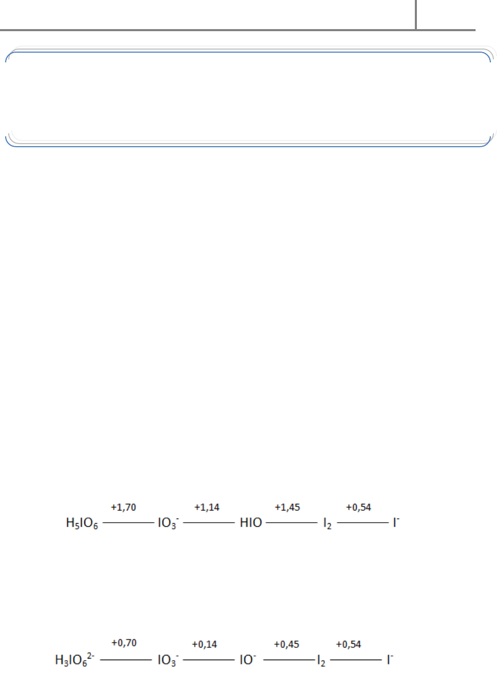 Laboratório de Química dos Elementos – QUI081 2017 60 O Iodo é um sólido negro e lustroso com leve brilho metálico, sendo encontrado na natureza sob forma de vários compostos concentrados em pequenas proporções (por volta de 1 e 50 mg/kg) na água salgada do mar, em forma de iodeto de sódio (NaI) além de estar presente nos compostos petrolíferos em forma de iodeto de potássio (KI). Além de ser extraído industrialmente desses locais (água salgada e veios petrolíferos) é também obtido como subproduto do processamento do chamado "Salitre do Chile", onde faz-se presente na forma de iodato de sódio (NaIO3). O iodo é um sólido altamente volátil em temperatura ambiente. O iodo é essencial para a síntese dos hormônios tireoidianos que irão regular as funções do organismo, sua deficiência pode levar ao bócio e seu excesso pode causar intoxicação. As reações de oxirredução constituem parte importante da química do iodo devido à sua variedade de estados de oxidação. Diagrama de Latimer, em meio ácido, a 25ºC, para o Iodo Diagrama de Latimer, em meio básico, a 25ºC, para o Iodo GRUPO 17 A QUÍMICA DO IODO – Parte 1 http://www.infoescola.com/elementos-quimicos/iodo/ http://www.infoescola.com/elementos-quimicos/iodo/ http://www.infoescola.com/elementos-quimicos/potassio/ Laboratório de Química dos Elementos – QUI081 2017 61 PARTE EXPERIMENTAL Procedimento 1: IDENTIFICAÇÃO QUALITATIVA DO IODO a. Em um tubo de ensaio, adicionar um ou dois cristais de iodo e acrescentar cerca de 3 mL de água destilada. Triturar os cristais até observar uma ligeira coloração amarela da solução. b. Após, acrescentar duas gotas de amido. Verificar as alterações ocorridas no sistema. OBS: O AMIDO, um polímero de fórmula (C6H10O5)n, é um pó ou granulado branco, insípido e inodoro, insolúvel em água fria ou álcool. A estrutura molecular do amido é fruto da combinação de dois polissacarídeos, a amilose e a amilopectina. Fórmula estrutural da Amilose Fórmula estrutural da Amilopectina Objetivos desta prática: 1. Identificar qualitativamente o iodo. 2. Realizar algumas reações com o íon iodeto. 3. Realizar algumas reações com o íon iodato. http://www.google.com.br/url?sa=i&rct=j&q=&esrc=s&source=images&cd=&cad=rja&uact=8&ved=0CAcQjRw&url=http%3A%2F%2Fpt.wikipedia.org%2Fwiki%2FAmido&ei=MANmVbKtJ8fgoASms4CwCg&bvm=bv.93990622,d.aWw&psig=AFQjCNGlP1h0fQJ0UT2T9Y_M_A4ha2WanQ&ust=1432835182765565 http://www.google.com.br/url?sa=i&rct=j&q=&esrc=s&source=images&cd=&cad=rja&uact=8&ved=0CAcQjRw&url=http%3A%2F%2Fpt.wikipedia.org%2Fwiki%2FAmido&ei=MANmVbKtJ8fgoASms4CwCg&bvm=bv.93990622,d.aWw&psig=AFQjCNGlP1h0fQJ0UT2T9Y_M_A4ha2WanQ&ust=1432835182765565 Laboratório de Química dos Elementos – QUI081 2017 62 A coloração azul intensa ocorre devido à formação de um complexo formado pela oclusão (aprisionamento) do iodo nas cadeias lineares da amilose. Como a amilopectina não apresenta estrutura helicoidal, devido à presença das ramificações, a interação com o iodo será menor, e a coloração menos intensa. Procedimento 2: REAÇÕES DO ÍON IODETO EXPERIMENTO 1 a. Em um tubo de ensaio, adicionar 1 mL de solução de iodeto de potássio e dois cristais de iodo (solução de lugol). Observar a coloração da mistura. b. Após, adicionar duas gotas de amido. Observar a coloração da solução comparando-a com a cor observada no tubo do procedimento anterior (procedimento 1). OBS: O lugol ou solução de lugol é uma solução de I2 em equilíbrio com I-. http://pt.wikipedia.org/wiki/Solu%C3%A7%C3%A3o http://pt.wikipedia.org/wiki/Iodo http://pt.wikipedia.org/wiki/Iodeto_de_pot%C3%A1ssio Laboratório de Química dos Elementos – QUI081 2017 63 A molécula de iodo é pouco solúvel em água por ser apolar, porém é muito solúvel em solventes não polares tais como o clorofórmio, benzeno, hexano e em álcoois de cadeia curta originando uma solução violeta. Na presença de soluções aquosas que já contenham íons iodeto, o iodo molecular se torna solúvel e uma solução marrom escura se forma devido à formação de espécies I3 - (aq) (íons triiodeto). O iodeto de potássio é adicionado para aumentar a solubilidade do iodo levando a formação do ânion I3-. EXPERIMENTO 2 a. Em um tubo de ensaio, adicionar 5 gotas de solução de nitrato de prata 0,1 mol/L. b. Após, adicionar 2 gotas de solução de iodeto de potássio 0,1 mol/L. Verificar as alterações ocorridas no sistema. EXPERIMENTO 3 a. Em um tubo de ensaio, adicionar 1 mL de solução de iodeto de potássio 0,1 mol/L e 1 mL de amido. b. Após, adicionar duas gotas de solução alvejante comercial (água sanitária = NaCl0 a 5% ). Verificar as alterações ocorridas no sistema. c. Em seguida, continuar acrescentando, gota a gota, solução alvejante até produzir-se uma segunda variação de cor no sistema. Quais alterações foram verificadas? Represente a reação química ocorrida. Laboratório de Química dos Elementos – QUI081 2017 64 Quais alterações foram verificadas no item “b”? Represente a semi-reações de oxidação e redução ocorridas no item “b”. Represente, ainda, a reação global. (Reação I) Calcule a variação do potencial da reação (ΔE). Quais alterações foram verificadas no item “c”? Represente a semi-reações de oxidação e redução ocorridas no item “c”. Represente, ainda, a reação global. (Reação II) Calcule a variação do potencial da reação (ΔE). Laboratório de Química dos Elementos – QUI081 2017 65 EXPERIMENTO 4 a. Em um tubo de ensaio, adicionar 2 mL de solução de iodeto de potássio 0,1 mol/L. b. A seguir, adicionar no mesmo tubo de ensaio 10 gotas de solução de cloreto férrico 0,2 mol/L. Observar as alterações no sistema. c. Em seguida, adicionar 2 mL de hexano e agitar vigorosamente. Observe a cor da fase orgânica. d. Para efeito de comparação, em um outro tubo de ensaio, adicione 2 mL de hexano e um a d