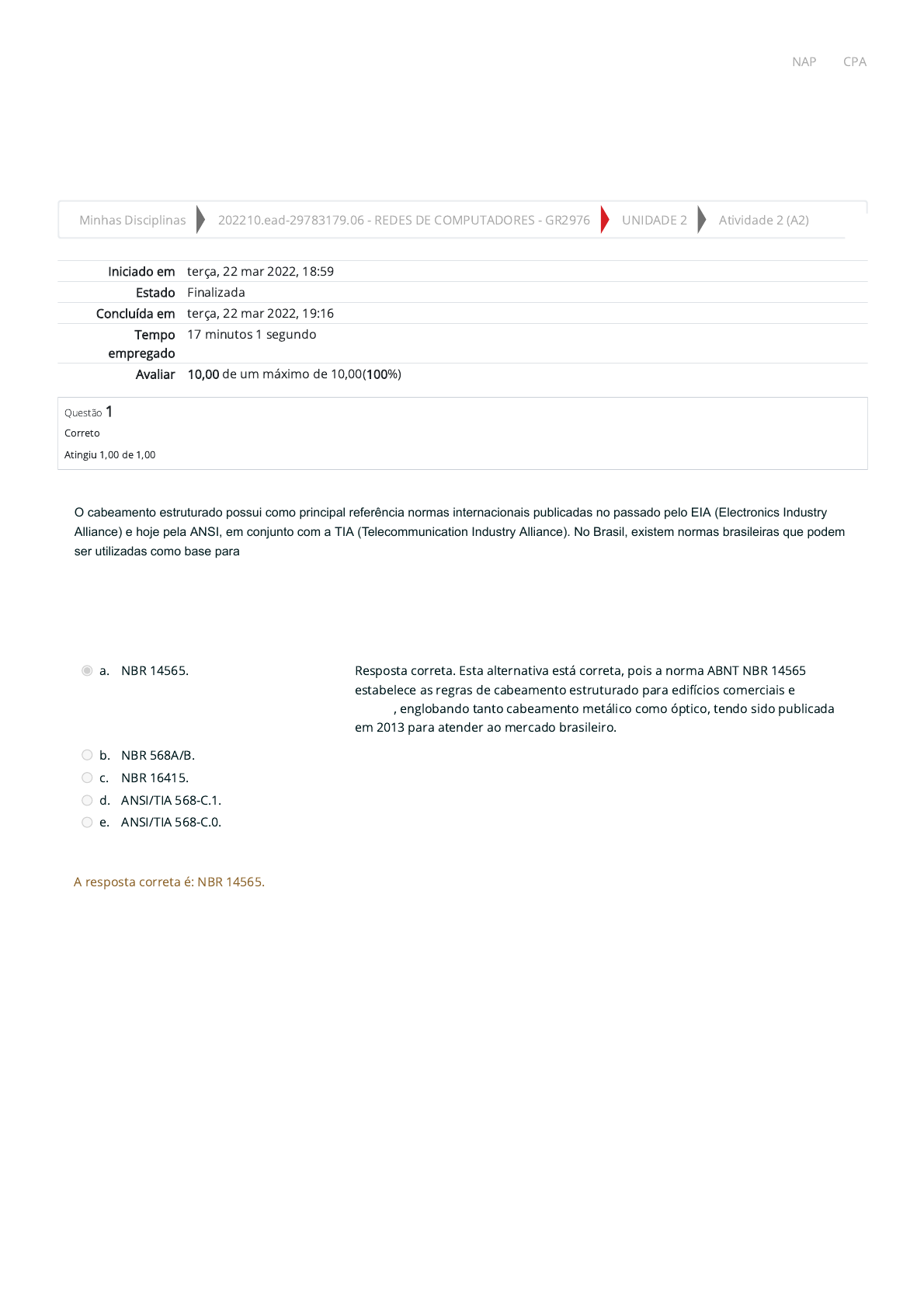 22/03/22, 19:16 Atividade 2 (A2): Revisão da tentativa https://ambienteacademico.com.br/mod/quiz/review.php?attempt=119210&cmid=152582 1/8 Minhas Disciplinas 202210.ead-29783179.06 - REDES DE COMPUTADORES - GR2976 UNIDADE 2 Atividade 2 (A2) Iniciado em terça, 22 mar 2022, 18:59 Estado Finalizada Concluída em terça, 22 mar 2022, 19:16 Tempo empregado 17 minutos 1 segundo Avaliar 10,00 de um máximo de 10,00(100%) Questão 1 Correto Atingiu 1,00 de 1,00 O cabeamento estruturado possui como principal referência normas internacionais publicadas no passado pelo EIA (Electronics Industry Alliance) e hoje pela ANSI, em conjunto com a TIA (Telecommunication Industry Alliance). No Brasil, existem normas brasileiras que podem ser utilizadas como base para o projeto e a instalação de cabeamento estruturado em prédios e data centers. Dentro do contexto do cabeamento estruturado, assinale a alternativa correta sobre a norma brasileira utilizada para edifícios comerciais e data centers. a. NBR 14565. Resposta correta. Esta alternativa está correta, pois a norma ABNT NBR 14565 estabelece as regras de cabeamento estruturado para edifícios comerciais e data centers, englobando tanto cabeamento metálico como óptico, tendo sido publicada em 2013 para atender ao mercado brasileiro. b. NBR 568A/B. c. NBR 16415. d. ANSI/TIA 568-C.1. e. ANSI/TIA 568-C.0. A resposta correta é: NBR 14565. NAP CPA https://ambienteacademico.com.br/my/ https://ambienteacademico.com.br/course/view.php?id=6039 https://ambienteacademico.com.br/course/view.php?id=6039§ion=4 https://ambienteacademico.com.br/mod/quiz/view.php?id=152582 https://outlook.office365.com/owa/calendar/NAPFMU@unifmubr.onmicrosoft.com/bookings/ https://codely-fmu-content.s3.amazonaws.com/Moodle/CPA/landing_CPA/index.html 22/03/22, 19:16 Atividade 2 (A2): Revisão da tentativa https://ambienteacademico.com.br/mod/quiz/review.php?attempt=119210&cmid=152582 2/8 Questão 2 Correto Atingiu 1,00 de 1,00 Questão 3 Correto Atingiu 1,00 de 1,00 Um analista técnico da equipe de TI está realizando testes de um novo software e decide conectar dois computadores antigos diretamente para uma verificação de funcionalidade de comunicação de dados. Os dois computadores apresentam placas de rede com entrada para cabos com conectores RJ-45. Assinale a alternativa correta sobre o tipo ideal (menor risco de erros) de cabo para este teste. a. Cabo par trançado crossover. Resposta correta. Esta alternativa está correta, pois o cabo par trançado crossover permite a interligação de dois computadores através de conectores do tipo RJ-45. O cruzamento dos �os de transmissão e recepção do cabo permite a comunicação direta entre os computadores sem elementos de rede. b. Cabo par trançado direto. c. Cabo coaxial. d. Cabo de �bra óptica monomodo. e. Cabo de �bra óptica multimodo. A resposta correta é: Cabo par trançado crossover. O modelo de referência OSI é baseado em sete camadas, sendo que cada uma é responsável ao menos por uma função específica. Desde a interação com o usuário até a transmissão dos dados de camadas superiores, o modelo OSI permite que protocolos sejam implementados de forma a assegurar uma interoperabilidade entre equipamentos de diferentes fornecedores, Assinale a alternativa correta que representa a principal função da camada de rede. a. responsável pelo estabelecimento de uma conexão para a comunicação entre usuários denominada sessão. b. Responsável pela transformação de um canal de transmissão normal em uma linha que pareça livre de erros de transmissão. c. Responsável pela transmissão dos bits pelo canal de transmissão, formatando-os de acordo com o tipo de sinal. d. Responsável pela condução dos dados ao longo da rede, determinando a maneira como serão roteados da origem até o destino. Resposta correta. Esta alternativa está correta, pois a camada de rede atua no encaminhamento dos pacotes de dados em uma rede, processando o roteamento ao longo da rede através de elementos comutadores de pacotes desde a transmissão pela origem até o destino. e. Responsável pelo transporte dos dados de host para host de forma con�ável e e�ciente, utilizando processo de segmentação. A resposta correta é: Responsável pela condução dos dados ao longo da rede, determinando a maneira como serão roteados da origem até o destino. NAP CPA https://outlook.office365.com/owa/calendar/NAPFMU@unifmubr.onmicrosoft.com/bookings/ https://codely-fmu-content.s3.amazonaws.com/Moodle/CPA/landing_CPA/index.html 22/03/22, 19:16 Atividade 2 (A2): Revisão da tentativa https://ambienteacademico.com.br/mod/quiz/review.php?attempt=119210&cmid=152582 3/8 Questão 4 Correto Atingiu 1,00 de 1,00 Questão 5 Correto Atingiu 1,00 de 1,00 Leia o excerto a seguir. “[...] foi criado o cabo coaxial em que um dos fios é uma malha de cobre isoladora de induções eletromagnéticas. O cabo coaxial, devido à sua estrutura, permite a passagem de uma faixa de frequências bem maior do que os fios de cobre trançados. Desta forma, obtêm-se maior velocidade na transmissão de dados e um alcance maior em relação aos fios e cabos comuns”. SOUSA, L. B. Redes de computadores: guia total. São Paulo: Érica, 2009. Dentro do contexto de cabo coaxial, assinale a alternativa correta que indica o cabo coaxial adequado para a transmissão de dados digitais em uma rede de computadores. a. Cabo coaxial de malha de cobre de 50 ohms. Resposta correta. Esta alternativa está correta, pois o cabo coaxial com malha de cobre de 50 ohms é o adequado para redes de computadores para a comunicação de dados, permitindo uma velocidade de 10 Mbps a uma frequência de 2 GHz. Este cabo também é conhecido como cabo coaxial �no ou de banda base. b. Cabo coaxial de malha de cobre de 100 ohms. c. Cabo coaxial de malha de cobre de 75 ohms. d. Cabo coaxial de malha de cobre de 10 ohms . e. Cabo coaxial de malha de cobre de 25 ohms. A resposta correta