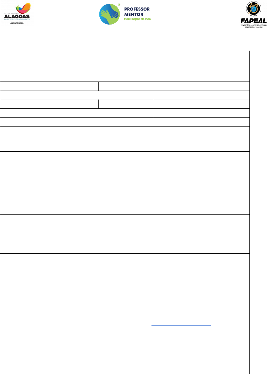 ANEXO VI - CARTA DE INTENÇÃO CARTA DE INTENÇÃO I – DADOS DO SERVIDOR 1. Nome Completo: Raqueline de Souza Silva Santos 2. CPF:589.006 3. RG/Órgão expedidor: 4. Endereço residencial: 5.E-mail: 6.Tel.:( ) 7. WhatsApp:( ) 8. Município: 9.Gere: 9ª ESTUDANTE MONITOR INDICADO: Explicitar critérios e pressupostos utilizados para fazer a indicação do Estudante Monitor da Turma: 1 - Como sua experiência profissional está relacionada às atribuições e perfis estratégicos para atuar como professor mentor de estudantes, conforme os eixos PROJETO DE VIDA, ENGAJAMENTO E TERRITÓRIO, COMPETÊNCIAS SOCIOEMOCIONAIS, RECOMPOSIÇÃO E APOIO À APRENDIZAGEM, FAMÍLIA, DIVERSIDADES? 2 - Como você pretende contribuir com a melhoria da qualidade do ensino na Unidade que você atua, a partir da execução de atividades estratégicas de mentoria dos estudantes? Declaro que, conforme o presente edital, atendo os critérios abaixo assinalados: (a) ser professor efetivo ou temporário na rede estadual de ensino; (b) estar em atividade em sala de aula no período de desenvolvimento do projeto; (c) ser professor em atividade de turmas da “educação infantil”; “anos iniciais do ensino fundamental”; “anos finais do ensino fundamental”; “ensino médio”; “EJA fundamental” ou “EJA médio” e inserido no Sistema de Gestão da Educação de Alagoas - SAGEAL/2021; (d) disponibilidade para dedicar 20 horas semanais às atividades do Projeto; (e) possuir currículo atualizado na plataforma Lattes (https://lattes.cnpq.br/). Declaro desenvolver os preceitos e orientações do Programa Professor Mentor, Meu projeto de Vida, conforme orientações da SEDUC/AL e FAPEAL, bem como estou ciente das responsabilidades pelas declarações prestadas, assim firmo a presente declaração na cidade de Penedo em ____de __________ de 2022. _____________________________________________ Assinatura do Servidor CPF: