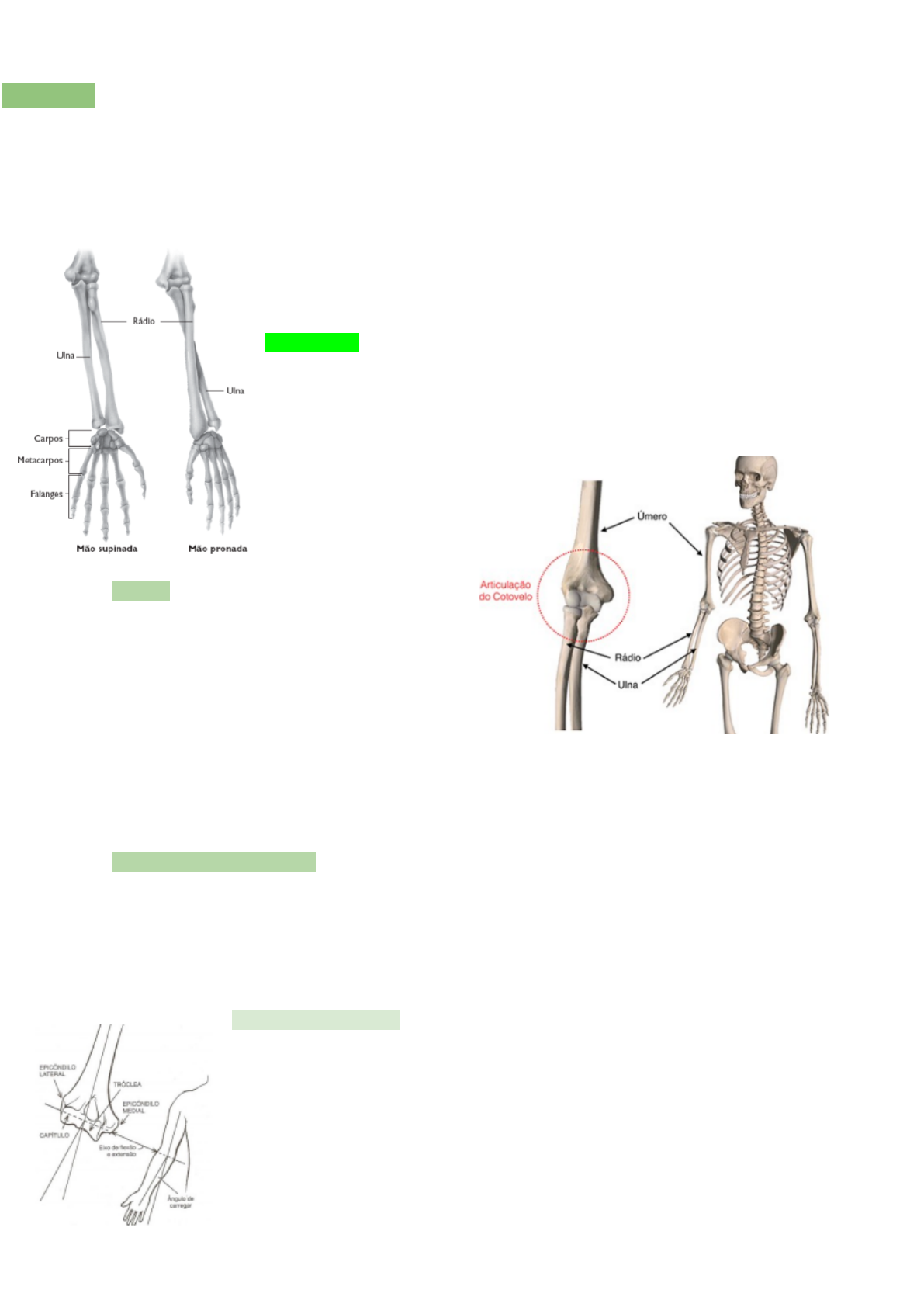 Carolina Pithon Rocha | Medicina | 4o semestre 1 Cotovel�, Punh� � Mã� Cotovelo -> quebra e nunca fica 100% Punho -> + quebra Mão -> mais delicada COTOVELO articulação em dobradiça - só movimento de flexão e extensão é uma articulação estável classificada como uma articulação trocogínglima que contém 3 articulações dentro de uma cápsula articular: articulação umeroulnar, radioumeral e radioulnar proximal Ossos: estruturas palpáveis, epicondilos e processos de olécrano Cabeça do rádio - impalpáveis fossa do olécrano - articulação principal do cotovelo tróclea capítulo do úmero chanfradura troclear processo coronóide da ulna colo do rádio tuberosidade radial Articulação umerorradial - em dobradica -> tróclea do úmero se articula com a fossa troclear da ulna é imediatamente lateral à articulação umeroulnar e é formada entre o esférico capítulo do úmero e a extremidade proximal do rádio. Embora a articulação umerorradial seja classificada como uma articulação plana, a articulação umeroulnar imediatamente adjacente restringe o movimento ao plano sagital. Eixo de movimento: representado por uma linha através do centro da tróclea e do capítulo epicondilo medial - troclea lateral - capitulo Carolina Pithon Rocha | Medicina | 4o semestre 2 temos 3 ângulos valgo fisiológico do cotovelo em extensão que faz um ângulo de 15 a 16 graus que fazem o movimento dinâmico desse cotovelo. desvio varo sempre será patológico com necessidade patológica Ângulo de carregar - ângulo observado no seu exame físico (desvio lateral ou valvo) ângulo observado quando o cotovelo é extendido, onde se observa que o antebraço supinado desvia-se lateralmente. Mais pronunciado nas mulheres. Foi sugerido que ele serviria para manter afastados do corpo os objetos carregados na mão. Mas nenhuma função foi realmente confirmada. Articulação radioulnar (não é dobradica) está articulação permite que o rádio rode em relação a ulna, passando de uma posição paralela para cruzada; rádio faz movimento circular em volta da ulna; a mão acompanha os movimentos do rádio Eixo de movimento: passa por uma linha através do centro da cabeça do rádio proximalmente e através do centro da cabeça de ulna distalmente Rádio paralelo a ulna -> FALSO Articulação radioulnar distal (fica no punho más funcionalidade no cotovelo) a superfície articular do rádio é côncava de tal modo que o rádio gira em torno da cabeça da ulna e é interposta por um disco articular Articulação radioulnar proximal (cotovelo - dentro da cápsula articular) fica dentro da cápsula articular do cotovelo e é do tipo pivô (trocóide); o lado da cabeça do rádio articula-se como a chanfradura radial da ulna; o ligamento anular fibroso forma um anel em torno da cabeça do rádio, permite a rotação transversa e impede movimentos em outra direção cabeça do rádio -> intra articular epicondilo medial -> extra Amplitude de movimento (ADM) a flexão em média é de 145o (120 a 160) a sensação final pode ser macia (músculos do braço e antebraço) ou dura (processo coronóide da ulna com fossa coronóide do úmero) extensão é de 0o graus sensação final é dura (processo olécrano da ulna com fossa olecraniana do úmero) hiperextensión 0-10o flexão ativa 145o flexão passiva 160o flexores do cotovelo: braquial, bíceps braquial, braquiorradial -> nervo que inerva sozinho esses músculos -> musculocutâneo e o último radial Carolina Pithon Rocha | Medicina | 4o semestre 3 extensores do cotovelo: tríceps braquial, ancôneo outros: pronador redondo, extensores radiais longos e curto do carpo músculos supinadores: bíceps braquial, supinador, abdutor longo do polegar, extensor curto do polegar e extensor próprio do indicador músculos pronadores: pronador redondo, quadrado, flexor radial do capo, palmar longo e extensor radial longo do carpo sequela no punho -> problema no cotovelo artrodese neutro prono supino só um -> levemente neutro posição para bilateral -> um prono e um supino posição neutra (no meio entre a pronação completa e a supinação) Carolina Pithon Rocha | Medicina | 4o semestre 4 PUNHO capitato (central) e escafóide (pouco vascularizado, fratura passa sem diagnóstico) articulação: rádio-ulnar distal e rádio cárpica A maioria dos movimentos do punho ocorre na articulação radiocarpal, uma articulação condiloide em que o rádio se articula com os ossos escafoide, semilunar e piramidal. A articulação permite movimentos no plano sagital (flexão, extensão e hiperextensão) e movimentos no plano frontal (desvio radial e desvio ulnar), bem como a circundução. extensores chuta radial flexores chuta mediano Flexão músculos são o M. flexor radial do carpo e o poderoso M. flexor ulnar do carpo. O M. palmar longo, que está frequentemente ausente no antebraço em um ou em ambos os Carolina Pithon Rocha | Medicina | 4o semestre 5 lados, contribui para a flexão, quando ele está presente. Os três músculos têm origem no epicôndilo medial do úmero. Extensão e hiperextensão A extensão e a hiperextensão do punho resultam da contração do M. extensor radial longo do carpo, do M. extensor radial curto do carpo e do M. extensor ulnar do carpo. Esses músculos se originam no epicôndilo lateral do úmero. anterior - volar (palma da mão) superior - dorsal (conseguimos ver as unhas) músculos supinadores: bíceps braquial; supinador; abdutor longo do polegar; extensor curto do polegar; extensor próprio do indicador músculos pronadores: pronador redondo, pronador quadrado, flexor radial do carpo, palmar longo e extensor radial longo do carpo bíceps músculo que sai lá do ombro e interfere no cotovelo -> por que a sua inserção, o seu final o rabo estar no rádio -> permitindo a contratação da articulação rádio ulnar MÃO paciente com lesão neurológica consegue ver as pregas da mão? -> NÃO região tenar e hipotenar -> ab
