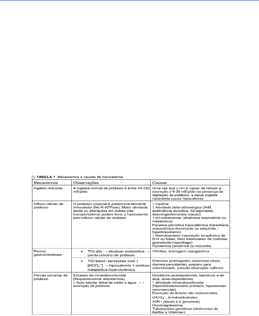 Distúrbios Eletrolíticos Laísla Figueiredo p7 1. Hipocalemia (hipopotassemia) Problema clínico comum, resultante de ingesta reduzida, aumenta de translocação celular e de potássio, ou, freqüentemente , maiores perdas de potássio pelo trato gastrointestinal ou urinário. Definida pela concentração sérica de potássio menor que 3,5 mEq/L, muito embora as manifestações clínicas só ocorrem em níveis séricos mais reduzidos ( <2,5mEq/L). Estratifica-se conforme as concentrações: -Leve: 3,1-3,5 mEq/L - Moderada: 2,5-3,0 mEq/L - Grave: <2,5 mEq/L Indivíduos com doença cardiovascular são particularmente mais suscetíveis ás conseqüências clinicas da hipocalemia. Uma depleção de potássio e conseqüente hipocalemia pode ocorrer por meio de redução da ingesta ou aumento da perda corporal e, portanto, persistir a despeito de sinalização hormonal e função renal normais. ETIOLOGIA: É de origem multifatorial e está associada a insuficiência renal, disfunção tubular ou shift de potássio do meio intra para o meio extracelular. Uma coorte de 242 episódios consecutivos de hipercalemia identificou as seguintes causas e frequências associadas: Insuficiência renal: 77%. Hiperglicemia: 49%. Suplementação de potássio: 15%. Relacionada a drogas (imunossupressores como tacrolimus e ciclosporina, IECA, betabloqueadores, digoxina, anti-inflamantórios não esteroidais): 63%. As principais manifestações clínicas associadas a hipercalemia estão relacionados à transmissão neuromuscular debilitada e cardíacas. As manifestações mais graves associadas a hipercalemia são fraqueza/paralisia muscular, defeitos de condução cardíaca e arritmias cardíacas. A hipocalemia gera atraso na repolarização ventricular por inibir a atividade dos canais de potássio. As hipocalemias leves (3-3,5 mEq/L) são frequentemente assintomáticas. Caso contrário, manifestam-se com mínima fadiga ou fraqueza muscular. Os sintomas associados a hipocalemias mais graves são: constipação (íleo paralítico), palpitações, síncope, fraqueza muscular, fadiga, paralisia ascendente e desconforto respiratório (K+ < 2 mEq/L). - Deve-se perguntar sobre a história de medicações, O mesmo se faz a respeito da história patológica e inventário de sintomas, com atenção especial a insuficiência cardíaca, síndrome nefrótica, cirrose e sintomas gastrointestinais (vômito e diarreia). O exame físico, vale salientar as alterações esperadas na pressão arterial. - Pressões reduzidas são condizentes com abuso de diurético, diarreia (hipovolemia), Bartter e Gitelman. Fraqueza muscular, paralisia ascendente e diminuição dos reflexos tendinosos profundos são achados neurológicos presumidamente proporcionais ao grau da hipocalemia. Fraqueza muscular manifesta-se com níveis séricos <2,5 mEq/L. A depleção do potássio (<2,5 mEq/L) pode ocasionar, ainda, câimbras, robdomiólise e conseqüentemente mioglobinúria. As arritmias cardíacas associas a hipocalemia apresenta grande variedade- ectopias atriais e ventriculares, bradicardia sinusal, bloqueios átrios-ventriculares , taquicardias supraventriculares e juncionas, fibrrilação e taquicardia ventriculares. - Realizar um eletrocardiograma como parte inicial da avaliação de um paciente com hipocalemia moderada grave. INVESTIGAÇÃO ETIOLÓGICA Deve se iniciar com anamnese do paciente, avaliação de comorbidades prévias e uso de medicações. Nos casos nos quais não se é possível a pronta identificação da causa, as principais medidas serão avaliação da excreção renal de potássio – para distinguir perdas renais de outras etiologias e avaliação do equilíbrio acidobásico, visto que algumas etiologias podem estar associadas a acidose/alcalose. Avaliação da excreção renal de potássio permite distinguir perdas renais de potássio (diuréticos, hipoaldosteronismo primário) de outras etiologias de hipocalemia (perdas TGI, influxo celular etc.). *Valores superiores a 15 mEq/L sugerem perda renal de potássio.* Avaliação do equilíbrio acidobásico, após a avaliação da excreção urinária de potássio, a avaliação do equilíbrio acidobásico irá auxiliar na averiguação da etiologia. Tratamento O principal tratamento é a reposição de potássio. A urgência da terapêutica e a via de administração irá depender da gravidade da hipocalemia, do ritmo de instalação e da presença de manifestações associadas. A redução de 1 mEq/L na calemia corresponde a aproximadamente 200 a 400 mEq de perda de potássio corporal. - Considera-se a reposição caso o K + < 3,5 mEq/L, mesmo se o paciente for assintomático, com objetivo de manter ≥ 4 mEq/L. As indicações de reposição são: Pacientes incapazes ou que recusam-se a reduzir a ingestão de sal. Sintomas gastrointestinais (náusea, vômito, diarreia), bulimia ou abuso de diurético ou laxativo. Hipocalemia relacionada a droga. Paciente com insuficiência cardíaca, hipertensão, ou arritmias, mesmo se o potássio sérico está aparentemente normal (próximo de 4 mEq/L). Hipocalemia leve Concentrações de potássio entre 3,0 e 3,5 mEq/L tendem a ser assintomáticas. - Pacientes que não apresentem perda de potássio urinária associada, a reposição preferencial é por via oral em doses moderadas por dias a semanas. Recomenda-se a prescrição de 10 a 20 mEq 2 a 4x/dia, a fim de evitar eventos adversos gastrointestinais (40-100 mEq/dia é usualmente adequado). Não deve exceder 200 mEq/dia em adultos. - A formulação mais comum é a de cloreto de potássio – líquida (xarope), cuja formulação de 6% possui 12 mEq a cada 15 mL – ou em cápsulas (600 mg/cápsula = 8 mEq/cápsula). Caso a via oral não seja possível, a reposição deve ser feita via endovenosa. - Pacientes com excreção urinária de potássio elevada e/ou hiperaldosteronismo primário, considera-se a associação de diuréticos poupadores de potássio (amilorida ou espironolact