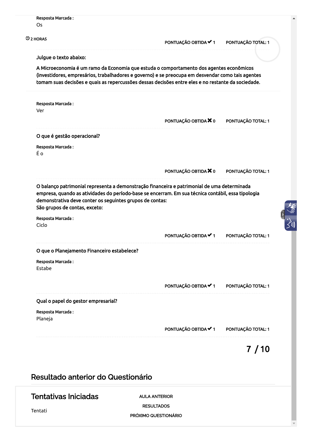 29/03/22, 23:24 Course Status – Centro Universitário Faveni https://ava.pos.unifaveni.com.br/course-status/ 1/2 2 HORAS AVALIAÇÃO – ECONOMIA E FINANÇAS PARA GESTORES FIM AULA ANTERIOR RESULTADOS PRÓXIMO QUESTIONÁRIO 7 / 10 PONTUAÇÃO TOTAL: 1PONTUAÇÃO OBTIDA 1 Resposta Marcada : Os salários, juros e dividendos que os consumidores, no papel de proprietários de recursos, recebem como renda mensal. PONTUAÇÃO TOTAL: 1PONTUAÇÃO OBTIDA 0 Julgue o texto abaixo: A Microeconomia é um ramo da Economia que estuda o comportamento dos agentes econômicos (investidores, empresários, trabalhadores e governo) e se preocupa em desvendar como tais agentes tomam suas decisões e quais as repercussões dessas decisões entre eles e no restante da sociedade. Resposta Marcada : Verdadeira PONTUAÇÃO TOTAL: 1PONTUAÇÃO OBTIDA 0 O que é gestão operacional? Resposta Marcada : É o conjunto de ações e estratégias aplicadas em um negócio, utilizando de seus recursos �nanceiros, estruturais e humanos. PONTUAÇÃO TOTAL: 1PONTUAÇÃO OBTIDA 1 O balanço patrimonial representa a demonstração �nanceira e patrimonial de uma determinada empresa, quando as atividades do período-base se encerram. Em sua técnica contábil, essa tipologia demonstrativa deve conter os seguintes grupos de contas: São grupos de contas, exceto: Resposta Marcada : Ciclo operacional PONTUAÇÃO TOTAL: 1PONTUAÇÃO OBTIDA 1 O que o Planejamento Financeiro estabelece? Resposta Marcada : Estabelece diretrizes de mudanças na empresa especialmente no que diz respeito ao controle de ações para atingir objetivos e metas em curto e longo prazo. PONTUAÇÃO TOTAL: 1PONTUAÇÃO OBTIDA 1 Qual o papel do gestor empresarial? Resposta Marcada : Planejamento, execução e controle Total Resultado anterior do Questionário Tentativas Iniciadas Tentativas realizadas:1 Tentativa 1 iniciada em: 23/03/2022 21:20:42 https://ava.pos.unifaveni.com.br/membros/10765080737/course/course-results/?action=179617 29/03/22, 23:24 Course Status – Centro Universitário Faveni https://ava.pos.unifaveni.com.br/course-status/ 2/2 AULA ANTERIOR RESULTADOS PRÓXIMO QUESTIONÁRIO 7 / 10 PONTUAÇÃO TOTAL: 1PONTUAÇÃO OBTIDA 1 Resposta Marcada : Os salários, juros e dividendos que os consumidores, no papel de proprietários de recursos, recebem como renda mensal. PONTUAÇÃO TOTAL: 1PONTUAÇÃO OBTIDA 0 Julgue o texto abaixo: A Microeconomia é um ramo da Economia que estuda o comportamento dos agentes econômicos (investidores, empresários, trabalhadores e governo) e se preocupa em desvendar como tais agentes tomam suas decisões e quais as repercussões dessas decisões entre eles e no restante da sociedade. Resposta Marcada : Verdadeira PONTUAÇÃO TOTAL: 1PONTUAÇÃO OBTIDA 0 O que é gestão operacional? Resposta Marcada : É o conjunto de ações e estratégias aplicadas em um negócio, utilizando de seus recursos �nanceiros, estruturais e humanos. PONTUAÇÃO TOTAL: 1PONTUAÇÃO OBTIDA 1 O balanço patrimonial representa a demonstração �nanceira e patrimonial de uma determinada empresa, quando as atividades do período-base se encerram. Em sua técnica contábil, essa tipologia demonstrativa deve conter os seguintes grupos de contas: São grupos de contas, exceto: Resposta Marcada : Ciclo operacional PONTUAÇÃO TOTAL: 1PONTUAÇÃO OBTIDA 1 O que o Planejamento Financeiro estabelece? Resposta Marcada : Estabelece diretrizes de mudanças na empresa especialmente no que diz respeito ao controle de ações para atingir objetivos e metas em curto e longo prazo. PONTUAÇÃO TOTAL: 1PONTUAÇÃO OBTIDA 1 Qual o papel do gestor empresarial? Resposta Marcada : Planejamento, execução e controle Total Resultado anterior do Questionário Tentativas Iniciadas Tentativas realizadas:1 Tentativa 1 iniciada em: 23/03/2022 21:20:42 https://ava.pos.unifaveni.com.br/membros/10765080737/course/course-results/?action=179617
