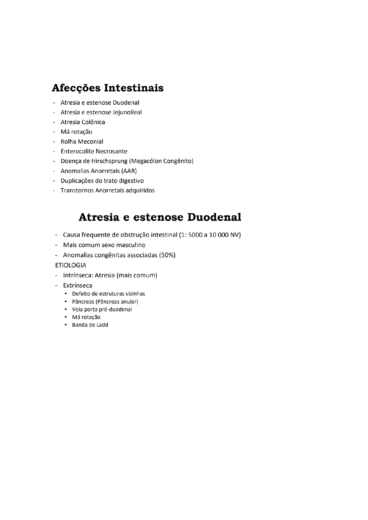 Cirurgia Pediátrica - Afecções Intestinais intrínseca- no proprio intestino a anomalia. pâncreas anular- em forma de anel em forma do duodeno. -A- pâncreas em anel B: membrana que fecha o duodeno (mais comum) C: membrana perfurada(dificulta a passagem mas n obstrui completamente) TIPO 2 tem cordão fibroso em vez de ser tubo c luz, entre duas extremidades do intestino. TIPO 3 duodeno fechou e continua o jejum Se tem o furinho na membrana, diagnostico retardado. Na maioria dos casos, a obstrução do duodeno é distal à ampola de Vater (85%), portanto os bebês apresentam vômitos biliosos. Em pacientes com atresia por membrana mucosa, sintomas de vômitos pós-prandiais podem ocorrer em etapas mais tardias da vida. polidramio: acúmulo de liquido. Nao porque aumenta rpodução e sim porque acumula liquido devido a estenose. (IMPORTANTE) Sinal da dupla bolha: tanto no USG quanto no Raio x é patognomônico de atresia de duodeno. Pode estar na estenose mas não é algo tao comum. Principalmente na atresia. Estenose: passa c dificuldade. Na ultima imagem dá para visualizar, o contraste passou um pouquinho so. anastomose a diamond shape- pq fica com formato de diamante. (TEM QUE SABER) NV- nascidos vivos IU- intrauterino essa classificação se repete a jejuno, ileo e cólon. Tipo A- estenose. Está só estreito Tipo B (ou tipo 1)- é atresia. Está fechado. Nao tem luz. Tipo 2: fica aquele cordao fibroso. Ainda unido um c o outro. Tipo D(ou 3a): jejuno e íleo separados com defeito de meso(insulto foi tao frte que o Meso regrediu) Tipo E (3b): apple peel, árvore de natal. Intestino espiralado, é afuncional. Muito grave e raro. Tipo 4: Mais de uma atresia. ] Tipo 1 e 2 ESSES TIPOS CAEM EM PROVA!! dilatação de estômago, alças intestinais dilatadas e para baixo as alças “desaparecem”. quando tem multiplas estenoses pode ter risco do cirurgiao cortar muito intestino. tratamento da atresia- cirurgia. Tipo IV: múltiplas atresias. alças dilatadas no ultimo raio x na foto de cima, obstrução mais baixa pois da p ver as alças de cima. enema contrastado-coloca sonda pelo ânus e injeta contraste gastrosquise- bebê q nasce c alças p fora do abdome onfalocele: bebe com as alças p fora mas com membrana recobrindo hernia diafragmática: buraco no diafragma processo de alongamento, rotação e retorno pro abdome do intestino. bandas fibróticas em cima do duodeno Banda de ladd- ceco deveria ter rodado mas ficou em cima do duodeno, obstruindo. Fixação do ceco num local errado e ficou como fibrose, obstruindo o DUodeno. -diagnostico arrastado, criança come fica com barriga distendida, passando mal. - Paciente com volvo intestino torceu no meso, na foto acima. no volvo o paciente sente uma dor muito intensa. apendicectomia tática MA ROTAÇÂO NAO CAI ocorre muito em pacientes c fibrose cística. doença exclusiva de prematuro PRECISA SABER SO ACHADOS CLINICOS E RADIOLOGICOS> NAO PRECISA SABR CADA ESTAGIO pneumatose intestinl: ar na parede do intestino pneumoperitonio em bebe não é clássico. Raio x com raios horizonrais enterocolite é excluisva de prematuro principalmente para os que usam fórmula. enterocolite -> cicatrização depois dos 21 dias -> pode ter estenose LHP: leite humano pasteurizado IMPORTANTE bebe nasce sem as células responsáveis pela contração do intestino (plexos mioentericos) zona de transição: zona de mudança onde tem cels ganglionares para onde nao tem essas céls ganglionares. Isso gera falta de contração. MAis comum em reto e sigmoide bebê evacua em até 48h após seu nascimento. onde ta grossao na foto: zona de transição EXame padrao ouro: Biópsia retal. Na biopsia precisa ter ausência de céls ganglionares. PROVA NAO CAI as técnicas cirúrgicas. Esse raio x faz só com 24h de vida. Precisa saber se é uma anomalia anorretal baixa, ou alta Para anomalia alta: colostomia Para anomalia baixa: cirurgia de Peña l DUPLICAÇÔES NAO CAI !!! precisa drenar fistulectomia. Geralmente é consequencia de abcesso plicoma aparece como cicatrização da fissura raro em criabça; pode estar associado a hipertensao porta lll Principal da aula: - atresia duodenal - atresia e estenose (classificação de applepearl) - rolha meconial] - enterocolite necrosante - megacolon congênito (vactrel) -