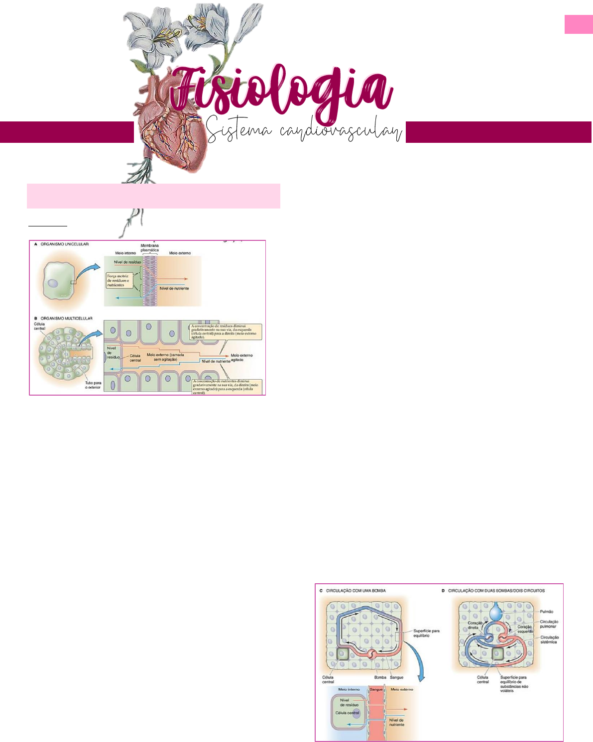 1 Anna Luiza Ferreira – ATM 25 Introdução Evolução: Organismos primitivos, unicelulares, tinham toda a sua superfície em contato com meio externo, facilitando a ocorrência de difusão de nutrientes para o meio intracelular e a excreção de sustâncias finais do metabolismo para o meio extracelular. O gradiente de difusão é relativamente grande, a célula está sempre consumindo nutrientes, logo, o esperado é que haja menos nutrientes na célula do que no meio externo e exista uma tendência desses nutrientes se difundirem para dentro da célula; com os produtos de excreção é o contrário: como célula é produtora dessas substâncias, elas tendem a estar mais concentradas no meio intracelular do que no meio extracelular. Quando esses organismos evoluem e se tornam extracelulares, podemos observar que as células da porção mais interna estão muito longe da superfície, dificultando troca de substâncias por difusão. À medida que o nutriente se movimenta do nutriente em direção a célula, o que se observa é declínio progressivo do gradiente de concentração entre ambiente e meio intracelular, de forma que, no final, tenho gradiente pequeno demais para fazer trocas e a captação de nutrientes vai ficar prejudicada; o mesmo ocorre com a excreção de produtos finais do metabolismo. Esses gradientes são pequenos pois as trocas dependem de simples difusão, precisam se difundir do meio ambiente até a célula mais interna = processo lento; esses sistemas não permitiriam a evolução de organismos tão complexos como o nosso. Dessa forma, foi necessário surgir um sistema de convecção que facilitasse a distribuição de nutrientes e a excreção de produtos finais do metabolismo; nesse sistema de convecção, existe uma bomba para ocasionar o fluxo de um líquido, o sangue, que facilitará a distribuição. É um sistema de três compartimentos: o meio interno, meio ambiente e o sistema circulatório, sangue, entre eles, o qual faz interface com superfícies de equilíbrio, as quais fazem trocas com o meio ambiente (Exemplo: Sistema Respiratório, Sistema Digestório, Sistema Renal, etc). O fato de ter superfícies de troca entre o sangue e o “ambiente” permite que existam gradientes apropriados para excretar catabólitos e captar nutrientes. À medida que organismos evoluem em termos metabólicos, como os seres humanos, surgem sistemas organizados em paralelo, de forma que se garanta que todo o sangue, antes de ser levado para os tecidos, seja oxigenado (quanto mais alta a taxa metabólica, maior a necessidade de oxigenação); assim surge o Sistema Circulatório organizado em paralelo. O Sistema Cardiovascular é uma rede de transporte de material com o objetivo de manter a homeostase do meio interno. 2 Anna Luiza Ferreira – ATM 25 FUNÇÕES DO SISTEMA CARDIOVASCULAR • Distribuição de gases respiratórios, substâncias necessárias ao metabolismo energético, crescimento e reparo do organismo; • Transporte de moléculas de sinalização e calor – Sistema Endócrino, junto com o SNC, controla e regula todas as funções do organismo, mas quem transporta os hormônios das glândulas produtoras até os órgãos alvo é o Sistema Cardiovascular. Também transporta calor, do interior do corpo/vísceras, para a superfície, ode esse calor pode ser dissipado em situação de aumento de temperatura corporal; • Transporte de catabólitos – como gás carbônico, produtos finais do metabolismo de proteínas, produtos nitrogenados, etc; • Defesa do organismo contra agentes agressores (sistema imune) – ajuda no transporte e distribuição dos elementos figurados do sangue que constituem o Sistema Imune, assim como faz a distribuição de substâncias como os anticorpos. ORGANIZAÇÃO DO SISTEMA CIRCULATÓRIO De modo geral, o Sistema Circulatório vai ser constituído por uma bomba que gera pressão, o Coração, e por vasos sanguíneos que conduzem o sangue para os tecidos e vão recolher esse sangue, levando-o de volta ao coração. Temos diferentes tipos de vasos sanguíneos: 1. Arteriais: conduzem o sangue do coração para os tecidos. Vaso arterial da saída do coração do lado esquerdo é a Aorta; do direito, é a Artéria Pulmonar, que leva sangue para o pulmão; 2. Vasos venosos: devolvem o sangue dos tecidos para o coração. Do lado direito do coração, o aporte sanguíneo venoso é realizado pela Veia Cava superior e a Veia Cava Inferior; o lado esquerdo vai ter aporte pela Veia Pulmonar; 3. Capilares: vasos que fazem troca entre sangue e tecidos. São extremamente finos, formados por única camada de células endoteliais para facilitar a difusão de substâncias. Na maior parte do nosso organismo, o vaso arterial se abrindo para o capilar e esse capilar sendo drenado por um vaso venoso (mas existem exceções em algumas estruturas, apresentando leitos capilares em série, como os rins). O sangue que sai do Ventrículo Esquerdo em direção aos tecidos é rico em oxigênio, ele acabou de vir para o pulmão, onde fez trocas, e agora vai ser reconduzido para os tecidos (Vaso Arterial conduzindo sangue oxigenado). Entretanto, a Artéria Pulmonar, apesar de ser um Vaso Arterial está recebendo sangue do lado direito do coração, um sangue desoxigenado. Para relacionar com grau de oxigenação, precisa afirmar claramente que é um vaso arterial da Circulação Sistêmica, tendo em vista que daí sim, todo vaso arterial circula sangue oxigenado; diferente da Circulação Pulmonar, onde vasos arteriais vão conduzir sangue desoxigenado. O mesmo vale para os vasos venosos: os vasos da Circulação Sistêmica conduzem sangue pobre em oxigênio; os da Circulação Pulmonar são ricos em oxigênio. Observação: O termo “Vaso Arterial” e “Vaso Venoso” não tem nada a ver com o grau de oxigenação do sangue. 3 Anna Luiza Ferreira – ATM 25 ORGANIZAÇÃO EM SÉRIE E EM PARALELO Leitos capilares do baço e do intestino estão em paralelo e vão 