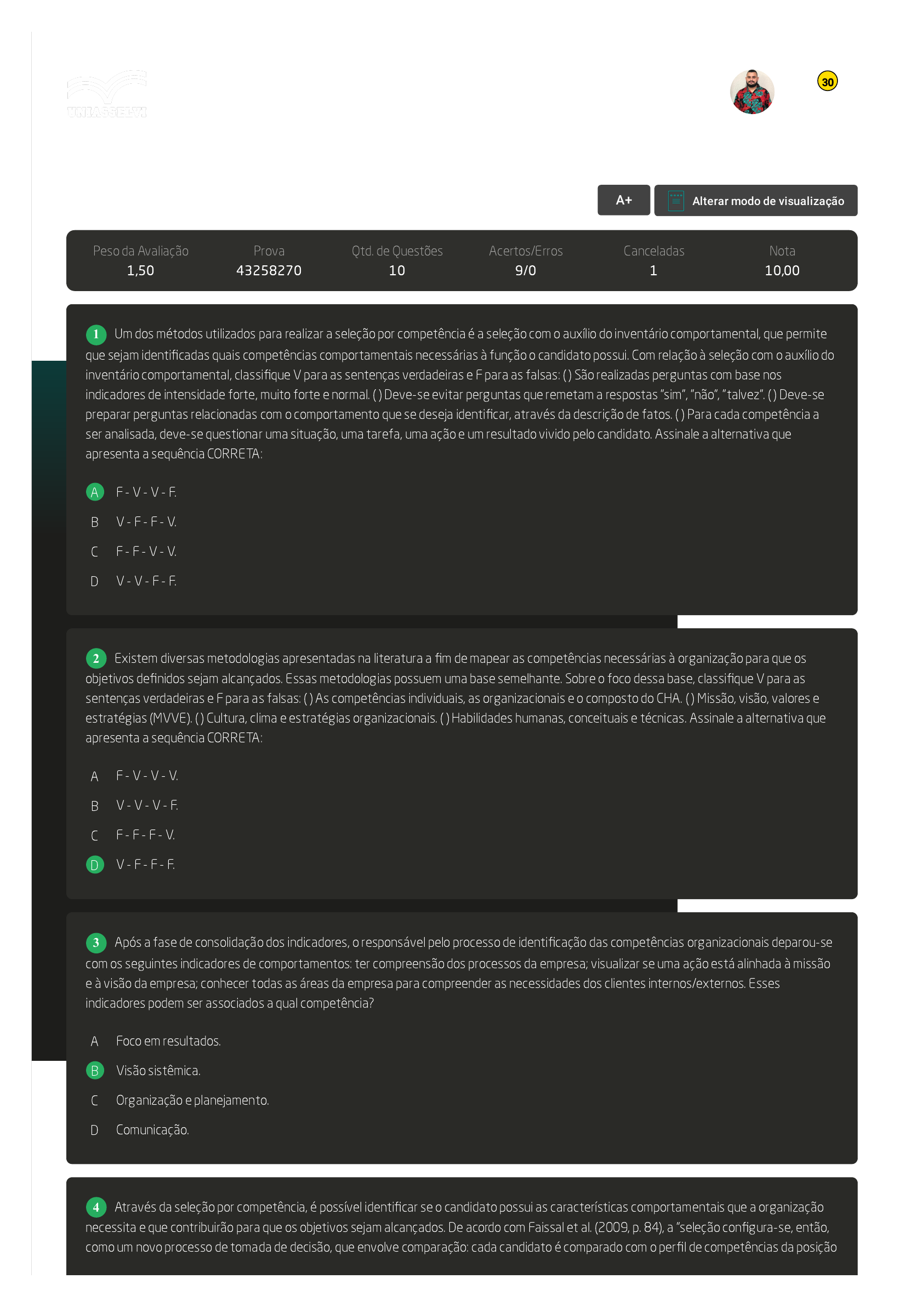 30/03/2022 23:21 AVA https://ava2.uniasselvi.com.br/subject/grades-and-tests/answer-book/eyJ0ZXN0Ijp7InRlc3RDb2RlIjoiNzQxMzAxIiwiZGVzY3JpcHRpb24iOiJBdmFsaWHDp8OjbyBJSSAtIEluZGl2aWR1YWwiLCJwYXJhbWV0ZXIiOjU0OSwiZXhhb… 1/4 GABARITO | Avaliação II - Individual (Cod.:741301) Peso da Avaliação 1,50 Prova 43258270 Qtd. de Questões 10 Acertos/Erros 9/0 Canceladas 1 Nota 10,00 Um dos métodos utilizados para realizar a seleção por competência é a seleção com o auxílio do inventário comportamental, que permite que sejam identificadas quais competências comportamentais necessárias à função o candidato possui. Com relação à seleção com o auxílio do inventário comportamental, classifique V para as sentenças verdadeiras e F para as falsas: ( ) São realizadas perguntas com base nos indicadores de intensidade forte, muito forte e normal. ( ) Deve-se evitar perguntas que remetam a respostas "sim", "não", "talvez". ( ) Deve-se preparar perguntas relacionadas com o comportamento que se deseja identificar, através da descrição de fatos. ( ) Para cada competência a ser analisada, deve-se questionar uma situação, uma tarefa, uma ação e um resultado vivido pelo candidato. Assinale a alternativa que apresenta a sequência CORRETA: A F - V - V - F. B V - F - F - V. C F - F - V - V. D V - V - F - F. Existem diversas metodologias apresentadas na literatura a fim de mapear as competências necessárias à organização para que os objetivos definidos sejam alcançados. Essas metodologias possuem uma base semelhante. Sobre o foco dessa base, classifique V para as sentenças verdadeiras e F para as falsas: ( ) As competências individuais, as organizacionais e o composto do CHA. ( ) Missão, visão, valores e estratégias (MVVE). ( ) Cultura, clima e estratégias organizacionais. ( ) Habilidades humanas, conceituais e técnicas. Assinale a alternativa que apresenta a sequência CORRETA: A F - V - V - V. B V - V - V - F. C F - F - F - V. D V - F - F - F. Após a fase de consolidação dos indicadores, o responsável pelo processo de identificação das competências organizacionais deparou-se com os seguintes indicadores de comportamentos: ter compreensão dos processos da empresa; visualizar se uma ação está alinhada à missão e à visão da empresa; conhecer todas as áreas da empresa para compreender as necessidades dos clientes internos/externos. Esses indicadores podem ser associados a qual competência? A Foco em resultados. B Visão sistêmica. C Organização e planejamento. D Comunicação. Através da seleção por competência, é possível identificar se o candidato possui as características comportamentais que a organização necessita e que contribuirão para que os objetivos sejam alcançados. De acordo com Faissal et al. (2009, p. 84), a "seleção configura-se, então, como um novo processo de tomada de decisão, que envolve comparação: cada candidato é comparado com o perfil de competências da posição VOLTAR A+ Alterar modo de visualização 1 2 3 4 Francisco Ronaldo Pereira da Silva Gestão de Recursos Humanos (3081530) 30 30/03/2022 23:21 AVA https://ava2.uniasselvi.com.br/subject/grades-and-tests/answer-book/eyJ0ZXN0Ijp7InRlc3RDb2RlIjoiNzQxMzAxIiwiZGVzY3JpcHRpb24iOiJBdmFsaWHDp8OjbyBJSSAtIEluZGl2aWR1YWwiLCJwYXJhbWV0ZXIiOjU0OSwiZXhhb… 2/4 em aberto e com os demais candidatos. Essas comparações levam à escolha de um deles". Com relação à seleção por competência, classifique V para as sentenças verdadeiras e F para as falsas: ( ) Para que a seleção por competência seja desenvolvida, é necessário que a empresa tenha realizado o inventário comportamental e que tenha a descrição dos cargos. ( ) A seleção por competência deve ter como foco o desenvolvimento e a retenção de talentos na organização. ( ) O modelo ideal para realizar seleção por competência é a seleção por competência com base no inventário comportamental. ( ) Na seleção por competência, a organização deverá definir qual será o foco de análise, se será o conhecimento, as habilidades ou as atitudes que o candidato possui. Assinale a alternativa que apresenta a sequência CORRETA: FONTE: FAISSAL, Reinaldo et al. Atração e seleção de pessoas. 2. ed. Rio de Janeiro: FGV, 2009. A V - V - F - F. B F - V - F - V. C V - F - V - F. D F - F - V - V. De acordo com Fernandes (2013, p. 66), "modelos de competência servem de base para estruturar vários processos de gestão de pessoas, basicamente atração, desenvolvimento, recompensa e avaliação". Sendo assim, pode-se afirmar que a Gestão por Competências está presente nas organizações em vários processos da gestão de pessoas, como no recrutamento e seleção, avaliação e desempenho, treinamento e desenvolvimento, entre outros, possibilitando melhores resultados e vantagens para a organização. Com relação aos processos de gestão de pessoas baseados em competências, classifique V para as sentenças verdadeiras e F para as falsas: ( ) O recrutamento e seleção do candidato será feito com base no perfil de competências exigidas para o cargo. A entrevista com o candidato realizada pelo selecionador buscará os comportamentos mais importantes para a execução das tarefas pertinentes ao cargo. ( ) A avaliação de desempenho por competências possibilita à empresa ter conhecimento de como seus profissionais desempenham as atividades, além de obter maior noção de suas potencialidades. ( ) No processo de treinamento e desenvolvimento, a Gestão por Competência auxilia na construção do processo de sucessão baseada nas competências necessárias para cada função e para o futuro da organização. ( ) A remuneração por competência consiste numa nova estratégia para administrar os cargos e os salários da empresa, dando importância primeiramente ao homem, para depois ao cargo. Assinale a alternativa que apresenta a sequência CORRETA: FONTE: FERNANDES, Bruno Henrique Rocha. Gestão est