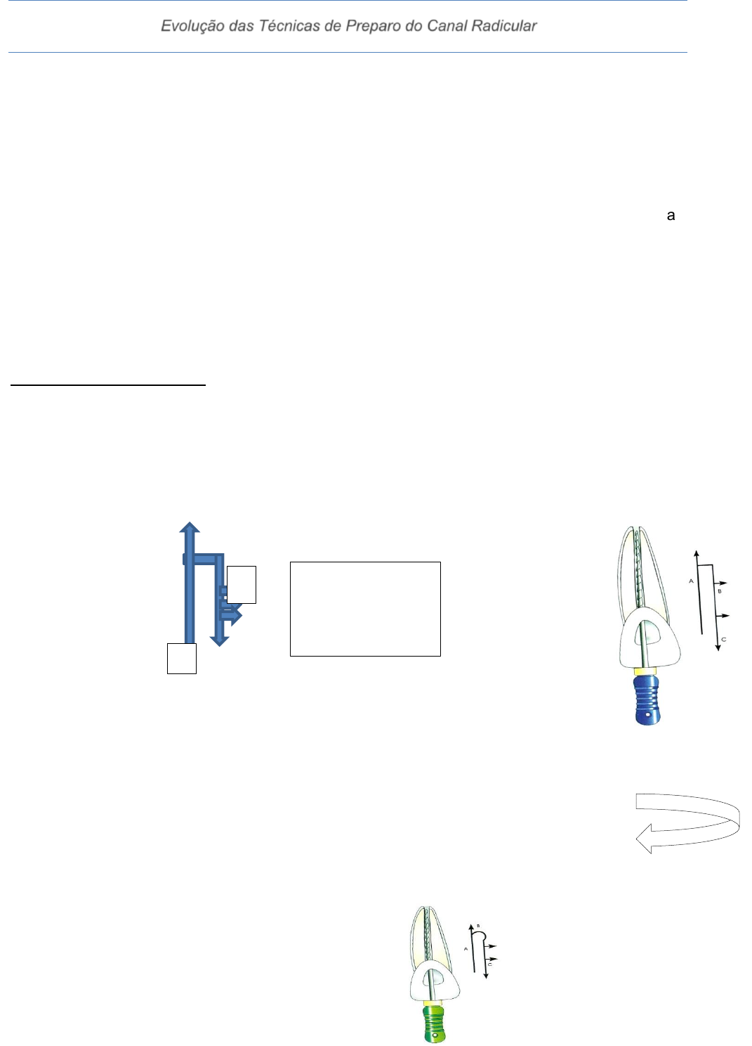 Evolução das Técnicas de Preparo do Canal Radicular • A terapia endodôntica deve ser considerada igual ao tratamento de uma ferida aberta em qualquer outra parte do corpo humano. Deve ser feita com métodos cirúrgicos adequados, uma familiaridade com a anatomia do canal radicular, conhecimento da reação tecidual e com técnica cuidadosa. • Grove CJ, JADA, August 1930 • A Endodontia é uma área psicomotora E só ensina quem faz e só aprende quem pratica • .......este novo profissional pense, planeje, e principalmente não tente tratar todos os casos de mesma maneira e desta forma deverá saber extrair os benefícios oriundos de novas tecnologias. Assim sendo um determinado caso devera ser planejando, dentro é claro das limitações existentes, pois com os conhecimentos atuais da ciência não conseguimos atingir todas as soluções, pois pouco ainda sabemos....... Conceitos a compreender: ➔ Limar: usar movimentos firmes para dentro e para fora (penetração e retirada no interior do canal), durante o preparo do canal radicular. Movimento de Limagem (raspagem): entra sem tocar e sai raspando. “O movimento de limagem não deve ser empregado no preparo apical do canal”; pode ocasionar o transporte apical interno ou Zip e deformação da porção curva; Lopes & Siqueira, 2010 ➔ Alargar ou Dilatar: aplicar aos instrumentos movimentos de rotação, no sentido horário, durante o preparo do canal radicular. Para que ocorra o alargamento é necessário que o instrumento trabalhe justo. Sem forçar quando tranca para não quebrar a lima. ➔ Limar e Dilatar: consiste em um movimento que introduz a lima no canal radicular com rotação e sua remoção sem rotação. A. Introdução B. Retirada: tração Lateral contra as paredes “Vaivém” 360º A. Introdução B. Rotação ½, ¼ de volta C. Retirada: tração Lateral contra as paredes 2 1. Avanço 2. Tração com pressão lateral 1 2 ➔ Recapitulação: • É o restabelecimento da posição de uma lima anteriormente utilizada em um local determinado. • É o emprego, em todo o comprimento de trabalho de um instrumento de menor diâmetro do que o diâmetro já instrumentado do canal radícula. Finalidade de manter a anatomia original e remover as sujidades que a lima calibrosa deixou. Exemplo: CRT 19 mm/IAI LK 10 • LK 10 19mm • LK 15 19mm • LK 10 19mm • LK 20 21mm • LK 10 19mm • LK 25 19mm • LK 10 19mm ➔ Forças Balanceadas: aplicar às limas movimentos de rotação tanto no sentido horário como no sentido anti-horário. Rotação de 1/2 de volta no sentido horário e 1/2 volta no sentido anti-horário. →Roane et al. (1985) • Os movimentos realizados no sentido horário são os responsáveis pelo posicionamento das limas nos condutos e os movimentos no sentido anti-horário são os responsáveis pela ação de corte das limas. Usado para o movimento reciprocante. • É um movimento de alargamento parcial alternado; • Também conhecido como movimento oscilatório. • O movimento sem a volta completa diminui risco de fraturas. 1. Avanço 2. Giro a direita 3. Giro a esquerda 4. Retrocesso de 1 a 2mm 5. Avanço • Principal indicação é o preparo apical em canais retos ou curvos • Evita- se o pré- curvamento dos instrumentos (motivo pelo qual na região curva do canal não utilizamos além da LK 25 ou 30 de aço inoxidável ) Quando o instrumento não tocar nas paredes, faz ISI e troca para lima mais calibrosa. ➔ Zona Crítica Apical: • Compreende os 4 milímetros finais da raiz, ou seja, a área apical. • Contém íntima relação os tecidos e os elementos estruturais do periápice: o canal radicular apical, o forame apical e as foraminas. • Menor diâmetro e tem curvatura • Pode conter microrganismos, que estão presentes nos canalículos dentinários, nas paredes dos forames, nos canais laterais e acessórios e nos tecidos periapicais. Ocorre a maioria dos problemas clínicos: • sobre-instrumentação e sobre-obturação, • sub-instrumentação e sub-obturação, • perfuração • desvio • transporte do canal radicular formando o "Zip” ➔ Patência Foraminal: • É a manutenção do forame apical desobstruído durante a instrumentação do canal radicular; • É realizado com instrumentos de pequeno calibre • “A Biologia requer a eliminação dos produtos de degradação de proteínas, bactérias, e toxinas de bactérias que emanam canais necróticos e gangrenosa”. Schilder. • No estudo individual de cada dente grande variabilidade nas mensurações da extensão do cemento entre o lado esquerdo e direito. • Estudos pesquisam se é necessário alargar a região apical e se deve fazer a limpeza da região (facilita o reparo do coto pulpar). • Limpeza do forame apical = Desbridamento • Iremos usar um instrumento de menor diâmetro 1 mm além do canal desobstruindo o forame. • “a localização clínica do limite cdc é utopia” • Há a discussão se deve fazer patência em Biopulpectomia • O diâmetro do limite cdc ficou correspondente a lima #35 a #30. ➔ Limite apical de instrumentação • Ponto de referência oclusal • Distância da Ponta do Instrumento do final radiográfico • Halo de dentina recobrindo a ponta do instrumento Técnicas de Preparo do Canal radicular Técnica Tradicional/Convencional/ Clássica • Todos os instrumentos são utilizados durante a instrumentação no mesmo CRT previamente determinado, após a exploração do canal radicular. • Alargava no sentido ápice em sentido a coroa, uso da limagem. • Canais amplos e Retos. • Abertura coronária→Odontometria→Preparo químico mecânico: aumento do diâmetro do canal radicular de acordo com o aumento do diâmetro do instrumento • O que acontece se instrumentarmos com a Técnica Convencional canais curvos com menor diâmetro na região apical? • Ao chegar na lima K 35 mesmo curva (não tem flexibilidade) irá danificar a zona crítica apical, criando dor
