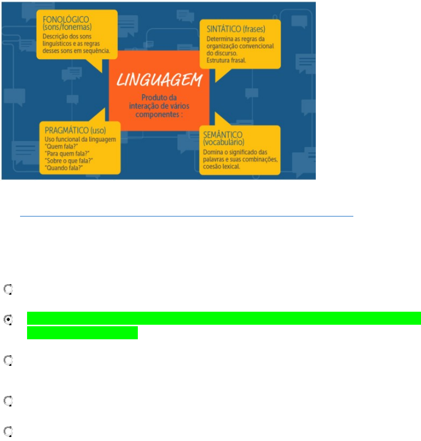 Pergunta 1 Disponível em: https://sagahcm.sagah.com.br/sagahcm/sagah_ua_dinamica/13058776. Acesso em: jun. 2020 Sobre o item semântico da libras, apresentado no infográfico, analise as asserções abaixo e marque o item que apresenta a informação correta: Libras não tem vocábulos, todos os sinais são reproduções do português. Assim como a língua portuguesa, a libras conta com elementos semânticos, fonológicos, sintáticos e pragmáticos. Diferentemente do português, a libras não conta com elementos como semântica e fonética. A semântica não pode ser sinalizada na libras, por isso, usa a pragmática como apoio. A libras é composta por elementos exclusivamente semânticos, os demais itens não fazem parte da língua. Pergunta 2 A "revolução" no desenvolvimento da comunicação, como assinalamos anteriormente, não ocorre com o surgimento das primeiras palavras, mas com o nascimento da intenção comunicativa no contexto da intersubjetividade humana. CASTORINA. José A. CARRETEIRO, Mario (Org.) Desenvolvimento cognitivo e educação: os inícios do conhecimento. Porit Alegre: Penso, 2014. Considerando as informações apresentadas, avalie as afirmações a seguir. I - As crianças começam a fazer gestos, como apontar, cumprimentar e pedir, antes de falar. E os gestos continuam depois da aquisição da linguagem e inclusive estão presentes nos adultos, uma vez que a comunicação é um fenômeno multimodal. PORQUE II – Com base nas investigações atuais, a criança cria possibilidades de comunicação com o uso de gestos comunicativos e sua aprendizagem fica comprometida e defasada quando ela continua a usar os gestos em diferentes atos comunicativos, o mesmo deve ocorrer com os surdos, por isso, é desaconselhável comunicação com o uso de gestos. A respeito dessas asserções, assinale a opção correta. As asserções I e II são proposições verdadeiras, mas a II não é uma justificativa da I. As asserções I e II são proposições falsas. A asserção I é uma proposição verdadeira, e a II é uma proposição falsa. As asserções I e II são proposições verdadeiras, e a II é uma justificativa da I. A asserção I é uma proposição falsa, e a II é uma proposição verdadeira. Pergunta 3 Sobre os espaços e a sua importância para a vivência e compartilhamento da libras, cabe pensar nas diferentes possibilidades e nas relações que permeiam a aprendizagem da libras, bem como, a troca de experiência entre os surdos. Considerando as informações apresentadas, avalie as afirmações a seguir. I - A escola é um local que não pode oferecer um espaço que atenda às especificidades linguísticas dos surdos, principalmente porque deve seguir um planejamento prévio de ensino no qual os conteúdos são o foco das aulas. PORQUE II A presença de crianças ouvintes representa o destaque que deve ser dado ao planejamento anual das escolas, não sendo possível contemplar qualquer ação que favoreça o uso e compartilhamento da Libras para as crianças surdas naquele ambiente. A respeito dessas asserções, assinale a opção correta. As asserções I e II são proposições falsas. A asserção I é uma proposição verdadeira, e a II é uma proposição falsa. As asserções I e II são proposições verdadeiras, e a II é uma justificativa da I. A asserção I é uma proposição falsa, e a II é uma proposição verdadeira. As asserções I e II são proposições verdadeiras, mas a II não é uma justificativa da I. Pergunta 4 [..] a cultura surda é organizada, esse grupo social cujo elemento de destaque baseia- se na comunicação por meio dos sinais e, além da perspectiva visual, como o autor Stuart Hall afirma, ela está sempre sendo formada, em constante processo de construção. A construção da identidade surda, no entanto, é elaborada pela comunidade surda [...]. NASCIMENTO, Kathia Cilene S. Os sentidos e as singularidades do instituto pedagógico de apoio à educação do surdo em Sergipe. 2018. 119f. Dissertação (Mestrado em Educação) – Universidade Tiradentes, Aracaju, 2018. Sobre a cultura surda, é correto o que se afirma em: A cultura surda é compartilhada em escolas, associações e comunidades. A cultura surda está apenas no imaginário de quem conhece a libras. A comunidade não tem uma cultura nem língua. São hábitos que estão fechados em associações de surdos. A comunidade surda brasileira não tem uma cultura, mas compartilha uma língua. Pergunta 5 Quando diagnosticada a surdez ou a perda auditiva, dependendo do caso e de cada pessoa, o profissional da área da saúde recomenda o uso do aparelho auditivo. Esse aparelho é um dispositivo eletrônico que exerce a função do ouvido quando esse não consegue receptar, transmitir e decodificar todas as informações sonoras externas. Quando uma pessoa com perda auditiva utiliza o aparelho auditivo, o instrumento passa a ter a função do ouvido humano. Com base nos elementos destacados do contexto, avalie as afirmações abaixo: I - Assim como o nosso ouvido, o dispositivo eletrônico, ou o aparelho auditivo, é dividido em três partes. II - São partes do aparelho auditivo ou dispositivo eletrônico: o ouvido externo por intermédio do canal auricular, ocasionando vibrações na parte do ouvido médio, no tímpano. III - O microfone é uma das partes do aparelho auditivo responsável por captar o som externo do ambiente e convertê-lo em ondas sonoras/vibrações, levando os sinais elétricos diretamente para o amplificador sonoro. IV - O receptor é responsável por enviar a mensagem para o ouvido humano. Há diversos tipos e modelos de aparelhos auditivos no mercado. V - Quando os sinais elétricos chegam até o amplificador, eles aumentam a potência/frequência das vibrações que são encaminhadas diretamente para o receptor. São verdadeiras as afirmativas contidas nas proposições: I e II, apenas. I e III, apenas. III e IV, apenas. I, II e IV, apenas. I