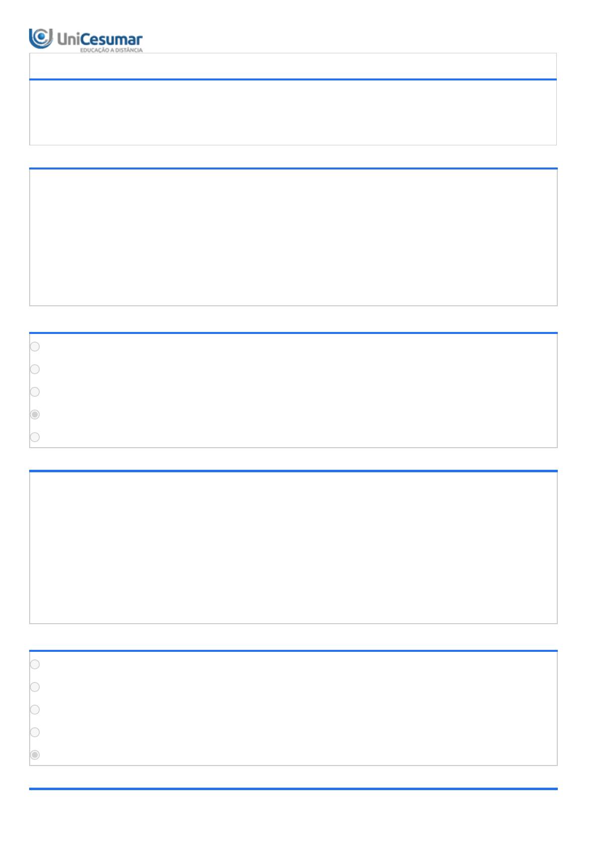 17/03/22, 16:40 Unicesumar - Ensino a Distância 1/6 ATIVIDADE 2 - GQ - EMPREENDEDORISMO - 2021A Período:05/04/2021 08:00 a 27/04/2021 23:59 (Horário de Brasília) Status:ENCERRADO Nota máxima:1,50 Gabarito:Gabarito será liberado no dia 28/04/2021 00:00 (Horário de Brasília) Nota obtida:1,35 1ª QUESTÃO Atualmente ouvimos sempre falar das Startups que são modelos de negócios com alto potencial de crescimento e atendimento de consumidores. Normalmente esses empreendimentos passam por um momento de teste antes de se tornar grandes empresas e para isso, o planejamento é realizado utilizando a metodologia canvas. Elaborado pelo professor, 2021. Considerando a metodologia canvas, assinale a alternativa que correnponde a etapa onde é planejado o diferencial competitivo da empresa. ALTERNATIVAS Relacionamento com clientes. Segmento de clientes. Atividades Chave. Proposta de Valor. Recursos Chave. 2ª QUESTÃO Os empreendedores seriam apostadores (jogadores) e é isso o que faz com que coloquem permanentemente à prova seus talentos? São eles realmente diferentes dos tipos de pessoas que se tornam bons administradores? Na verdade, não são jogadores, uma vez que suas decisões são tomadas com bases sólidas, com alicerces na realidade, e nem sempre são bons administradores, mas têm forte entusiasmo para viabilizar seus empreendimentos. SALIM, Cesar Simões. Introdução ao empreendedorismo: construindo uma atitude empreendedora. Rio de Janeiro: Elsevier, 2010. Em relação ao empreendedor corporativo, assinale a alternativa correta. ALTERNATIVAS É uma pessoa que gosta sempre de criar novos empreendimentos. É uma pessoa que abre um novo negócio de forma inesperada. São pessoas que são comprometidas com sonhos de negócios. É uma pessoa que empreende diretamente no terceiro setor. É um empreendedor que atua dentro das empresas. 3ª QUESTÃO 17/03/22, 16:40 Unicesumar - Ensino a Distância 2/6 Para inovar, é preciso praticar, buscar novas maneiras de fazer o existente, criar o hábito de imaginar soluções para o que ainda não tenha sido resolvido ou cuja solução disponível seja insatisfatória. Outra condição para o empreendedor se tornar inovador é a criação de condições para a experimentação, isto é, realizar pequenos projetos — projetos-piloto — para testar suas ideias inovadoras, antes de transformá-las em empreendimentos. SALIM, Cesar Simões. Introdução ao empreendedorismo: construindo uma atitude empreendedora. Rio de Janeiro: Elsevier, 2010. Sobre as características empreendedoras, avalie as afirmativas abaixo: I- É necessário ter iniciativa e buscar oportunidades. II- Todo empreendedor precisa ter muito comprometimento. III- É necessário correr riscos que são calculados e buscar informações. É correto o que se afirma em: ALTERNATIVAS I, apenas. II, apenas. III, apenas. I e II, apenas. I, II e III. 4ª QUESTÃO É verdade que os empreendedores são pessoas de ação, mas não se engane: eles pensam muito antes de agir. Na maior parte das vezes, são pessoas metódicas que planejam cuidadosamente seus movimentos. A ênfase atual no desenvolvimento dos planos de negócio claros, completos e detalhados é um indicador de que os empreendedores de sucesso pensam e realizam. MARIANO, Holanda, S. R., MAYER, Feder, V. Empreendedorismo - Fundamentos e Técnicas para Criatividade. Rio de Janeiro: LTC, 2011. Com base nos mitos apresentados ao longo da disciplina a respeito dos empreendedores, avalie as afirmativas abaixo: I. As pessoas imaginam que empreendedores nascem para o sucesso. II. As pessoas pensam que empreendedores assumem riscos baixos. III. As pessoas imaginam que empreendedores são péssimos líderes. É correto o que se afirma em: ALTERNATIVAS I, apenas. II, apenas. III, apenas. I e III, apenas. I, II e III. 17/03/22, 16:40 Unicesumar - Ensino a Distância 3/6 5ª QUESTÃO O índice de mortalidade das micro e pequenas empresas brasileiras, nos primeiros anos de existência, atinge percentuais não desprezíveis, o que tem sido motivo de análise e discussão em vários âmbitos da sociedade, do meio acadêmico ao empresarial. Esse retrospecto não é uma particularidade das empresas brasileiras. Mesmo nos Estados Unidos, país referência em empreendedorismo e criação de pequenas empresas de sucesso, a mortalidade das chamadas startups também é alta, chegando a índices acima de 50% em algumas áreas de negócio. No Brasil, uma empresa foi criada em parceria entre os setores públicos e privado para dar suporte às micros e pequenas empresas. DORNELAS, J. C. A.O empreendedorismo na prática: mitos e verdades do empreendedor de sucesso. Rio de Janeiro: Elsevier, 2007. Com base nas informações, a empresa criada para dar suporte às micros e pequenas empresas foi: ALTERNATIVAS Sebrae. Endeavor. Empretec. Unicesumar. Softex. 6ª QUESTÃO Uma grande parcela dos empreendedores assume riscos que não conhece. Isso se deve, em geral, a um planejamento imperfeito de seus empreendimentos. Ao planejar, o empreendedor não analisa os riscos existentes na implantação de seus empreendimentos. A consequência costuma ser a percepção tardia de uma situação que somente pode ser remediada, quando for possível, e há pouco a ser feito para que funcione bem. O Fato é que o empreendedorismo possibilita muitas contribuições importantes para a sociedade em geral. SALIM, Cesar Simões. Introdução ao empreendedorismo: construindo uma atitude empreendedora. Rio de Janeiro: Elsevier, 2010. Em relação ao papel social e econômico do empreendedorismo, avalie as afirmativas abaixo: I- Ajuda no crescimento econômico de determinada região, país ou estado. II- Possibilita utilização mais eficaz dos recursos produtivos de uma empresa. III- Possibilita que novos investimentos sejam realizados e a criação de novos produtos. É correto o que se afirma em: ALTERNATIVAS I, apenas. II, apenas. III, apenas. I e II, apenas. I, II e III. 17/03/22