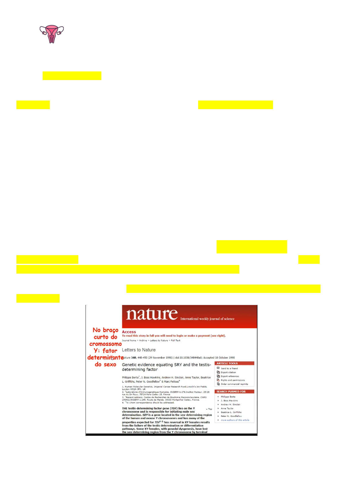 Emili Sis Urota Sistema Urinário- formação e eliminação da urina Sistema Genital - reprodução ● A determinação sexual inicia-se com a determinação do sexo genético na fecundação. ➞46 XX ➞46 XY GENÓTIPO: Determina o desenvolvimento gonadal, onde se tem ovários XX e testículos XY, determinados por tais cromossomos. O genótipo também determina o fenótipo do trato reprodutor. O trato reprodutor divide-se então em órgãos internos e genitália externa. ● Cas Herris Vedi (tes etar ora pen n em ôda) ● Pse-erris o sun (órão rdus ir feno/malo pe xna ciza/ feli). ● Agea gal (não mção da) ➞ Sexo genotípico, fenotípico e gonadal podem ser discordantes. Há muitas pesquisas sobre a determinação do sexo. Na década de 90, nesse artigo da Nature, pesquisadores determinaram que no braço curto do cromossomo Y é o local onde está alojado o fator determinante do sex o, gene muito importante para o início de uma cascata gênica que determina a formação das gônadas, a formação da genitália e a formação dos órgãos internos reprodutivos. Esse gene é determinado pela sigla SRY (“sex determining region of the Y chromosome”). S (“se tin ri f e Y come”) Este gene encontra-se no braço curto do cromossomo Y. SRY presente: desenvolvimento normal do macho. SRY ausente: desenvolvimento normal da fêmea. Hoje, sabe-se que SRY não age sozinho: o fator de transcrição Sox-9 é importante na determinação do sexo e está sempre relacionado com o desenvolvimento masculino, pois proporciona, juntamente com a expressão de SRY a formação de uma gônada em testículos. Forçã a Cr Gon (C’s: esã) Desenvolvimento de espermatozóides e ovócitos. Logo, a formação de espermatozóides e ovócitos vem da diferenciação das células germinativas primordiais, que se diferenciaram na 3° semana de desenvolvimento do tecido endodérmico do saco vitelínico. Iniciam sua migração na 4° semana de desenvolvimento para dentro do corpo embrionário. Na 5° semana, as células germinativas primordiais (CGP’s). terminam sua migração da parede do saco vitelino para as cristas gonadais, que são os primórdios das gônadas. Lembrando que as cristas gonadais (genitais) são derivadas do mesênquima, fazem parte do epitélio celômico. As gônadas influenciam no desenvolvimento e diferenciação das células germinativas primordiais (CGP’s). Forçã e Dfecção d Cta Gal CGP’s (ovogônias) em mulheres entram em meiose Logo, as cristas gonadais se diferenciam a partir do epitélio celômico, através de tecido mesodérmico. Além disso, sabe-se que as CGP’s, no embrião feminino entram em meiose, enquanto que no embrião masculino isso não acontece. A gametogênese masculina só começa quando o menino entra na puberdade, enquanto nas mulheres já houve um sinal para que as células germinativas primordiais ( são denominadas ovogônias ao migrarem para a região das futuras gônadas). Todas as ovogônias entram em um processo meiótico ainda no período intra útero, ou seja, ainda no período fetal. Qual é o sinal responsável para que as ovogônias possam entrar em meiose? ● Esse sinal é advindo de uma substância denominada ácido retinóico, produzido pelas células do mesonefro. Tanto em embriões femininos quanto embriões masculinos o mesonefro produz esse ácido retinóico, que é recebido de forma diferente pelas gônadas masculina e feminina. ● Nas gônadas masculinas, esse ácido retinóico será catabolizado através de uma substância, ou seja, de um gene secretado pelas células de Sertoli denominado Cyp26b1. Logo, podemos dizer que as células de Sert+oli emitem a expressão gênica do Cyp26b1, que por sua vez vai catabolizar o ácido retinóico. As CGP’s das gônadas masculinas (espermatogônias) não entram em meiose. *células de Sertoli são específicas das gônadas masculinas. ● As gônadas femininas não possuem células de Sertoli, e portanto não apresentam a capacidade de catabolização do ácido retinóico. O ácido retinóico vai estimular a entrada das ovogônias em meiose. Célu Smáis Sur Nas gônadas, além da presença das CGP’s (ovogônias e espermatogônias), algumas células de suporte serão importantes para manter essas ovogônias e espermatogônias nutridas e protegidas. As cristas estão presentes ventralmente ao mesonefro. Células do epitélio somático diferenciam-se nas células somáticas de suporte durante a 6° semana. Forçã e Dfecção d Gôda - Em homens, as células somáticas de suporte são as células de Sertoli e em mulheres são as células foliculares. Qual gene faz essa diferenciação? Entenderemos como esse sinal inicialmente produzido pelas células somáticas de suporte desencadeiam todo o desenvolvimento de órgãos internos reprodutivos, como também das próprias gônadas. Embrião em 5°/6° semanas: ductos mesonéfricos (Wol�), paramesonéfricos (Muller) e crista gonadal. ● Tanto em embriões masculinos quanto em embriões femininos nota-se um par de ductos e túbulos mesonéfricos, o par de gônadas de cristas gonadais formado por mesoderma no epitélio celômico, um par de ductos Mullerianos, queio também tem origem no epitélio celômico. ● Assim como os mesonefros se associam a cloaca em desenvolvimento, os ductos paramesonéfricos também apresentam uma associação com a cloaca. ● Os ductos paramesonéfricos também são denominados ductos de Muller, assim como os ductos mesonéfricos denominam-se ductos de Wol�. ● Em resumo, ainda na 6° semana, novas estruturas, como já citado, aparecem: são os ductos mullerianos (ductos paramesonéfricos, derivam do epitélio celômico) - ao lado dos ductos mesonéfricos do Sistema Urinário. ➞ Ductos mesonéfricos e mullerianos: presentes nos dois sexos. ● A partir da 7° semana, os sistemas reprodutores feminino e masculino seguem caminhos diferentes. Difciçã da Gôd -Qual é o fator inicial que vai desencadear