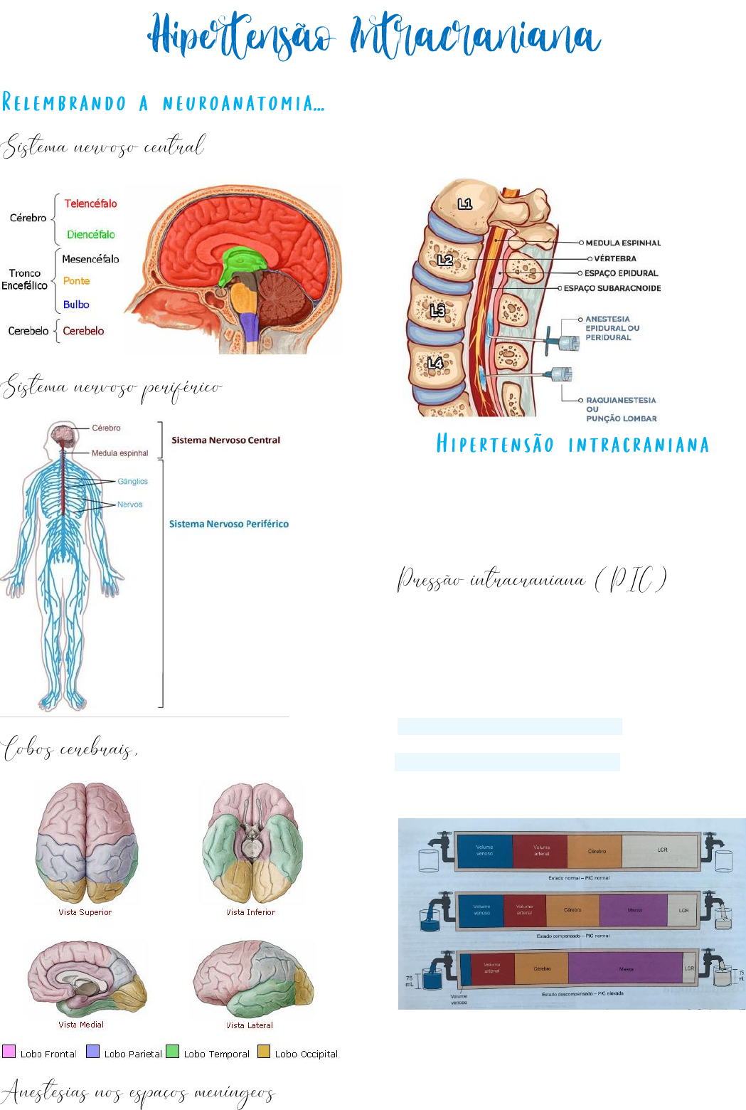 18/03/2022 Anestesia raquidiana: é introduzida no espaço subdural, entre: L2-L3, L3-L4 ou L4-L5. Anestesias epidurais: região lombar majoritária É caracterizada por uma pressão anormal dentro na cabeça. Causas: excesso de Liquor, processo de massa (tumor), sangramento etc. Parênquima cerebral (80-85%) Líquido cerebroespinhal (5-10%) Sangue (8-12%) Volume intracraniano= 1400 a 1700 ml Pressão intracraniana= 10 a 15 mmHg A aferição da PIC é por um cateter intracraniano. Quando há desequilíbrio no volume intracraniano, algum componente pode “vazar”, por isso é realizada a punção lombar, a fim de retirar um pouco do liquor, para deixar o cérebro se restabelecer. Também pode ser realizada a 18/03/2022 craniotomia para desinchar o cérebro, quando ele desincha a calota craniana é recolocada. Classificação de gravidade da PIC PIC até 15 mmHg Normal PIC entre 15 e 20 mmHg Levemente aumentada PIC entre 21 e 30 mmHg Moderadamente elevada PIC acima de 30 mmHg Gravemente elevada → Aumento da PIC; → Diminuição da Pressão de Perfusão Cerebral (PPC); → Diminuição do Fluxo Sanguíneo Cerebral (FSC) Leva a morte cerebral do paciente. Hipoxia tecidual – aumento da PCO2 – Diminuição do pH – Vasodilatação – edema cerebral – aumento adicional da PIC O aumento da PIC gera 3 consequências: → Isquemia: devido ao fluxo sanguíneo diminuído → Herniação: devido ao inchaço do cérebro → Morte encefálica.: consequência final PPC= PAM – PIC PPC fica entre 70 e 110 mmHg Em pacientes com HIC é importante manter a PPC entre 60 e 70 mmHg. PPC < 60 mmHg = isquemia PPC > 110 mmHg = encefalopatia hipertensiva, gerando o edema cerebral. → Alteração do nível de consciência • Confusão, agitação, sonolência e coma. → Tríade de Cushing: • Hipertensão arterial, bradicardia e respiração de Cheyne-Stokes. → Alteração pupilar: anisocoria, midríase bilateral com lentificação ou sem fotorreação, Exemplo: A: paciente normal. B: paciente com surgimento de massa IC, gerando HIC, acarretando no “vazamento” de sangue venoso e líquor. C: aumento da massa IC, aumentando a gravidade da HIC → Cefaleia; → Náuseas e ou vômitos; → Papiledema: papila edemaciadas; → Alteração da força (paresia ou plegia); → Alteração mental (déficit de memória, orientação, apatia, depressão); → Alteração de personalidade; → Alteração de nervos cranianos; → Crise convulsiva. → TCE; → AVC; → Tumores; → Cirurgias intracranianas; → Encefalopatia hepática; → Hidrocefalia 18/03/2022 → Otimizar a sedação para atingir o alvo de RASS -5 ➢ RASS –5: sem resposta a estimulo verbal. → É recomendado o propofol como primeira escolha entre os hipnóticos ➢ Dose de manutenção: 1 - 4 mg/g/h Cuidado com o uso do propofol! → Síndrome de infusão do propofol pode ocorrer principalmente com doses altas e/ou por tempo excedido. ▪ É caracterizada por uma acidose metabólica, hipercalemia, lipemia e colapso cardiovascular. ▪ Atenção com doses superiores ou por mais de 48h → É considerado o uso de midazolan em casos de instabilidade hemodinâmica. → A drenagem de liquido cefalorraquidiano é feita lentamente, apenas o suficiente para controlar a HIC. → Após o procedimento podem ser colocadas pequenas infusões de sangue do próprio paciente em torno da punção, pois o sangue irá coagular, bloqueando a saída/perda de LCR. Síndrome de punção pós raqui: é a cefaleia e fotofobia devido a retirada excessiva de LCR. Há também o uso de bloqueado neuromuscular. → Recomenda-se o uso de salina hipertônica como primeira escolha entre os agentes hiperosmolares. Como alvo, é necessário manter a osmolaridade plasmática abaixo de 300 Osm/L e o sódio plasmático entre 145 e 150 mEg/L → Dose sugerida: NaCl 20% 0,6 ml/kg IV em 5 minutos → Considerar o manitol nas doses de 0,25 a 1 g/kg. O manitol é diurético, tirando líquido do corpo e “jogando” para a corrente sanguínea. → Manter a PaCO2 alvo entre 30-35 mmHg por curtos períodos. → Considerar a hiperventilação agressiva com algo de PaCO2 entre 25-30 mmHg; → É preciso monitorar a relação entre a oferta/demanda de O2 pelo tecido cerebral → Monitorização da saturação venosa no bulbo jugular (SvjO2), ou da tensão de O2 no tecido cerebral (PbO2), monitora-se através da gasometria arterial. → Para controlar a HIC refratária ao tratamento de primeira linha. Ou seja, são usados caso as medidas de primeira linha tenham sido realizadas, porém o paciente voltou a ter HIC. 18/03/2022 → Atentar para instabilidade hemodinâmica durante a administração do tiopental. → Temperatura alvo: 32 – 34 °C; - A hipotermia faz com que haja uma atividade cerebral diminuída, preservando a massa. → OBS: não é recomendada a hipotermia profilática. → É considerada somente se nenhuma medida solucionar. → Uma parte da calota craniana é retirada a fim de amenizar a pressão. - A calota é “guardada” no peritônio. → Tratar a causa primária; → Diminuição da PIC: Monitorar para ficar menor que 20 mmHg e a PPC maior que 60 a 70 mmHg. → Elevar a cabeceira do leito de 15 a 30°; → Posição neutra da cabeça. → Evitar a hipotensão, pois gera: ▪ Queda da PPC; ▪ Isquemia cerebral; ▪ Aumento da PIC. → PAM< 90 mmHG a 110 mmHg → O aumento do metabolismo cerebral resulta em aumento do FSC e da PIC; → O aumento do metabolismo sem aumento do FSC pode levar a isquemia e lesão regional; → Hipertermia aumenta o metabolismo cerebral e a PIC; → Evitar crises convulsivas, pois aumenta a PIC. → A hiperglicemia pode causar lesão cerebral secundária; → Manter glicose abaixo de 150 mg/Dl; → Evitar a hipoglicemia, pois também lesiona as células. → Derivação do ventrículo peritoneal (DVP): cateter inserido no cérebro, que passa por dentro da pele até o peritônio → Derivação lombar externa (DLE) → Causa um