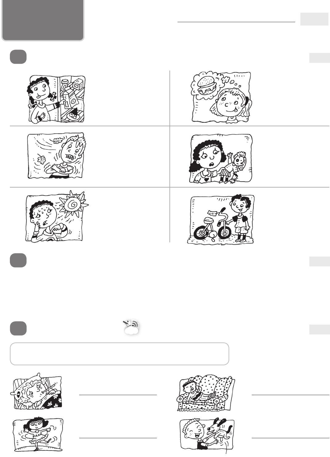 Unit 1 Test page 1 Circle. / 6A Match. / 3B (A) hungry (B) thirsty (C) sad (D) bored (A) excited (B) sick (C) thirsty (D) cold (A) hungry (B) thirsty (C) tired (D) sick (A) sad (B) happy (C) thirsty (D) hungry 1. 3. 5. 1. he is • • she’s 2. she is • • isn’t 3. is not • • he’s 2. 4. 6.(A) cold (B) sick (C) hot (D) hungry (A) sad (B) tired (C) happy (D) hot Listen and write. 0203 / 4C Yes, she is. No, she isn’t. Yes, he is. No, he isn’t. 1. 2. 3. 4. Name: / 29 Everybody Up 2 © Oxford University Press. Permission granted to reproduce for instructional use. EU2e_TRC2_UT1.indd 132 5/25/16 11:04 AM Write. / 6D Write. / 10E Name:Unit 1 Test page 2 1. 2. 3. 4. 5. 1. 2. What’s 3. My finger 4. Are you 5. I so. What can he see? He can a What can he smell? He can What can she touch? She can a She can He can a OK wrong think hurts Ouch Thanks taste see dog car smell hear cat pizza touch ice cream © Oxford University Press. Permission granted to reproduce for instructional use. Everybody Up 2 EU2e_TRC2_UT1.indd 133 5/25/16 11:04 AM