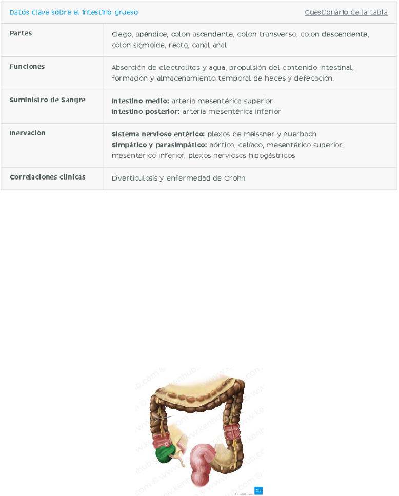 Colon El intestino grueso, también conocido como colon, representa la última parte del tracto gastrointestinal. Abarcando las cavidades abdominal y pélvica, tiene una longitud de aproximadamente 1,5 metros, ¡casi igual a la altura de un adulto completamente desarrollado. El intestino grueso es el lugar en donde se forman las heces por la absorción de agua del contenido intestinal que sucede durante la digestión. Además de su papel en la formación, almacenamiento y posterior defecación de las heces, el intestino grueso también alberga una extensa microflora que es fundamental para nuestra supervivencia. El intestino grueso es responsable de varias funciones importantes: absorción de electrolitos (sodio, potasio, cloruro) y agua (1 L / día), propulsión del contenido intestinal, formación de heces, su almacenamiento temporal y la defecación. El intestino grueso alberga la microflora fisiológica, que es rica en bacterias anaeróbicas (aproximadamente 1011 / g) que viven en simbiosis con el cuerpo humano. Cumplen funciones esenciales como descomponer ingredientes alimentarios no digeribles (por ejemplo, celulosa), producir vitamina K, promover la peristalsis intestinal y apoyar el sistema inmunológico. Ciego El ciego es la primera parte del intestino grueso y se encuentra en la fosa ilíaca derecha del abdomen. El ciego es intraperitoneal con varios pliegues y bolsas (recesos peritoneales retrocecales) que lo rodean. El íleon terminal se une al ciego en la unión ileocólica. El orificio ileocecal está marcado por la papila ileal, que consta de dos pliegues llamados labios ileocecales (superior e inferior). Los pliegues se fusionan alrededor del orificio, formando la frenula del orificio ileal, que evita el reflujo del contenido cecal hacia el íleon. La válvula ileocecal regula el paso del contenido intestinal del intestino delgado al grueso. Las funciones del ciego implican el almacenamiento temporal de quimo, la reabsorción de líquidos y electrolitos. Apéndice El apéndice vermiforme es una bolsa linfoide ciega ubicada en la fosa ilíaca derecha que surge del ciego. Estas dos partes del intestino grueso están conectadas por el mesoapéndice. El apéndice tiene un papel en el mantenimiento de la flora intestinal y la inmunidad de las mucosas. Colon Ascendente La porción del intestino grueso ubicada entre el ciego y el recto se denomina colon. Consta de cuatro partes; ascendente, transverso, descendente y sigmoide. Las principales funciones del colon incluyen la reabsorción de líquidos y electrolitos. Además, la microflora genera energía a través de un proceso llamado fermentación. El colon ascendente viaja a través de la fosa ilíaca derecha, flanco derecho y la región del hipocondrio derecha. Termina en la flexura cólica derecha (hepática). El colon ascendente es retroperitoneal y está conectado a la pared abdominal posterior por la fascia de Toldt. Un surco o receso vertical profundo (canalón paracólico derecho) se encuentra entre el colon ascendente y la pared abdominal lateral. El colon ascendente está involucrado en la reabsorción de líquidos y electrolitos, formando gradualmente materia fecal. Colon Transverso El colon transverso es la segunda parte principal del colon. Se extiende entre las flexuras cólicas (esplénicas) derecha e izquierda, abarcando el hipocondrio derecho, epigastrio e hipocondrio izquierdo del abdomen. La curvatura mayor del estómago y el ligamento gastrocólico son superiores al colon transverso, mientras que el epiplón mayor cuelga y se extiende hacia abajo. El colon transverso es intraperitoneal. Un mesenterio peritoneal (mesocolon transverso) lo une a la pared posterior de la bolsa omental (epiploica). Esto forma dos compartimentos abdominales llamados compartimentos supracólico e infracólico. Colon Descendente El colon descendente se extiende entre la flexura cólica izquierda y el colon sigmoide. Viaja por el hipocondrio izquierdo, flanco izquierdo y fosa ilíaca izquierda. El canalón paracólico izquierdo se encuentra entre el colon descendente y la pared abdominal lateral. Esta parte del colon es retroperitoneal. La fascia de Toldt fija el colon descendente a la pared abdominal posterior. Colon Sigmoideo El colon sigmoideo en forma de S viaja desde la fosa ilíaca izquierda hasta la tercera vértebra sacra (unión rectosigmoidea). Esta parte del colon es intraperitoneal. Está conectado a la pared pélvica por el mesocolon sigmoide. Recto El recto se extiende entre la unión rectosigmoidea y el canal anal. Las características típicas del intestino grueso (tenia coli, haustra, apéndices epiploicos) cambian o incluso terminan en el recto. Las funciones del recto incluyen el almacenamiento temporal de materia fecal y la defecación. El recto tiene una forma de S característica marcada por varias curvas o vueltas; flexuras sacras, anorrectales y laterales. Estos últimos corresponden a tres pliegues llamados pliegues rectales transversales. El recto termina en una ampolla dilatada. El recto es parcialmente intraperitoneal ya que el tercio inferior es subperitoneal. El peritoneo se refleja desde el recto hacia la vejiga en los hombres (bolsa rectovesical) y el fondo de saco vaginal en las mujeres (bolsa rectouterina o bolsa de Douglas). Los espacios alrededor del recto son propensos a contraer infección, formar abscesos y muchas otras patologías. Por lo tanto, se debe tener una comprensión clara de su anatomía, la cual puedes encontrar a continuación. Canal anal El canal anal forma la parte terminal del tubo digestivo. Se extiende desde la unión anorrectal hasta el ano. Este último representa el orificio externo de la parte final del sistema digestivo. La mucosa de la mitad superior del canal anal contiene crestas llamadas columnas anales. Las porciones inferiores de estas columnas contienen válvulas anales, que están rodeadas por senos anales. Estos últimos son los encargados de segregar moco lubrica