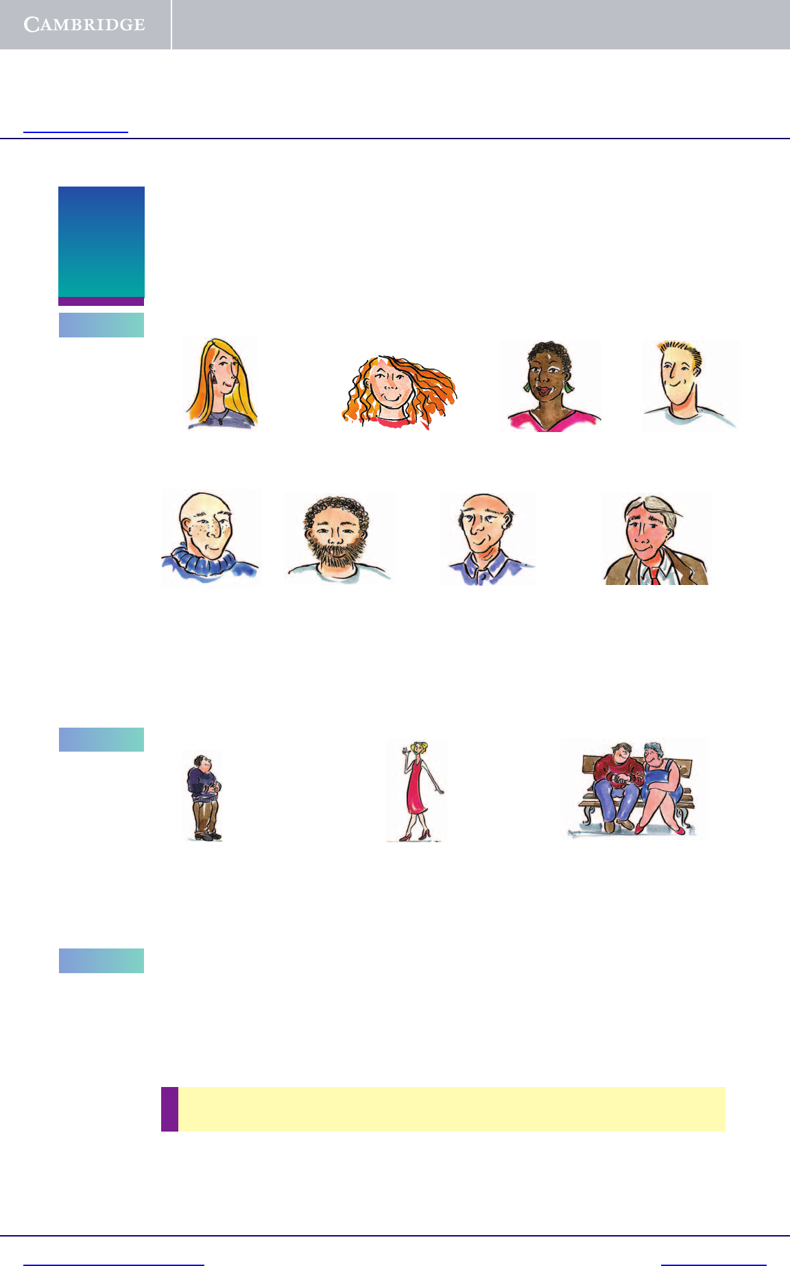 Hair, face, skin and complexion /kəm�plekʃən/ 76 English Vocabulary in Use (Upper-intermediate) Describing people: appearance A B C 37 She’s got long, wavy hair and she’s round-faced (or she’s got a round face). She’s got straight hair and she’s thin-faced (or she’s got a thin face). He’s got a beard and moustache /məs�t�ʃ/ and has a chubby face. He’s bald /bɒld/ and has freckles. He’s got receding hair and a few wrinkles /�riŋkəlz/. He used to have black hair but now it’s gone grey, almost white. She’s got curly hair and is dark-skinned (or she’s got dark skin). He’s got a crew-cut. What sort of person would you find attractive? Blonde, fair, dark or ginger-haired / red-haired. She has such beautiful auburn hair. /�ɔ�bən/ [red-brown] Fair and dark can be used for hair, complexion or skin. Height and build a rather plump or stout man Fat may sound impolite. Instead we often say a bit overweight. If someone is broad and solid, we can say they are stocky. A person with good muscles can be well-built or muscular. If someone is terribly thin and refuses to eat, they may be anorexic /�nə�reksik/. General appearance She’s a very smart and elegant woman, always well-dressed; her husband is quite the opposite, very scruffy and untidy-looking / messy-looking. He’s very good-looking, but his friend’s rather unattractive. Do you think beautiful women are always attracted to handsome men? I don’t. I think personality matters most. First impressions are always important. [your first reaction to someone] a slim woman [positive] a skinny person [rather negative] an obese couple /əυ�bi�s/ [negative, very fat] The suffix -ish is useful for describing people (see Unit 8). She’s tallish. He has brownish hair. He must be thirtyish.T I P © Cambridge University Press www.cambridge.org Cambridge University Press 978-0-521-66435-6 - English Vocabulary in Use Upper-Intermediate Michael McCarthy and Felicity O’Dell Excerpt More information http://www.cambridge.org/0521664357 http://www.cambridge.org http://www.cambridge.org 37.1 Answer these remarks with the opposite description. EXAMPLE A: I thought you said he was the short, chubby one. B: No, no, no, not at all, he’s the tall, thin-faced one. 1 A: Was that his brother, the dark-skinned, wavy-haired one? B: No, completely the opposite, his brother’s … 2 A: She’s always quite well-dressed, so I’ve heard. B: What! Who told you that? Every time I see her, she’s … 3 A: So Charlene’s that rather plump, fair-haired woman, is she? B: No, you’re looking at the wrong one. Charlene’s … 4 A: So, tell us about the new boss; good looking? B: No, I’m afraid not; rather … 5 A: I don’t know why, but I expected the tour-guide to be middle-aged or elderly. B: No, apparently she’s only … 37.2 Write one sentence to describe each of these people, giving information about their hair and face, their height and build and general appearance. 1 you yourself 3 a neighbour 2 your best friend 4 your ideal of a handsome man / a beautiful woman Now, in the same way, describe somebody very famous, give some extra clues about them, e.g. He’s/She’s a pop star/politician. Can someone else guess who you are describing? 37.3 From these jumbled words, find combinations for describing people, as in the example. Not all of the words are on the left-hand page. Some of the combinations are hyphenated. Use a dictionary if necessary. You can use the words more than once. EXAMPLE good-looking 37.4 WANTED! MISSING! Complete the gaps in these police posters. English Vocabulary in Use (Upper-intermediate) 77 Exercises looking middle stocky long overround haired well faced good mixed complexion agedred build dressed weightrace legged tanned WANTED FOR MURDER Ian Prowse White, height 6ft, ...........................-faced, ........................... hair, ........................... skin Wanted dead or alive Jack ‘Dagger’ Flagstone 6ft ........................... , with .................. and ..........; ........................... build. Missing Louise Fox age 7, Asian appearance ...................................., ..................................... hair. Wanted for Armed Robbery Sandra King White, height 5ft 4, ........................... hair, ........................... build, ...........................-faced Follow-up: Make a collection of descriptions of people from newspapers and magazines. Court/crime reports, celebrity and gossip pages of magazines, and the personal columns where people are seeking partners are good places to start. © Cambridge University Press www.cambridge.org Cambridge University Press 978-0-521-66435-6 - English Vocabulary in Use Upper-Intermediate Michael McCarthy and Felicity O’Dell Excerpt More information http://www.cambridge.org/0521664357 http://www.cambridge.org http://www.cambridge.org