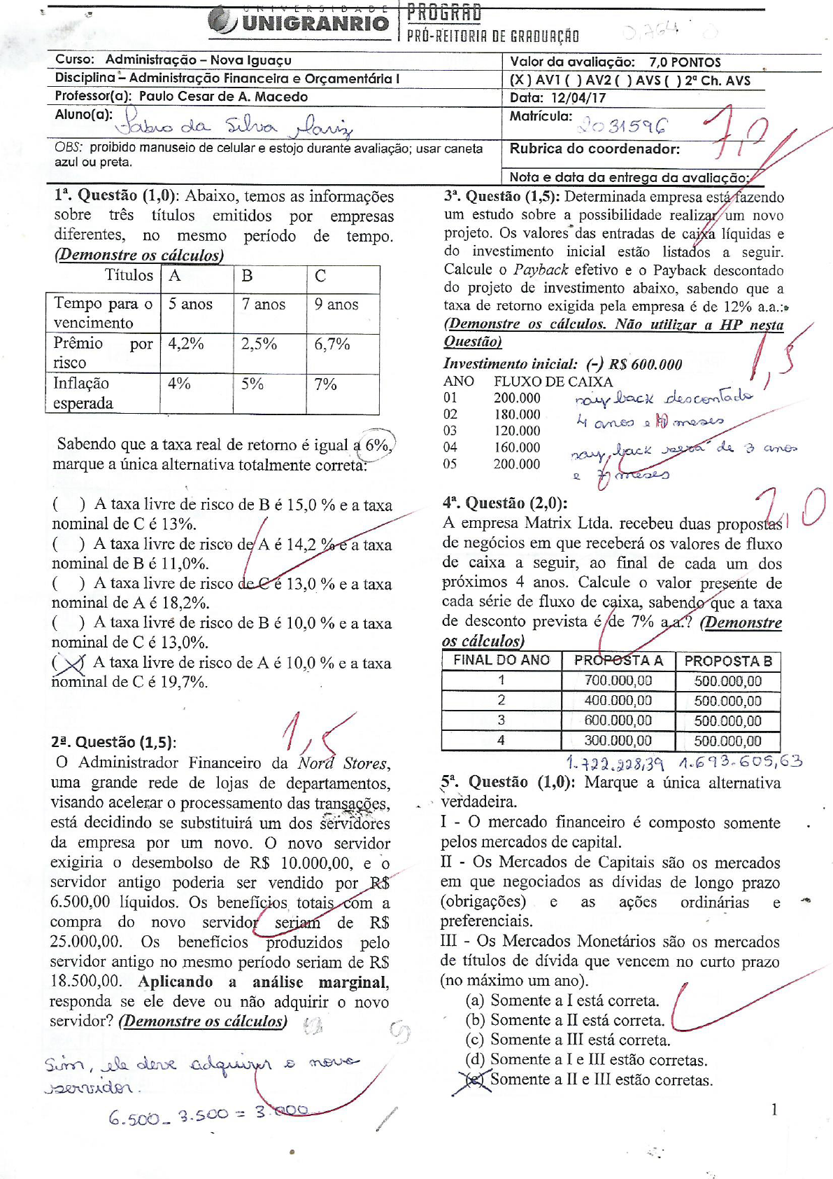Determinado empresa está fazendo um estudo sobre a possibilidade realizar um novo projeto. Os valores das entradas de líquidas e do investimento inicial estão listados a seguir. Calcule o Payback efetivo e o Payback descontado do projeto de investimento abaixo, sabendo que a taxa de retorno exigida pela empresa é de 12%. (Demonstre os cálculos. Não utilizar a HP nesta Questão) Títulos A B C Tempo para o vencimento: 5 anos 7 anos 9 anos Prêmio por risco: 4,2% 2,5% 6,7% Inflação esperada: 4% 5% 7% Investimento inicial: (-) R$ 600.000 ANO FLUXO DE CAIXA 01 200.000 02 180.000 03 120.000 04 160.000 05 200.000
