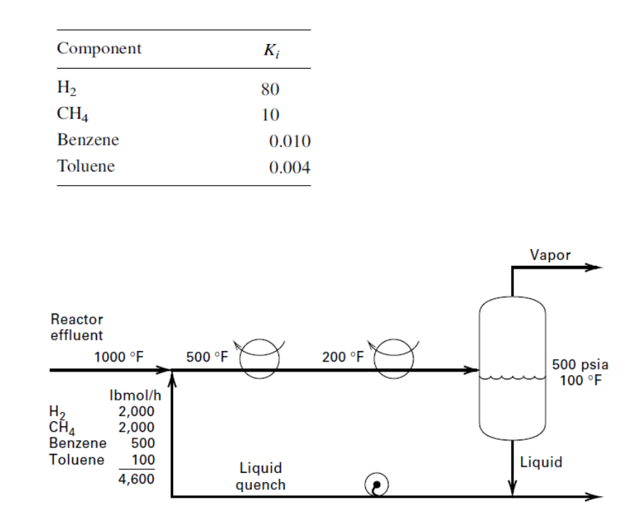 Lista de exercícios Destilação 1-Exercise Cooling of a reactor effluent with recycled liquid. Figure 1 shows a system to cool reactor effluent and separate light gases from hydrocarbons. K-values at 500 psia and 100ºF are: Figure 1. Conditions for Exercise 1. (a) Calculate composition and flow rate of vapor leaving the flash drum. (b) Does the liquid-quench flow rate influence the result? Prove your answer analytically. 2-Exercise A column at 101 kPa is to separate 30 kg/h of a bubble-point solution of benzene and toluene containing 0.6 mass-fraction toluene into an overhead product of 0.97 mass- fraction benzene and a bottoms product of 0.98 mass-fraction toluene at a reflux ratio of 3.5. The feed is sent to the optimal tray, and the reflux is at saturation temperature. Determine the: (a) top and bottom products and (b) number of stages using the following vapor–liquid equilibrium data. Ans: a) D = 12.1 kg/h B = 17.9 kg/h b) 10 stages + a partial reboiler acting as an equilibrium stage are required. 3-Exercise A mixture of 54.5 mol% benzene in chlorobenzene at its bubble point is fed continuously to the bottom plate of a column containing two equilibrium plates, with a partial reboiler and a total condenser. Sufficient heat is supplied to the reboiler to give Vm+1/LM = 0.855, and the reflux ratio LN/VN+1 in the top of the column is constant at 0.50. Under these conditions using the equilibrium data below, what are the compositions of the expected products? Ans: benzene, xD = 0.90 and xB = 0.28. 4-Exercise 5-Exercise 6-Exercise 4,7 theoretical plates Lista de Ponchon Savarit 1-Exercise 2-Exercise 3-Exercise 4-Exercise 5-Exercise One hundre pound-moles per hour of a mixture of 60 mole% metanol in water at 30ºC and 1 atm is to be separated by distillation at the same pressure into a distillate containing 98 mole% methanol and a bottoms product containing 96 mole% methanol and a bottoms product containing 96 mole% water. The overhead condenser will produce a subcooled at 40ºC determine by the Ponchon method: a) the minimum cold external reflux in moles per mole distillate. b) The number of theoretical stages required for total reflux. c) The mumber of theoretical stages required for a cold external reflux of 1.3 times the minimum. d) the internal reflux ratio leaving the top stage, the stage above the feed stage, the stage below the feed stage, and the bottom stage leading to reboiler. e) The duties in BTU/hr of the reboiler and condenser. f) The temperature of the top stage and the feed stage. g) All the items in part (c) to (f) if a boilup ratio of 1.3 times the minimum value is used. 6-Exercise
