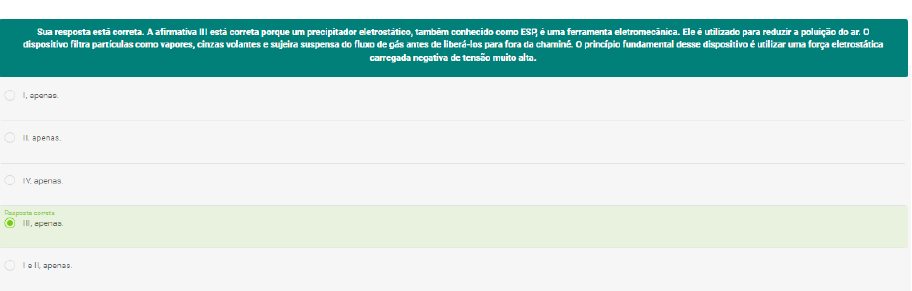 Uma usina termelétrica é uma usina que converte energia térmica em energia elétrica. Essas usinas de energia fazem tal processo, principalmente, aquecendo combustíveis fósseis, os quais transformam a água em vapor. Desse modo, essas usinas térmicas podem liberar muitos gases que são prejudiciais para o meio ambiente. Considerando o excerto apresentado a respeito dos equipamentos instalados nas usinas para reduzir a poluição do ar, analise as afirmativas a seguir. I. Instalação de filtro de ar. II. Instalação de filtro HEPA. III. Instalação de precipitador eletrostático. IV. Instalação de filtro de areia. Está correto o que se afirma em: Antes de entrar na caldeira, é necessário controlar a temperatura da água de alimentação da caldeira e sua qualidade. Isso envolve a introdução de tratamento e aquecimento que fornecerão as condições ideais para uma longa vida útil da caldeira. Considerando o excerto apresentado, a respeito das usinas termelétricas e a importância de aquecer a água antes de alimentar a caldeira, analise as afirmativas a seguir. I. Os gases dissolvidos que corroem a caldeira são removidos. II. O estresse térmico surge devido à água fria que entra na caldeira e pode ser reduzido. III. Algumas impurezas transportadas pelo vapor e condensadas devido à corrosão na caldeira e ao condensador são precipitadas fora da caldeira. IV. Os gases dissolvidos que corroem a caldeira são misturados à água quente. Está correto o que se afirma em: