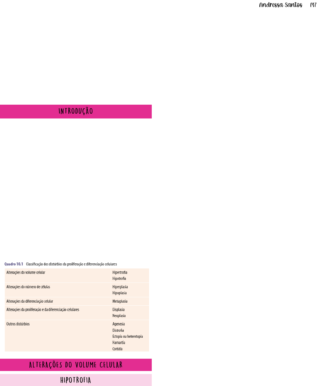 – Distúrbios da Proliferação e da Diferenciação Celulares Proliferação e diferenciação celulares são processos complexos e altamente controlados por um sistema integrado que mantém a população celular dentro de limites fisiológicos. Alterações no processo regulatório resultam em distúrbios ora da proliferação, ora da diferenciação, ora das duas simultaneamente. As lesões resultantes são muito numerosas e têm enorme impacto na prática médica, por sua alta prevalência e gravidade; o câncer, em particular, é importante problema de saúde-doença em todo o mundo. • Hipotrofia consiste na redução dos componentes e das funções celulares, acarretando a diminuição do volume das células e dos órgãos. • Hipotrofia resulta de menor síntese de proteínas ou, sobretudo, de maior degradação delas. • Deficiência nutricional, desuso e agressão a proteínas por radicais livres são as causas mais frequentes de hipotrofia; proteínas modificadas são ubiquitinadas e levadas aos proteassomos, onde são degradadas. Hipotrofia pode ser fisiológica ou patológica. A primeira ocorre na senilidade, quando todos os órgãos e sistemas reduzem suas atividades. Como afeta todo o indivíduo, não há prejuízo funcional importante. Hipotrofia patológica resulta de: (1) deficiência nutricional, que resulta em hipotrofia generalizada; (2) desuso, que ocorre em órgãos ou tecidos que ficam sem uso por algum tempo, por exemplo músculos esqueléticos imobilizados; (3) compressão por tumores, cistos, aneurismas etc.; (4) obstrução vascular. Sem O2 e nutrientes, surge hipotrofia; (5) substâncias tóxicas, como na intoxicação por chumbo (hipotrofia dos músculos dos antebraços); (6) redução de hormônios causa hipotrofia de células e órgãos-alvo: deficiência de gonadotrofinas, por exemplo, leva à hipotrofia das gônadas; (7) inervação. Sem estimulação nervosa, surge hipotrofia muscular, como nos músculos dos membros inferiores na poliomielite; (8) inflamações crônicas. As consequências da hipotrofia dependem do órgão, da intensidade e do contexto em que acontece. Na hipotrofia senil, as consequências são menores porque há redução das atividades em todos os órgãos e sistemas. Na hipotrofia localizada, ocorrem diminuição da atividade e da função do órgão. – Hipertrofia é o aumento dos componentes e das funções celulares, o que amplia o volume das células e dos órgãos. Para haver hipertrofia, são necessários: a) fornecimento de O2 e de nutrientes para suprir o aumento de exigência das células; b) integridade das células, uma vez que células lesadas não se hipertrofiam; c) estímulo nervoso, em células musculares. Hipertrofia é uma adaptação à maior exigência de trabalho e pode ser fisiológica ou patológica. Hipertrofia fisiológica ocorre em: (1) útero na gravidez; (2) musculatura esquelética, como acontece em atletas ou em trabalhadores que fazem grande esforço físico. Hipertrofia patológica surge em: (1) miocárdio, quando há sobrecarga do coração por obstáculo ao fluxo sanguíneo ou por aumento do volume de sangue; (2) musculatura lisa de órgãos ocos, quando há obstrução (p. ex., hipertrofia da bexiga, na hiperplasia da próstata); (3) neurônios motores no hemisfério cerebral não lesado em caso de hemiplegia. Os estímulos causadores de hipertrofia induzem genes que codificam fatores de crescimento, receptores de fatores de crescimento e proteínas estruturais. Os órgãos hipertróficos tornam-se aumentados de volume e de peso. As células mostram núcleo, citoplasma e organelas aumentados de volume; em células perenes (p. ex., miocardiócitos), surge poliploidia nuclear. Hipertrofia é reversível. Após o parto, por exemplo, o útero volta às suas dimensões normais. Hipoplasia é a diminuição do número de células de um órgão ou parte do corpo, o que reduz seu peso e volume. Pode ocorrer na embriogênese (hipoplasia pulmonar, hipoplasia renal etc.) ou após o nascimento, por diminuição da renovação celular, aumento da destruição das células ou ambos. Hipoplasia pode ser fisiológica ou patológica. (1) As hipoplasias fisiológicas mais comuns são involução do timo a partir da puberdade e de gônadas no climatério. Na senilidade, além de hipotrofia também existe hipoplasia de órgãos, por aumento de apoptose. (2) As hipoplasias patológicas mais importantes são a da medula óssea por agentes tóxicos ou infecções, a qual causa anemia aplásica (mais corretamente, hipoplásica). Outra hipoplasia comum é a de órgãos linfoides na AIDS ou por destruição de linfócitos por corticoides. Hipoplasia patológica pode ser reversível. – Muitas vezes, hipotrofia e hipoplasia andam juntas. Na prática, o termo mais usado para indicar um órgão reduzido de volume é hipotrofia, embora em geral exista também hipoplasia. Hiperplasia, que ocorre somente em órgãos com células capazes de se multiplicar, consiste no aumento do número de células, por incremento da proliferação e/ou por diminuição da destruição celular. Para haver hiperplasia são necessários suprimento sanguíneo, integridade morfofuncional das células e inervação. A hiperplasia é causada por agentes que estimulam funções celulares; trata-se também de adaptação das células à sobrecarga de trabalho. Muitas vezes, um órgão apresenta tanto hipertrofia quanto hiperplasia, pois uma mesma causa pode desencadear os dois processos. Hiperplasia, que é um processo reversível, pode ser fisiológica ou patológica. Hiperplasia fisiológica ocorre no útero durante a gravidez, nas mamas na puberdade e na lactação, e na hiperplasia compensadora (p. ex., no rim após nefrectomia ou lesões graves do outro rim). A principal causa de hiperplasia patológica é hiperestimulação hormonal. Na hiperfunção da hipófise, todas as glândulas- alvo dos hormônios produzidos em excesso entram em hiper