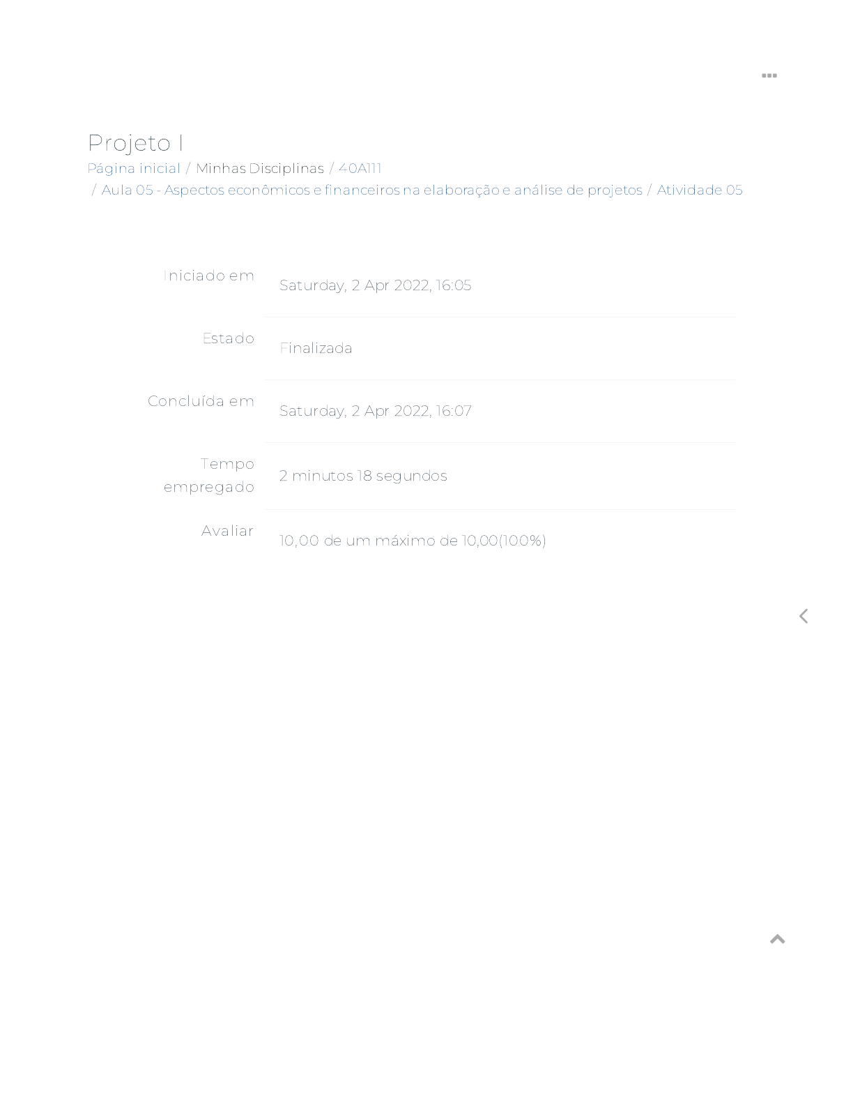06/04/2022 08:19 Atividade 05 https://ava.politecnicabr.com.br/mod/quiz/review.php?attempt=2839857 1/7 Página inicial / Minhas Disciplinas / 40A111 / Aula 05 - Aspectos econômicos e �nanceiros na elaboração e análise de projetos / Atividade 05 Projeto I Iniciado em Saturday, 2 Apr 2022, 16:05 Estado Finalizada Concluída em Saturday, 2 Apr 2022, 16:07 Tempo empregado 2 minutos 18 segundos Avaliar 10,00 de um máximo de 10,00(100%) https://ava.politecnicabr.com.br/ https://ava.politecnicabr.com.br/course/view.php?id=1052 https://ava.politecnicabr.com.br/course/view.php?id=1052#section-6 https://ava.politecnicabr.com.br/mod/quiz/view.php?id=28119 https://ava.politecnicabr.com.br/ 06/04/2022 08:19 Atividade 05 https://ava.politecnicabr.com.br/mod/quiz/review.php?attempt=2839857 2/7 Questão 1 Correto Atingiu 1,50 de 1,50 No modelo grá�co que representa um �uxo de caixa, o eixo horizontal representa que tipo de variável? Escolha uma opção: a. As contribuições negativas. b. O tempo para o �nal do projeto. c. O tempo em que ocorrem os movimentos. d. As contribuições positivas. https://ava.politecnicabr.com.br/ 06/04/2022 08:19 Atividade 05 https://ava.politecnicabr.com.br/mod/quiz/review.php?attempt=2839857 3/7 Questão 2 Correto Atingiu 1,50 de 1,50 Para conseguir obter �nanciamento externo para um empreendimento uma empresa deve cumprir com alguns pré-requisitos junto às instituições �nanceiras do mercado. Não faz relação com o escrito acima a opção: Escolha uma opção: a. Demonstrar a viabilidade �nanceira do empreendimento. b. Possuir recursos próprios para desenvolver uma parte substancial do projeto. c. Permitir o acompanhamento e comparação entre performance planejada e alcançada, possibilitar a análise de distorções e orientar planejamentos futuros. d. Dar garantias reais de capacidade de cumprir com os compromissos �nanceiros assumidos. https://ava.politecnicabr.com.br/ 06/04/2022 08:19 Atividade 05 https://ava.politecnicabr.com.br/mod/quiz/review.php?attempt=2839857 4/7 Questão 3 Correto Atingiu 1,25 de 1,25 Podemos a�rmar que o termo payback signi�ca o período de retorno de um investimento. Escolha uma opção: Questão 4 Correto Atingiu 1,50 de 1,50 No processo de priorização de projetos, podem ocorrer eventoso processo de priorização de projetos que modi�quem uma ordem pré-estabelecida. Qual das alternativas abaixo melhor representa um evento que poderá modi�car uma priorização já de�nida? Escolha uma opção: Verdadeiro Falso a. Calendário de eventos do município. b. Mudança na rede de computadores. c. Atendimento à legislação �scal. d. Mudança do escritório de um projeto. https://ava.politecnicabr.com.br/ 06/04/2022 08:19 Atividade 05 https://ava.politecnicabr.com.br/mod/quiz/review.php?attempt=2839857 5/7 Questão 5 Correto Atingiu 1,50 de 1,50 Um sistema e�ciente de avaliação precisa ser composto de três partes. Não faz parte de uma dessas partes a opção: Escolha uma opção: Questão 6 Correto Atingiu 1,25 de 1,25 Podemos a�rmar que o sistema de avaliação tem por objetivo principal a melhoria de valor para o acionista. Escolha uma opção: a. Avaliação b. Monitoramento c. Validação d. Controle Verdadeiro Falso https://ava.politecnicabr.com.br/ 06/04/2022 08:19 Atividade 05 https://ava.politecnicabr.com.br/mod/quiz/review.php?attempt=2839857 6/7 Questão 7 Correto Atingiu 1,50 de 1,50 Uma adequada gestão na utilização dos ativos pode levar à obtenção de alguns benefícios. Qual das alternativas abaixo não representa um benefício dessa gestão adequada? Escolha uma opção: a. Aumento na disponibilidade dos equipamentos. b. Inventário adequado de materiais. c. Redução do valor gasto em horas extras. d. Maior e�ciência na seleção de projetos. Entre em Contato https://www.politecnicabr.com.br 0800 084 2627 indisponível dev ido a pandemia de COVID-19, use outro canal! 0800 084 2627 comercial@politecnicabr.com.br Links Úteis Dicas da nossa Diretora Acadêmica Planner de Estudos Declaração de Matrícula Orientações do AVA Abertura de Ticket Fale com o Tutor Cronograma de Estudos Manual de Estágio Manual de Competência https://www.politecnicabr.com.br/ mailto:comercial@politecnicabr.com.br https://soundcloud.com/user-501638417/sets/escola-politecnica-brasileira https://storage.googleapis.com/sirius-pubstore/semestre_plannerdeestudo%20poli.pdf https://storage.googleapis.com/sirius-pubstore/declaracao_matricula.pdf https://storage.googleapis.com/sirius-pubstore/orientacoes_ava.pdf https://storage.googleapis.com/sirius-pubstore/abertura_ticket.pdf https://storage.googleapis.com/sirius-pubstore/fale_com_tutor.pdf https://storage.googleapis.com/sirius-pubstore/cronograma_estudos.pdf https://storage.googleapis.com/sirius-pubstore/manual_estagio.pdf https://storage.googleapis.com/sirius-pubstore/manual_competencia.pdf https://ava.politecnicabr.com.br/ 06/04/2022 08:19 Atividade 05 https://ava.politecnicabr.com.br/mod/quiz/review.php?attempt=2839857 7/7 © 2022 - Escola Politécnica Brasileira Siga-nos nas redes sociais https://ava.politecnicabr.com.br/mod/quiz/0 https://www.facebook.com/politecnicabr https://www.instagram.com/politecnicabr_oficial https://ava.politecnicabr.com.br/