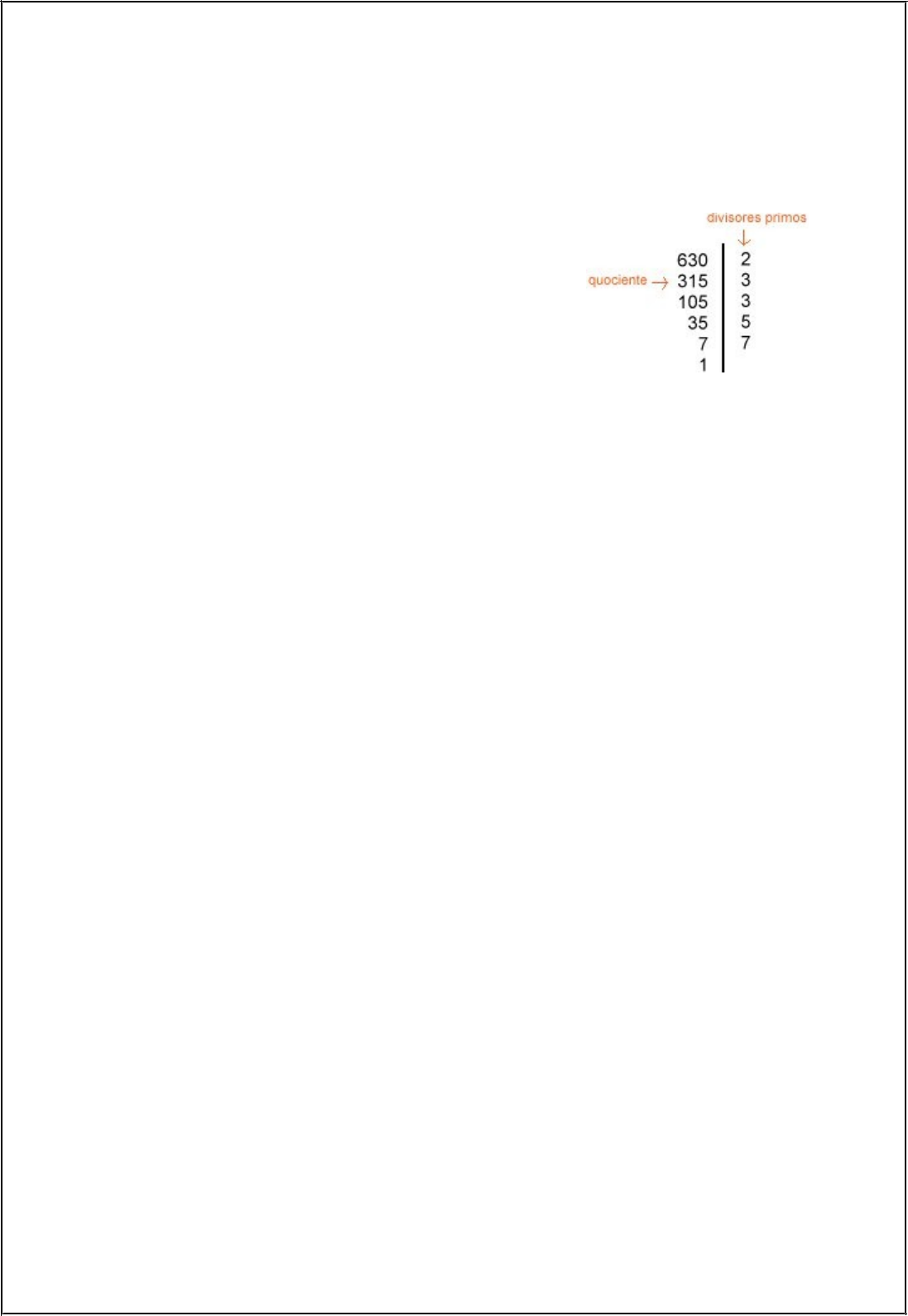 Regra prática para a fatoração – 6º ANO/2016 Existe um dispositivo prático para fatorar um número. Acompanhe, no exemplo, os passos para montar esse dispositivo: 1º) Dividimos o número pelo seu menor divisor primo; 2º) a seguir, dividimos o quociente obtido pelo menor divisor primo desse quociente e assim sucessivamente até obter o quociente 1. A figura ao lado mostra a fatoração do número 630. Então: 630 = 2 x 3 x 3 x 5 x 7 Ou 630 = 2 x 32 x 5 x 7. ATIVIDADES 1) Decomponha os números em fatores primos: a) 180 b) 220 c) 320 d) 605 2) Qual é o número cuja fatoração é: a) 2 . 2. 3 . 5 . 7 = b) 3 . 3 . 5 . 5 . 7 = c) 2 . 3 . 5 . 7 = d) 5 . 5 . 11 . 13 =