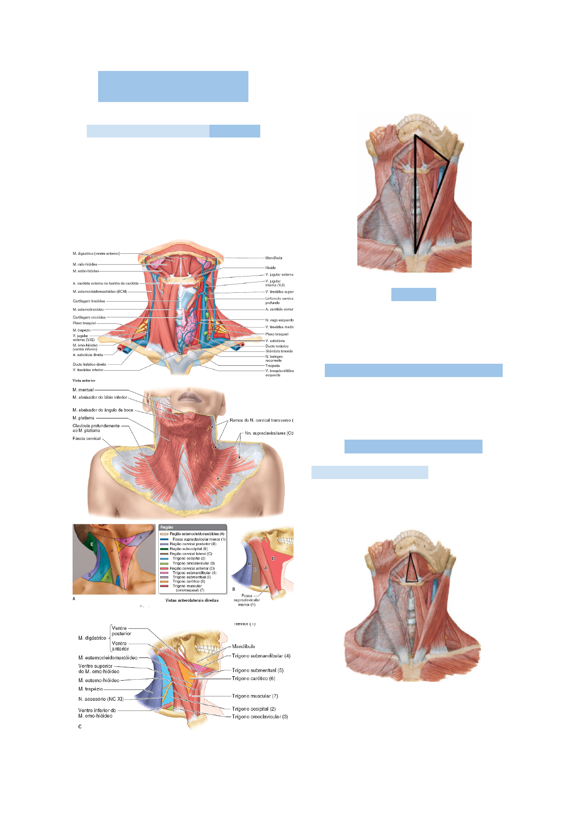 Anatomi� d� pescoç� técnica dos triângulos Importante ressaltar os músculos ● M. Digástrico ● M. Milo-hióideo ● M. Estilo-hioideo. ● M. Esternocleidomastoideo ● M. Esternotireóideo ● M. trapézio ● M. Omo-hióideo Trígono anterior e posterior Triângulo anterior do pescoço Limites: ● Medial: Linha mediana ● Lateral: M ECM ● Superior: Mandíbula Possui 2 regiões (osso hioideo) ● Supra-Hióidea (T. submentual, submandibular e carotídeo). ● Infra-Hióidea (T. Muscular) Região supra-hióidea (3) Trígono Submentual (D/E) (debaixo do queixo e apoiado no osso hioide) Hióide, mediana e digástrico Linfonodos submentuais Medial: Linha mediana Inferior: Osso hióide. Lateral: M. Digástrico anterior. Contém: N. milohioideo (V),linfonodos e vasos submentuais Trígono Submandibular (lateral da mandíbula - do queixo até o processo mastóideo). Mandíbula, digástrico A e P Glândula submandibular e linfonodos submandibular. Medial: M digástrico anterior Lateral: M Digástrico posterior Superior: Mandíbula Contém: Linfonodos submandibulares, Art. e V. Facial, N Milo-hioideo (V) e ramo mandibular marginal (VII) e glândula submandibular. Trígono carotídeo (palpação do pulso carotídeo - ponto de vista vascular e neurológico). Superior: M. digástrico post. Lateral: M. ECM. Medial: Omo-Hioideo sup Contém. Art carótidas (comum, interna e externa), A e V tireoidiana superior, V jugular interna, N. vago (X) e N. Hipoglosso (XII). Importante: A. Carótidas, V. jugular, N vago e hipoglosso. Músculos: digástrico, estilohioideo, milohioideo, geniohioideo. Região infra-hióidea (1) Trígono Muscular (omo-lateral) (traqueostomias e cirurgias da glândula tireóide e seus vasos sanguíneos). ECM, mediana e homo-hióideo. Medial: Linha mediana Lateral: M. ECM Superior: Omo-Hióideo sup. Contém: Mm infra-hióideos, glândula tireóide, cartilagens laríngeas, linfonodos cervicais anteriores (superficiais e profundos) e V. Tireoidiana inferior. Músculos: esterno-hióideo, omohioideo. Triângulo posterior (lateral do pescoço) Limites: ● Posterior: M. Trapézio ● Anterior: M. ECM ● Inferior: Clavícula. Possui 2 trígonos Trígono Occipital (maior e superior ao músculo omo-hióideo). Trapézio, ECM e Omo-hióideo. Posterior: Trapézio Anterior: M. ECM Inferior: Ventre inferior do M. Omo-hioideo. Também chamado de trigono supra omo-hioideo, acima do ventre inferior do M. Omo-hioideo até o encontro dos mm trapézio e ECM na transição têmporo parietal. Trigono Omo-clavicular (menor e inferior ao músculo omo-hioideo e entre a clavícula) Também chamado de trigono infra omo-hioideo ou subclávio, abaixo do ventre inferior do M omo-hioideo tendo como assoalho a clavícula. Superior: Ventre inferior do M. omo-hioideo. Anterior: M. ECM Inferior: Clavícula Trigono suboccipital: Superior: M reto posterior da cabeça Lateral: M obliquo superior da cabeça Contém: N. suboccipital e A. Vertebral Outros músculos: Anterior ● Platisma ● Esternocleidomastoideo (superficial) ● Escaleno (anterior, posterior e médio) ● Levantador da escápula —-- ● Iliocostal torácicos ● Longuíssimo do pescoço ● Esplênio do pescoço ● Esplênio da cabeça ● Semi-espinais da cabeça ● Multifidus Posterior ● Reto posterior menor da cabeça ● Reto posterior maior da cabeça ● Reto lateral da cabeça* ● Reto anterior da cabeça* ● Oblíquo superior da cabeça ● Oblíquo inferior da cabeça Supra-hioideo ● Digástrico ● Estilo-hióideo ● Milo-hióideo (assoalho/diafragma da boca) ● Genio-Hióideo Digástrico Músculos Infra-hioideos. ● Esterno-Hióideo ● Esterno-tireóideo ● Omo-hióideo (ventre superior e inferior). ● Tireo-Hióideo. Obs: Anteriormente tem o esterno-hióideo e posteriormente tem o esterno-tireóideo. Omo-hioideo Tireo-Hióideo Músculos pré-vertebrais ● Longos da cabeça (vai até o osso occipital/forame magno) ● Longo do pescoço Ventres ao longo do pescoço ● Ventre oblíquo superior ● Ventre oblíquo inferior ● Ventre vertical