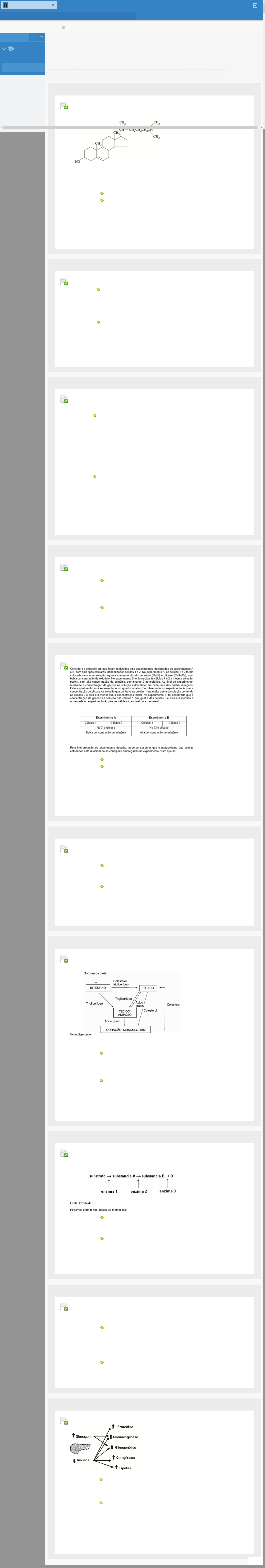 Revisar envio do teste: QUESTIONÁRIO UNIDADE IIIBIOQUÍMICA 7662-60_44301_R_F1_20221 CONTEÚDO BIOQUÍMICA (7662- 60_44301_R_F1_20 221) CONTEÚDO Quarta-feira, 6 de Abril de 2022 20h37min07s BRT Usuário gilvanete.gomes @aluno.unip.br Curso BIOQUÍMICA Teste QUESTIONÁRIO UNIDADE III Iniciado 06/04/22 20:35 Enviado 06/04/22 20:37 Status Completada Resultado da tentativa 4 em 4 pontos Tempo decorrido 2 minutos Resultados exibidos Todas as respostas, Respostas enviadas, Respostas corretas, Comentários, Perguntas respondidas incorretamente Pergunta 1 Resposta Selecionada: a. Respostas: a. b. c. d. e. Comentário da resposta: Sobre a molécula esquematizada, assinale a alternativa correta. Fonte: adaptado de: https://www.objetivo.br/conteudoonline/imagens/Aula_9601/318.png Colesterol. A maior parte do colesterol do organismo é sintetizado endogenamente. Colesterol. A maior parte do colesterol do organismo é sintetizado endogenamente. Colesterol. A maior parte do colesterol do organismo é proveniente da alimentação. Triglicerídeo. Proveniente da alimentação. Cortisol. Sintetizado endogenamente. Estrogênio. Sintetizado endogenamente. Reposta: A Comentário: A molécula do colesterol é um álcool policíclico de cadeia longa, considerado um esteroide. Pergunta 2 Resposta Selecionada: c. Respostas: a. b. c. d. e. Comentário da resposta: A última reação da glicólise é a transformação do fosfoenolpiruvato em piruvato. O piruvato formado pode ter vários destinos. Analise as alternativas sobre os destinos do piruvato e assinale a alternativa incorreta. Em condições anaeróbicas, o piruvato é convertido em Acetil-CoA. Essa conversão ocorre na matriz mitocondrial. Em situações de quantidades limitadas de oxigênio, o piruvato é reduzido a lactato, esse processo é chamado de glicólise anaeróbica ou fermentação láctica. Em alguns fungos, o piruvato é convertido em etanol em um processo denominado fermentação alcoólica. Em condições anaeróbicas, o piruvato é convertido em Acetil-CoA. Essa conversão ocorre na matriz mitocondrial. O piruvato pode ser transformado em Acetil-CoA, o qual é o substrato para o Ciclo de Krebs. O piruvato pode ser convertido em oxaloacetato, intermediário do Ciclo de Krebs, pela reação catalisada pela enzima piruvato carboxilase. Resposta: C Comentário: O piruvato é convertido em Acetil-CoA em condições aeróbicas. Pergunta 3 Resposta Selecionada: e. Respostas: a. b. c. d. e. Comentário da resposta: No processo de oxidação da glicose ocorre a redução de várias coenzimas NAD+ e FADH, formando NADH e FADH2, respectivamente. As coenzimas NADH precisam ser oxidadas para voltar à forma de NAD+ para que possam ser reutilizadas na oxidação de outras moléculas de glicose e também para que a energia nelas armazenadas possa ser utilizada na síntese de ATP. Analise as a�rmativas sobre o processo de transformação da energia contida nas coenzimas em ATP e assinale a alternativa correta. O transporte de elétrons ocorre junto com o transporte de prótons para o espaço intermembranas. Os prótons voltam espontaneamente para a matriz mitocondrial, sendo que a energia associada à força próton-motriz leva à síntese de ATP. Para a transformação da energia contida nas coenzimas em ATP, os prótons das coenzimas são transferidos entre os complexos inseridos na matriz mitocondrial até o complexo IV. Os elétrons presentes na coenzima NADH são transferidos primeiramente para o complexo II. A água é o aceptor �nal de elétrons na cadeia de transporte de elétrons. Na cadeia de transporte de elétrons e na fosforilação oxidativa, para cada NADH são formadas duas moléculas de ATP e para cada FADH2 são formadas três moléculas de ATP. O transporte de elétrons ocorre junto com o transporte de prótons para o espaço intermembranas. Os prótons voltam espontaneamente para a matriz mitocondrial, sendo que a energia associada à força próton-motriz leva à síntese de ATP. Resposta: E Comentário: A teoria quimiostática de Mitchell explica como o transporte de elétrons e o gradiente de prótons estão acoplados à síntese de ATP. Segundo essa teoria, o transporte de elétrons acontece juntamente com o transporte de prótons para o espaço intermembranas. Como consequência desse processo, ocorre uma concentração diferente de prótons no espaço intermembranas e na matriz mitocondrial. Como prótons têm carga positiva, o espaço intermembranas �ca carregado positivamente e a matriz mitocondrial negativamente, essa diferença de carga gera um potencial elétrico. A energia conservada nesse gradiente eletroquímico é chamada de força próton-motriz. Os prótons voltam espontaneamente para a matriz mitocondrial, sendo que a energia associada à força próton-motriz leva à síntese de ATP. Como a membrana é impermeável aos prótons, o retorno destes acontece pela ATP sintase. Pergunta 4 Resposta Selecionada: d. Respostas: a. b. c. d. e. Comentário da resposta: A gliconeogênese é uma via que forma glicose e que ocorre no fígado e nos rins. A contribuição do fígado para esse processo é maior, porém, dependendo do tempo de jejum, a contribuição dos rins pode chegar a até 40%. Todas as alternativas representam substratos da gliconeogênese, exceto: Frutose. Lactato. Glicerol. Aminoácidos. Frutose. Todas as alternativas são substratos da gliconeogênese. Resposta: D Comentário: Os substratos da gliconeogênese são glicerol, lactato e aminoácidos. Pergunta 5 Resposta Selecionada: a. Respostas: a. b. c. d. e. Comentário da resposta: Células 1 realizam metabolismo aeróbio. Células 1 realizam metabolismo aeróbio. Células 1 são incapazes de consumir glicose. Células 2 consomem mais oxigênio que as células 1. Células 2 têm maior demanda de energia que as células 1. Células 1 e 2 obtiveram energia a partir de substratos diferentes. Resposta: A Comentário: De acordo com o experimento proposto 