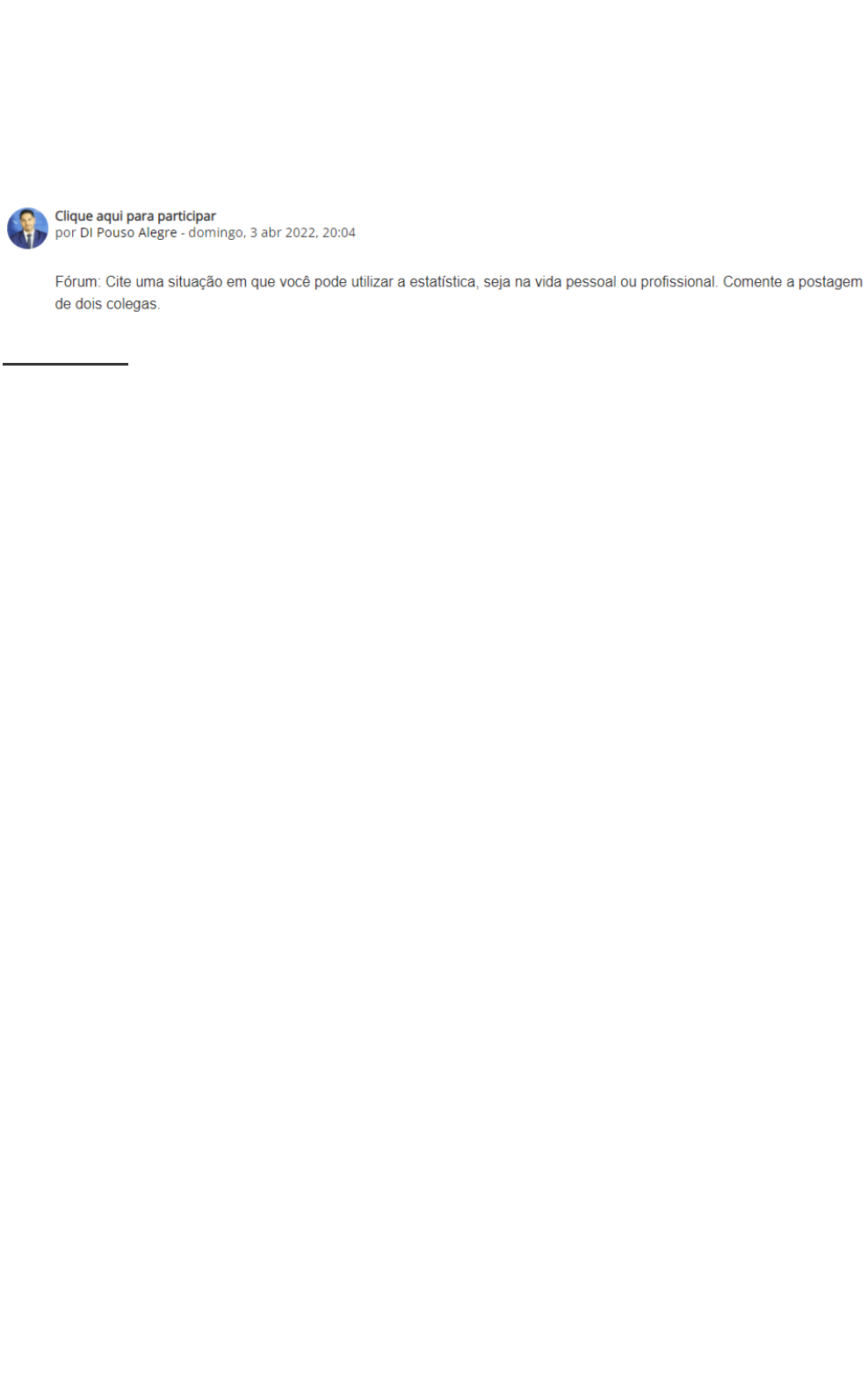 Adient – INTERNAL Fórum de discussão avaliativo - Unidade I [15 pontos] Disciplina: Estatística Aplicada Curso: Técnico em Logística Aluno: Izaias Aguiar RESPOSTAS: Na empresa que trabalho utilizamos muitos a estatística, pois todos os meses precisamos realizar o levantamento de quantas horas foram trabalhadas e quantos acidentes ocorreram e tivemos quantas horas perdidas (horas que o trabalhador teve eu ficar ausente da empresa devido algum tipo de acidente de trabalho). Também realizamos outros levantamentos estatísticos de quantos colaboradores já tomaram todas as 3 doses da vacina contra a covid-19. Monitoramos através de dados estatísticos qual a quantidade de consumo de água por dia na nossa planta, baseado em nossa meta anual que é reduzir 2% do consumo de água relativo ao no fiscal passado. Quais os tipos de acidentes mais comuns que ocorreram na empresa nos últimos 6 meses e quais foram os desvios (comportamento inseguros) mais recorrente na semana, no mês, nos últimos 3 meses e nos últimos 12 meses. Utilizamos todas estas informações para implementarmos planos de ação eficazes afim de melhorar nossa performance em Saúde Ocupacional, Segurança do Trabalho e Meio Ambiente. Ou seja, a estatística é uma ferramenta fundamental em nosso dia a dia e faz parte da gestão de qualquer empresa.