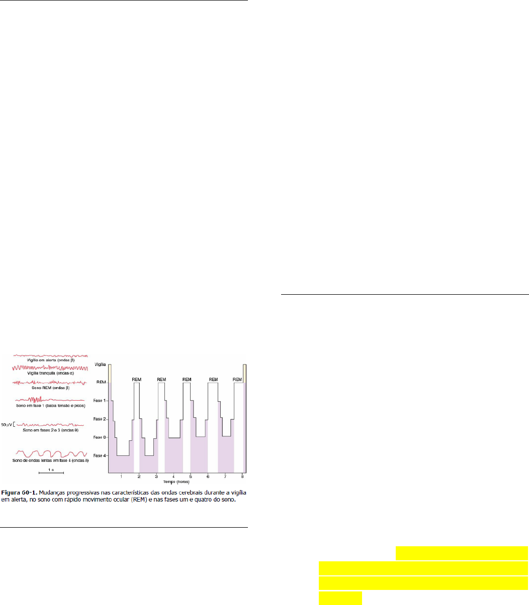 Sono - Guyton → Estado de inconsciência do qual a pessoa pode ser despertada por estímulo sensorial ou por outro estímulo. → Deve ser distinguido do como, que é estado de inconsciência do qual a pessoa não pode ser despertada. → Existem vários estágios de sono, do leva ao mais profundo. Tipos de sono – sono de ondas lentas e com movimentos rápidos dos olhos → Todas as pessoas alternam os dois tipos de sono. → Esses tipos são chamados: 1. Sono com movimentos rápidos dos olhos – REM – no qual os olhos realizam movimentos rápidos, apesar de a pessoa ainda estar dormindo 2. Soo de ondas lentas ou não rem – NREM – no qual as ondas cerebrais são fortes e de baixa frequência → O sono REM ocorre em episódios que ocupam aproximadamente 25% do tempo de sono dos adultos jovens; e cada episódio geralmente recorre a cada 90 minutos. • Esse tipo não é restaurador e está associado a sonhos vívidos → A maior parte do sono, durante a cada noite, é da variedade de ondas lentas, NREM, que é o sono profundo e restaurador no qual a pessoa experimenta na primeira hora de sono após ter ficado acordada por muitas horas. Sono REM (sono paradoxal, sono dessincronizado) → Em jovens adultos é normal que dure de 5 a 30 minutos, a cada 90 minutos. → Quando a pessoa está extremamente sonolenta, cada episódio de sono REM é curto e pode até estar ausente. Por sua vez, à medida que a pessoa vai ficando mais descansa com o passar da noite, a duração dos episódios de sono REM aumenta. → Características: 1. Forma ativa de sono, geralmente associada a sonhos e a movimentos musculares corporais ativos. 2. É mais difícil despertar o individuo por estímulos sensorial do que durante o sono de ondas lentas, e as pessoas em geral despertam espontaneamente pela manhã, durante episódio de sono REM. 3. O tônus muscular está excessivamente reduzido, indicando forte inibição das áreas de controle da medula espinal. 4. Frequências cardíacas e respiratórias ficam irregulares – sonhos 5. Apesar da inibição extrema dos músculos periféricos, movimentos musculares irregulares podem ocorrer. Isso acontece em superposição aos movimentos rápidos oculares. 6. Cérebro fica muito ativo e o metabolismo cerebral pode ser aumentado em até 20%. Tem ondas parecendo o estado de vigília. Obs: chama-se de sono paradoxal, pois é um paradoxo em que a pessoa possa ainda estar dormindo, apesar dessa grande atividade cerebral. Sono de ondas lentas → O sono profundo é o que ocorreu durante a primeira hora após irmos dormir. → Esse sono é excepcionalmente relaxante e está associado às diminuições do tônus vascular periférico e a muitas outras funções vegetativas do corpo. → Ex: PA, FR e metabolismo basal diminui de 10% a 30% → Embora o sono de ondas lentas seja chamado “sono sem sonhos”, sonhos e até mesmo pesadelos podem ocorrer durante esse estágio. → A diferença ente os sonhos que ocorrem no sono de ondas lentas e os que ocorrem no sono REM é que os do sono REM são associados à maior atividade muscular corporal, e os sonhos do sono de ondas lentas usualmente não são lembrados, pois não acontece a consolidação dos sonhos na memória. Teorias básicas do sono 1. Sono é causado por um processo inibitório ativo → Inicio das teorias é que as áreas excitatórias da parte superior do tronco cerebral, o sistema ativador reticular, simplesmente se fatigavam durante o dia de vigília, tornando-se inativas. → Mas um experimento mudou esta visão para a concepção atual de que o sono é causado por um processo inibitório ativo, já que se descobriu que a transecção do tronco cerebral, a nível médio d aponte, cria um cérebro cujo o córtex cerebral nunca dorme. Em outras palavras, centros localizados abaixo da região médio-pontinha do tronco parecem se necessários para causar sono pela inibição de outras partes do encéfalo. 2. Centros neuronais, substancias neuro- humorais e mecanismos que podem causar o sono – possível papel específico para a serotonina → A estimulação de diversas áreas específicas do encéfalo pode produzir sono, com características quase semelhantes ao sono natural. 1. Núcleos da rafe situados na metade inferior da ponte e no bulbo → Esses núcleos compreendem a fina lâmina de neurônios especializados, situados na linha média. → As fibras nervosas desses núcleos se disseminam localmente pela formação reticular do tronco cerebral, dirigindo-se também para cima, em direção ao tálamo, ao hipotálamo, à maioria das áreas do sistema límbico e até mesmo ao neocórtex do telencéfalo. → Muitas terminações nervosas das fibras desses neurônios liberam serotonina. → Quando o fármaco que bloqueia a formação de serotonina é administrado ao animal, ele, em geral, não consegue dormir por vários dias. Assim, admite-se que a serotonina é substancia transmissora, associada à produção do sono. 2. Áreas do núcleo do trato solitário → Esse núcleo é a terminação no bulbo e na ponte para onde se projetam os sinais provenientes das informações sensoriais viscerais, que chegam pelos nervos vago e glossofaríngeo. 3. O sono pode ser promovido por estimulação de diversas regiões no diencéfalo, incluindo a parte rostral do hipotálamo, área supraquiasmática e a área ocasional dos núcleos talâmicos de projeção difusa. Possíveis causas o sono REM → A razão pela qual o sono de ondas lentas é interrompido periodicamente pelo sono REM ainda não é compreendida. Porem, fármacos que mimetizam a ação da acetilcolina aumentam a ocorrência de sono REM. Consequentemente, já foi postulado que os grandes neurônios secretores de acetilcolina na formação reticular da porção superior do tronco cerebral podem, por suas extensas fibras eferentes, ativar muitas partes do cérebro. Assim, esse mecanismo poderia levar à atividade excessiva que ocorre em certas regiões