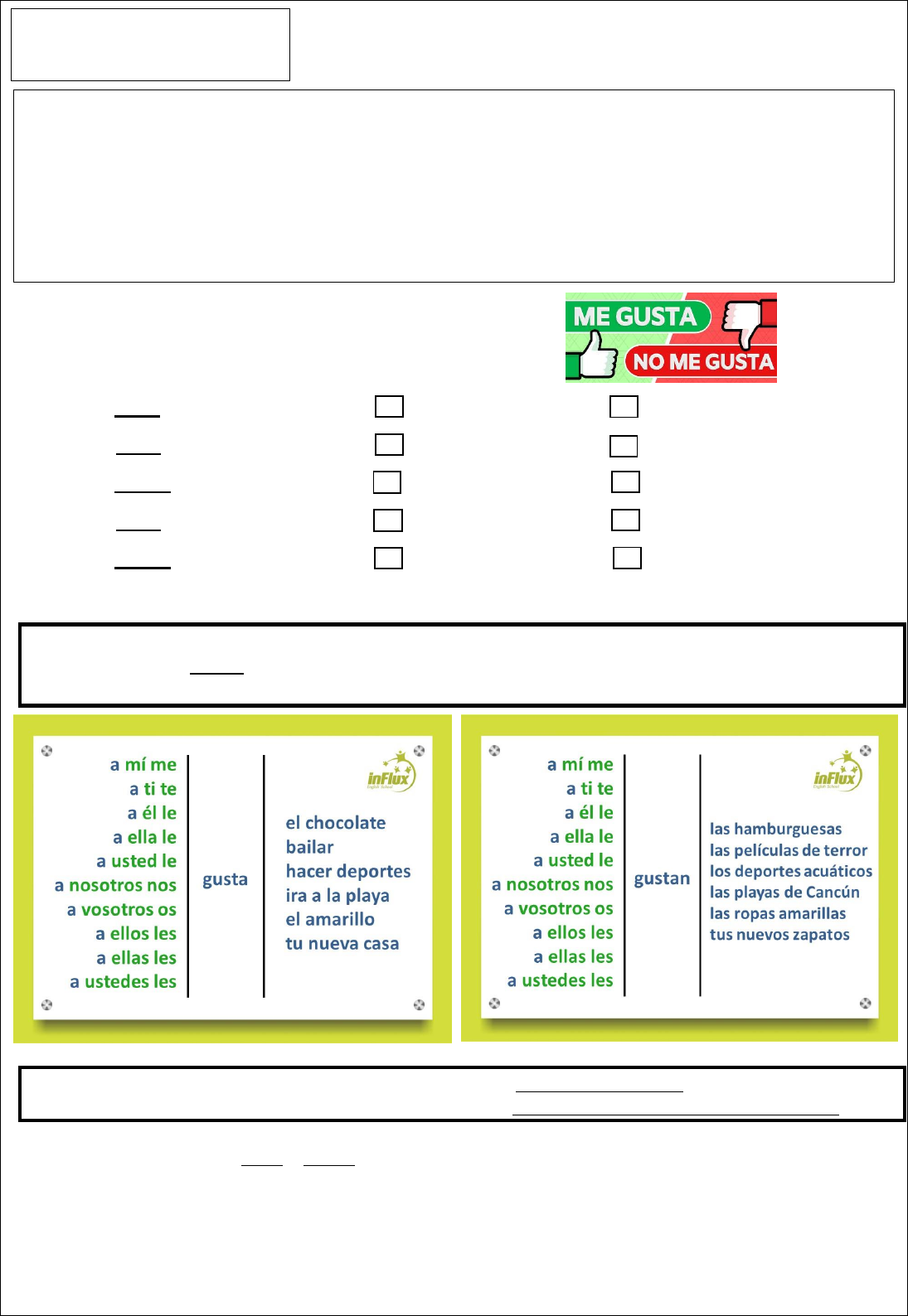 7º ANO - LÍNGUA ESPANHOLA – Profe Tamires Hola, ¿qué tal? Vamos hablar sobre de preferencias en español. 1) Marque con una X la respuesta que te represente. a) ¿A ti te gusta estudiar español? Sí, me gusta. No me gusta. b) ¿A ti te gusta chatear en Internet? Sí, me gusta. No me gusta. c) ¿A ti te gustan los partidos de fútbol? Sí, me gustan. No me gustan. d) ¿A ti te gusta ir al supermercado? Sí, me gusta. No me gusta. e) ¿A ti te gustan las películas de amor? Sí, me gustan. No me gustan. Expressar o que gostamos ou não é algo que fazemos com muita frequência no nosso dia a dia. Em espanhol, o verbo “gostar” é “gustar” e ele é usado em uma combinação de palavras um pouco diferente do que usamos em português. Usamos o GUSTA quando o complemento está no singular: A ella le gusta bailar. Usamos o GUSTAN quando o complemento está no plural: A nosotros nos gustan las hamburguesas. 2) Complete as frases con gusta o gustan. a) Me ___________ mucho jugar a baloncesto. b) No me ____________ los perros. c) ¿Te ___________ el café solo? d) A nosotros no nos __________ las películas románticas. e) ¿Os __________ la fiesta? f) No me __________ echar la siesta. ESCOLA ESTADUAL ANA TEREZA ALBERNAZ HABILIDADES: (EF07LI01) Interagir em situações de intercâmbio oral para realizar as atividades em sala de aula, de forma respeitosa e colaborativa, trocando ideias e engajando-se em brincadeiras e jogos. (EF07LI11.1MT) Participar de troca de opiniões e informações sobre textos, lidos na sala de aula ou em outros ambientes físicos ou digitais. (EF07LI06.1MT) Antecipar o sentido global de textos sobre o mundo em que vivemos e grupos de pertencimento em língua espanhola por inferências, com base em leitura rápida, observando títulos, primeiras e últimas frases de parágrafos e palavras-chave repetidas g) A mis padres les ___________ tomar el sol. h) ¿Te __________ los cacahuetes? i) Me ___________ los días soleados. j) Nos __________ Madrid. Você percebeu que o verbo GUSTAR se organiza diferente do que estamos acostumados em português. Dizemos: Eles gostam de sorvete. Em espanhol fica: A ellos les gusta el helado. 3) Ligue corretamente o verbo a seu complemento. Se o complemento estiver no plural se usa GUSTAN, se estiver no singular se usa GUSTA, Veja no quadro abaixo como expressar suas preferências. Depois leias as preferências de Verónica. Vocabulário: CHATEAR: bater papo PELÍCULA: filme AMARILLO: amarelo PLAYA: praia HAMBURGUESA: hambúrguer DEPORTES: esportes BALONCESTO: basquetebol PERRO: cachorro ECHAR LA SIESTA: tirar uma sesta (soneca depois do almoço) PADRES: pais CACAHUETE: amendoim 4) Crie 5 frases em espanhol dizendo coisas que Verónica gosta ou não gosta, usando corretamente o verbo GUSTAR (gusta, gustan) Ejemplo: A Verónica no le gustan los mosquitos. A ella le gusta la lluvia. _______________________________________________________________________________________ _______________________________________________________________________________________ _______________________________________________________________________________________ _______________________________________________________________________________________ _______________________________________________________________________________________ 5) Agora você vai aprender algumas palavras relacionadas a comidas. Leia com atenção o quadro ao lado Coloque o número na comida adequada. Vocabulário: PIÑA: abacaxi SANDÍA: melancia ZANAHORIA: cenoura FRESA: morango PASTA: massa, macarrão TÉ: chá ZUMO: suco Ahora vamos a conocer algunas de las comidas típicas de Colómbia. Lea la descripción de cada comida a continuación. 6) ¿Cuál de estos alimentos te gusta más? a) Me gusta la Bandeja Paisa. b) Me gustan las arepas. c) Me gustan los tamales. 7) ¿Cuál de estos alimentos se parece mucho a la pamonha brasileña? _______________________________ 8) Crie 3 frases em espanhol para expressar: a) Comida que no te gusta nada: _____________________________________________________________ b) Comida que te gusta mucho: _____________________________________________________________ c) Comida que te encanta: _________________________________________________________________ 9) Explique com suas palavras quando se usa GUSTA e quando se usa GUSTAN. _______________________________________________________________________________________ _______________________________________________________________________________________ _______________________________________________________________________________________ REFERÊNCIAS https://www.profedeele.es/actividad/gramatica/me-gusta-no-me-gusta-gustos/ https://blog.influx.com.br/usando-o-verbo-gustar-em-espanhol https://www.pinterest.es/pin/820992207051668270/ https://viajerocasual.com/comidas-tipicas-de-colombia/ BANDEJA PAISA es una comida tradicional de la región Paisa de Colombia, que incluye las ciudades de Medellín, Santa Fe de Antioquia, Guatape y Jardín. Esta abundante comida usualmente contiene arroz blanco, frijoles rojos, carne molida o picada, plátano, chorizo, maíz, chicharrón de cerdo, huevo frito, arepa y un aguacate. Las AREPAS son el plato tradicional más común en Colombia y se sirven como acompañamiento o como una comida en sí misma. Las arepas se sirven en toda América Central y del Sur, pero Colombia tiene su propio tipo de arepa original. Las arepas pueden ser de varias variedades, incluyendo las arepas de choco, las arepas con queso, y las arepas de huevo. Cada región de Colombia tiene su propia forma tradicional de comer y hacer arepas. Los TAMALES se pueden encontrar en toda América Central y del Sur, servidos en una variedad de formas y con una variedad de ingredientes. Los colombianos tradicionalmente comen tamales con carne, vegetales, frutas o queso y este manjar a base de maíz es servido y cocinado envuelto en una hoja de plátano. Los tamales se pueden encontrar por toda Colombia en superm