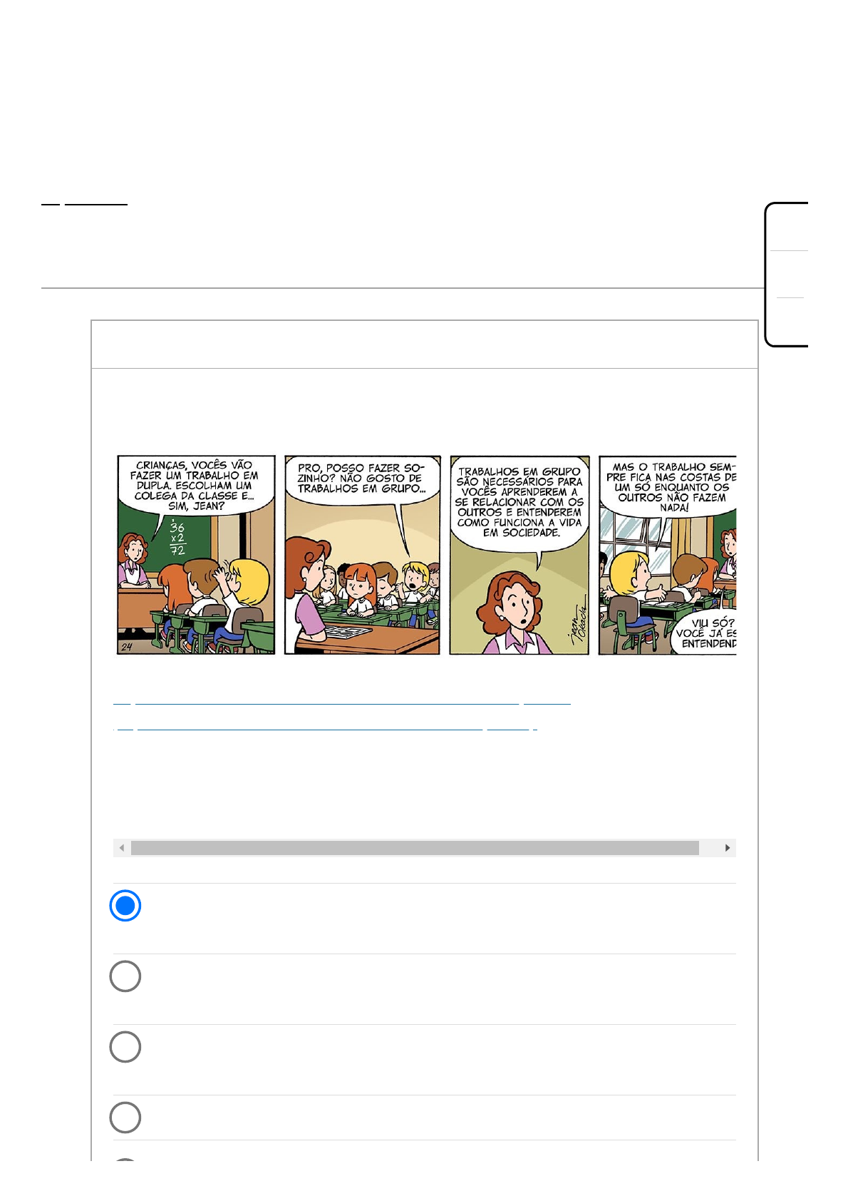 08/04/22, 10:18 Teste: Atividade Objetiva 2 https://famonline.instructure.com/courses/20489/quizzes/91065/take 1/7 Atividade Objetiva 2 Iniciado: 8 abr em 10:03 Instruções do teste Importante: Caso você esteja realizando a atividade através do aplicativo "Canvas Student", é necessário que você clique em "FAZER O QUESTIONÁRIO", no final da página. 0,2 ptsPergunta 1 Efeito carona, quando o indivíduo acredita que pode se “esconder na multidão”. Efeito zumbi, quando a maioria dos membros “se finge de morto” para evitar o trabalho. Efeito preguiça, quando os colegas acreditam que um dos membros é o mais inteligente e pode resolver tudo sozinho. Efeito mágico, quando um trabalha e todos os demais “desaparecem”. Observe a tirinha a seguir: Fonte: OKADA, J. 2019. Disponível em: https://twitter.com/JeanOkada/status/1148794721566937088/photo/1 (https://twitter.com/JeanOkada/status/1148794721566937088/photo/1) . Acesso em: 20 de janeiro de 2021. Considerando a charge apresentada, assinale a opção que indica corretamente o fenômeno que o aluno que deseja fazer o trabalho sozinho se refere: A+ A A- https://twitter.com/JeanOkada/status/1148794721566937088/photo/1 08/04/22, 10:18 Teste: Atividade Objetiva 2 https://famonline.instructure.com/courses/20489/quizzes/91065/take 2/7 Efeito borboleta, quando um trabalha e os demais “batem as asas e voam”. 0,2 ptsPergunta 2 Leia o texto a seguir: Uma outra razão para a construção de grupos é o desejo de proximidade pelo outro, inerente ao ser humano. A ação interpessoal pode resultar na formação de um grupo, e esta não se realiza, se não estivermos próximos, e se não constituirmos uma ligação empática. Por proximidade queremos dizer a distância física entre os funcionários que executam uma tarefa. O termo empatia designa a atração das pessoas uma pelas outras em razão das semelhanças de percepção, atitudes, desempenho ou motivação. As pessoas que trabalham muito próximas têm numerosas oportunidades de trocarem ideias, pensamentos e atitudes sobre várias atividades dentro e fora do emprego. Estas trocas resultam frequentemente em algum tipo de formação de grupos informais. A proximidade faz com que os indivíduos conheçam as características uns dos outros, aumentando a interação e o interesse pelos mesmos. Fonte: Porque formamos grupos?. Disponível em: http://maiscoisasuteis.blogspot.com/2012/04/porque-formamos-grupos.html (http://maiscoisasuteis.blogspot.com/2012/04/porque-formamos-grupos.html) . Acesso em 14 dez. 2020. Adaptado. Considerando os motivos que levam as pessoas a se juntarem a formar grupos, avalie as afirmações a seguir: 1. Por segurança, porque se reunindo em grupos as pessoas podem reduzir a insegurança de se sentirem sozinhos. 2. Para alcançar uma meta, porque há ocasiões em que é preciso mais de uma pessoa para realizar uma determinada tarefa. 3. Por afinidade e prazer, porque as pessoas que se gostam tendem a se reunir. 4. Por autoestima, porque os grupos podem dar a seus membros uma sensação de valor próprio. Estão corretas apenas as afirmativas: A+ A A- http://maiscoisasuteis.blogspot.com/2012/04/porque-formamos-grupos.html 08/04/22, 10:18 Teste: Atividade Objetiva 2 https://famonline.instructure.com/courses/20489/quizzes/91065/take 3/7 I, II e III. I e IV. I, III e IV. I, II e IV. I e III. 0,2 ptsPergunta 3 Leia o texto a seguir a seguir: Você tem o Slack. Você tem o e-mail. Você tem reuniões no Zoom, FaceTime e WhatsApp. A tecnologia atual oferece uma conectividade sem precedentes. Porém, para as equipes virtuais, a falta de conexão física continua criando grandes desafios. Para muitas equipes virtuais, erros de comunicação, tarefas incongruentes, processos de trabalho sobrepostos e falta de transparência são a norma. E isso torna praticamente impossível a tarefa de entregar trabalhos de alta qualidade com rapidez. A chave para o sucesso das equipes virtuais não é adicionar mais uma chamada de conferência semanal. É ajudá-las a evitar por completo esses desafios, através do desenvolvimento das seguintes características: responsabilidade, colaboração e engajamento. Quando as equipes estão espalhadas ao redor do país ou do mundo, o que elas podem fazer para manter os processos e tarefas alinhados? Como podem gerenciar a comunicação de forma eficaz em todos os continentes e fusos horários? De que maneira podem evitar que os silos físicos piorem os silos de informação? Liderança sólida, feedback e talento sempre serão importantes. Fonte: AS 3 principais características de equipes virtuais bem-sucedidas. Monday. 25/03/2020. Disponível em: https://monday.com/blog/pt/remote-work-successful-virtual-teams/ (https://monday.com/blog/pt/remote-work-successful-virtual-teams/) . Acesso em: 20 de janeiro de 2021. Adaptado. A+ A A- https://monday.com/blog/pt/remote-work-successful-virtual-teams/ 08/04/22, 10:18 Teste: Atividade Objetiva 2 https://famonline.instructure.com/courses/20489/quizzes/91065/take 4/7 II e III, apenas. III, apenas. I, apenas. I e II, apenas. II, apenas. Considerando o tema apresentado sobre equipes virtuais, avalie as afirmações a seguir: I. As equipes virtuais utilizam espaços como o coworking para se reunirem virtualmente na maior parte do tempo. II. As equipes virtuais em empresas já é um uso frequente e consistente desde antes da pandemia do Covid-19. III. Geralmente as equipes virtuais são permanentes, mas podem ser temporárias também. É correto o que se afirma em: 0,2 ptsPergunta 4 Leia o texto a seguir: Você trabalha em uma reconhecida empresa fabricante de massas há 8 anos. Quando entrou, era jovem e com pouca experiência, mas com o passar do tempo, superou as muitas dificuldades, foi estudando e entendendo os processos. Como obteve várias promoções, atualmente você é responsável pela área de vendas da empresa. Tem sob sua responsabilidade dois supervisores de vendas, cada um com três equ