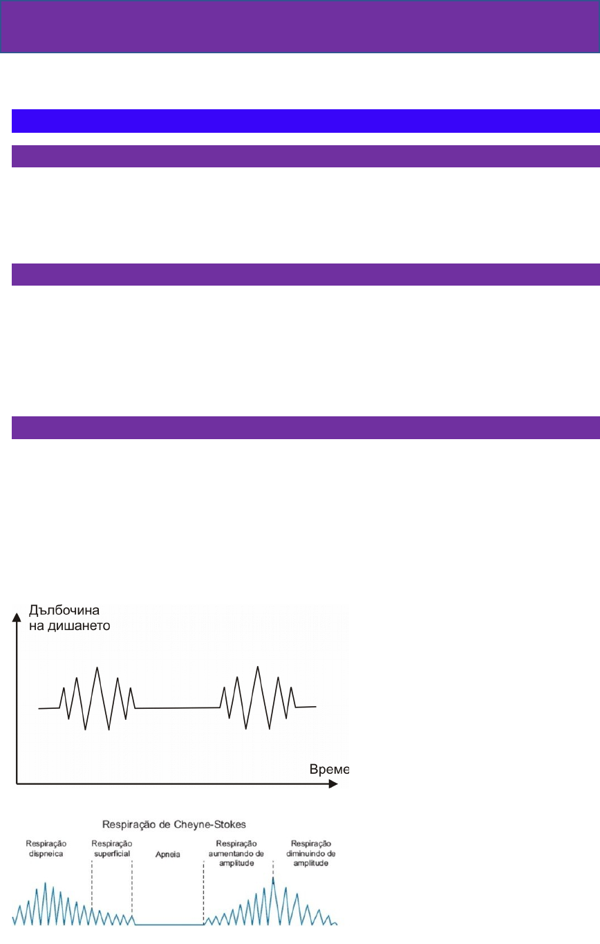 padroes respiratÓrios patolÓgicos PADRÕES RESPIRATÓRIOS PATOLÓGICOS Ciclo típico: Impulso neural Contração dos músculos intercostais Contração do diafragma Relaxamentos dos músculos inspiratórios Expiração passiva. Respiração paradoxal Depressão abdominal e ampliação do deslocamento do tórax superior na inspiração (grande ativação da musculatura acessória). Exemplo: DPOC, asma, disfunção dos músculos intercostais, paresia ou paralisia diafragmática. Respiração Cheyne-Stokes Apresenta alterações crescentes e decrescentes da amplitude respiratória (aumento do VC) com intervalos de apneia e hipopneia. Exemplo: ICC, desordens neurológicas (AVC), idosos, prematuros e grandes altitudes. *Hipopneia = redução de 30% a 50% do fluxo respiratório. Respiração de Biot Arritmia ventilatória com variação dos movimentos torácicos e aumento do VC entre os momentos de apneia. Exemplo: Mau prognóstico, lesão no tronco cerebral (compressão) afetando os neurônios responsáveis pela ritmicidade, meningite, pressão intracraniana elevada, neoplasias, isquemia do tronco cerebral, hematoma extradural. Respiração Kussmaul Amplitude e frequência respiratória elevadas. Exemplo: Paciente com insuficiência renal, cetoacidoses diabéticas e outras acidoses Gasping ou “fome de ar” Altas amplitudes, VC de curta duração com períodos de apneia subsequentes. Exemplo: Fina de vida (evolução ao óbito) Resumo feito por: Mônica Domingos – Fisioterapeuta UESB 🚀