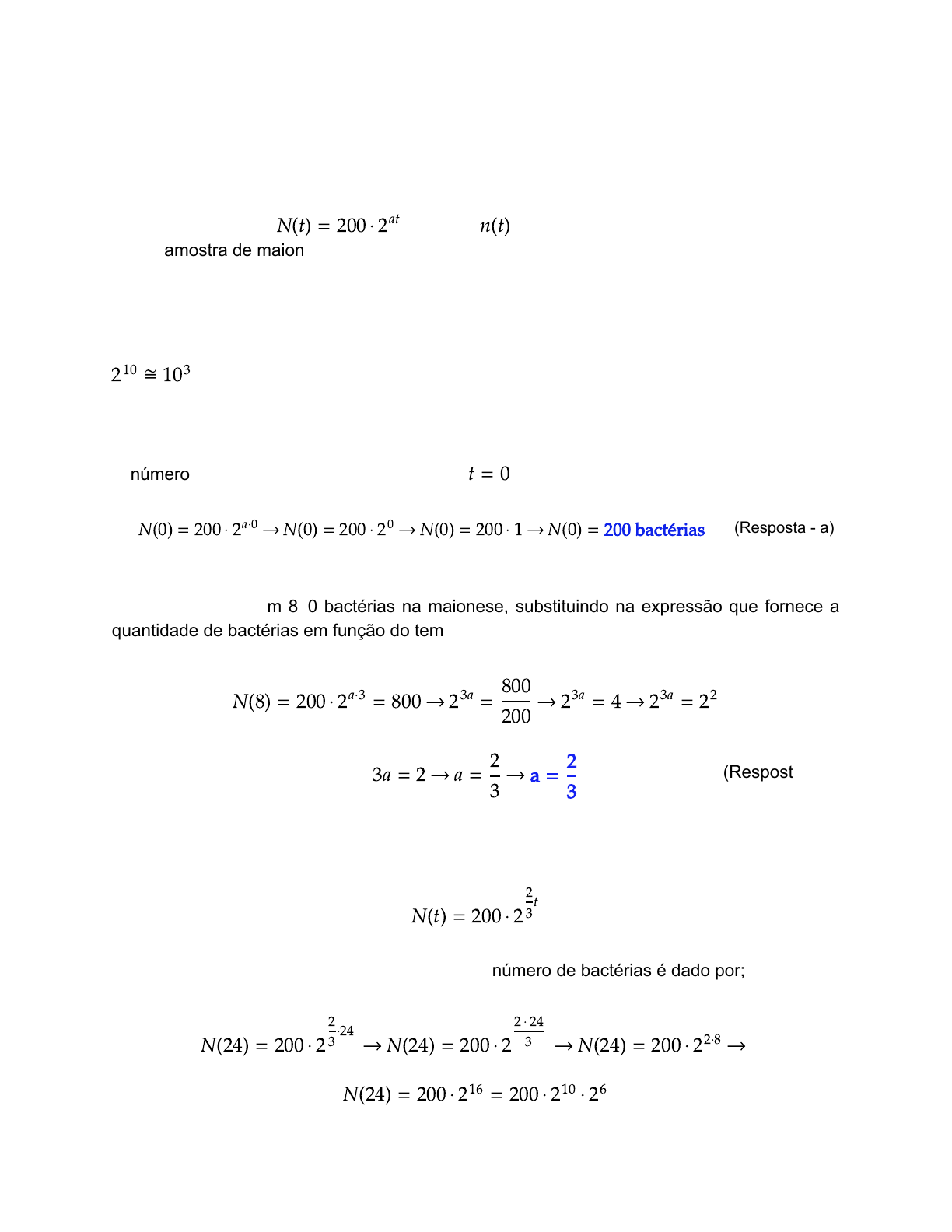 Tiago Lima - Instagram: @professor_disciplinas_exatas • Uma maionese malconservada causou mal-estar nos frequentadores de um clube. Uma investigação revelou a presença da bactéria salmonela, que se multiplica segundo a lei em que é o número de bactérias encontradas na N t = 200 ⋅ 2( ) at n t( ) amostra de maionese t horas após o início do almoço e a é uma constante real. a) Determine o número inicial de bactérias; b) Sabendo que 3 horas após o início do almoço o número de bactérias era de 800, determine o valor da constante a. c) Determine o número de batérias após 1 dia de realização do almoço. (use: ). 2 ≅ 1010 3 Resolução: a) O número inicial de bactérias se dá no tempo , substituindo na equação, temos;t = 0 N 0 = 200 ⋅ 2 N 0 = 200 ⋅ 2 N 0 = 200 ⋅ 1 N 0 = 200 bactérias ( ) a⋅0 → ( ) 0 → ( ) → ( ) b) Após 3 horas haviam 800 bactérias na maionese, substituindo na expressão que fornece a quantidade de bactérias em função do tempo, fica; N 8 = 200 ⋅ 2 = 800 2 = 2 = 4 2 = 2( ) a⋅3 → 3a 800 200 → 3a → 3a 2 3a = 2 a = a =→ 2 3 → 2 3 c) Temos que a expressão que fornece a quantidade de bactérias em função do tempo é; N t = 200 ⋅ 2( ) t 2 3 Um dia tem 24 horas, assim, após esse tempo o número de bactérias é dado por; N 24 = 200 ⋅ 2 N 24 = 200 ⋅ 2 N 24 = 200 ⋅ 2( ) ⋅24 2 3 → ( ) 2 ⋅ 24 3 → ( ) 2⋅8 → N 24 = 200 ⋅ 2 = 200 ⋅ 2 ⋅ 2( ) 16 10 6 (Resposta - a) (Resposta - b) Considerando : 2 ≅ 1010 3 N 24 = 200 ⋅ 10 ⋅ 64 = 200 ⋅ 1000 ⋅ 64( ) 3 N 24 = 12 800 000 bactérias( ) (Resposta - c)