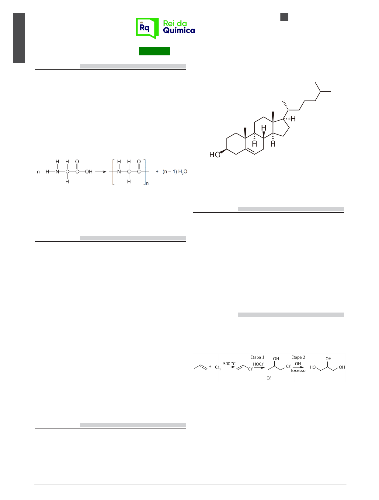 MATERIAL EXCLUSIVO PROFESSOR: Thiago Henrique do Carmo 1º SEMESTRE 2020 1 | P á g i n a M A T E R I A L E X C L U S I V O D A S A L I N H A R E I D A Q U Í M I C A REAÇÕES ORGÂNICAS. PARTE II QUESTÃO 2671 A síntese de proteínas tem início quando um RNAm, um dos RNAt e as subunidades de um ribossomo se reúnem para formar um ribossomo funcional. Cada ribossomo percorre, então, a molécula de RNAm traduzindo a sequência de códons em uma sequência de aminoácidos. SÍNTESE de proteínas. Biologia Molecular. Disponível em: https://edisciplinas.usp.br. Acesso em: 23 set. 2019. (adaptado) A união de aminoácidos por meio da ligação peptídica ocorre como mostra o esquema a seguir O processo de quebra de uma cadeia polipeptídica possui como agente principal o(a) A água. B aquecimento. C etanol. D pH. E radiação. QUESTÃO 2672 O biogás é uma mistura gasosa combustível produzida por meio de digestão anaeróbica, ou seja, esse gás é produzido pela biodegradação da matéria orgânica devido à ação de bactérias na ausência de oxigênio. Nesse processo, a maior parte do material orgânico é convertida em biogás (70-90%). Algumas das matérias primas para a produção de biogás são excrementos de animais, lodos de esgoto e lixo doméstico. Um dos gases que compõe o biogás é o metano (CH4), e o processo de transformação de matéria orgânica nesse gás é denominado metanogênese, em que o metano é produzido partindo do ácido acético, como demonstrado a seguir. CH3COOH (aq) → CH4 (g) + CO2 (g) BIOGÁS. Disponível em: http://www.palotina.ufpr.br. Acesso em: 24 set. 2019. (adaptado) Para que o processo de metanogênese ocorra, o carbono da carboxila contida na molécula de ácido acético precisa ser A alcalinizado. B hidratado. C neutralizado. D oxidado. E reduzido. QUESTÃO 2673 Os alcenos ou olefinas são hidrocarbonetos que apresentam ligações duplas entre carbonos. A alta densidade eletrônica na região das insaturações possibilita a ocorrência de reações de adição a alcenos, tal como o exemplo abaixo: H2C = CH2 + Cl2 → H2ClC – CH2Cl O colesterol, cuja estrutura se apresenta abaixo, é um esteroide que, em excesso, pode trazer diversos males atrelados ao sistema cardiovascular. A reação de tal molécula com Br2 em meio de tetracloreto de carbono leva ao produto A C27H46OBr2 B C27H44OBr2 C C27H48OBr2 D C24H46OBr E C24H44OBr QUESTÃO 2674 Reações químicas orgânicas são normalmente lentas, e ocorrem com compostos orgânicos. Para que ocorra reação, é necessária a quebra das ligações moleculares dos reagentes. Essas reações transformam as matérias-primas provenientes do petróleo, do carvão, dos animais e dos vegetais. A reação de hidratação de alcenos é classificada como: A uma reação de oxidação. B uma reação de substituição. C uma reação de isomerização. D uma reação de eliminação. E uma reação de adição. QUESTÃO 2675 A glicerina é um subproduto da produção de biodiesel e matéria-prima para a produção de insumos da cadeia petroquímica (plásticos) e produtos com aplicações no setor de combustível. Sua produção industrial acontece a partir do propeno, como ilustrado a seguir: As etapas 1 e 2, que acontecem na produção industrial do propeno, são, respectivamente, A acidificação e alcoólise. B adição e substituição. C transesterificação e eliminação. D redução e oxidação. E cloração e hidrólise básica. MATERIAL EXCLUSIVO PROFESSOR: Thiago Henrique do Carmo 1º SEMESTRE 2020 2 | P á g i n a M A T E R I A L E X C L U S I V O D A S A L I N H A R E I D A Q U Í M I C A QUESTÃO 2676 Para a produção do bioquerosene de aviação, podem ser utilizados óleos de gorduras vegetais, que sofrem hidrólise formando ácidos graxos, os quais posteriormente são desoxigenados originando combustíveis parafínicos – o bioquerosene. Os ácidos graxos podem ser desoxigenados por três rotas distintas I. Descarboxilação: RCOOH → RH + CO2 II. Descarbonilação: RCOOH + H2 → RH + CO + H2O III. Hidrogenação/Desidratação: RCOOH + 2 H2 → RCH3 + 2 H2O Se, na produção do bioquerosene, pelo processo menos agressivo para o ambiente, for usado um óleo que contenha, exclusivamente, o triéster então, o bioquerosene obtido terá fórmula molecular A C10H22. B C11H24. C C12H26. D C13H28. E C14H30. QUESTÃO 2677 A discussão sobre a estrutura do benzeno, em meados do século XIX gerou uma diversidade de propostas para estrutura da molécula de C6H6, algumas das quais encontram-se representadas a seguir Dewar Fulveno Prismano Benzeno Sabendo-se que, quando o benzeno reage com o cloro, formando-se um único produto (monoclorobenzeno), quais das estruturas apresentadas não atendem a esse requisito? A Dewar B Fulveno C Prismano D Benzeno QUESTÃO 2678 O Polietileno Verde possui essa denominação por ser obtido a partir do etanol proveniente da fermentação biológica da cana-de-açúcar, segundo a rota sintética representada abaixo. CH3-CH2-OH → CH2 = CH2 → -(CH2-CH2)n- I II As reações I e II podem ser classificadas, respectivamente, como A oxidação e adição. B eliminação e condensação. C condensação e polimerização. D eliminação e hidrogenação. E desidratação e polimerização. MATERIAL EXCLUSIVO PROFESSOR: Thiago Henrique do Carmo 1º SEMESTRE 2020 3 | P á g i n a M A T E R I A L E X C L U S I V O D A S A L I N H A R E I D A Q U Í M I C A QUESTÃO 2679 Tecnicamente, a indústria do sabão nasceu muito simples, e os primeiros processos exigiam muito mais paciência do que perícia. Tudo o que tinham a fazer, segundo a História, era misturar dois ingredientes: cinza vegetal, rica em carbonato de potássio, e gordura animal. Então, era só esperar por um longo tempo até que eles reagissem entre si. AMARAL, J. L.; PINTO, B. C. Aula prática: reação de saponificação. Disponível em: <http://www.abq.org.br>. Acesso em: 27 ago. 2019. A utilização 
