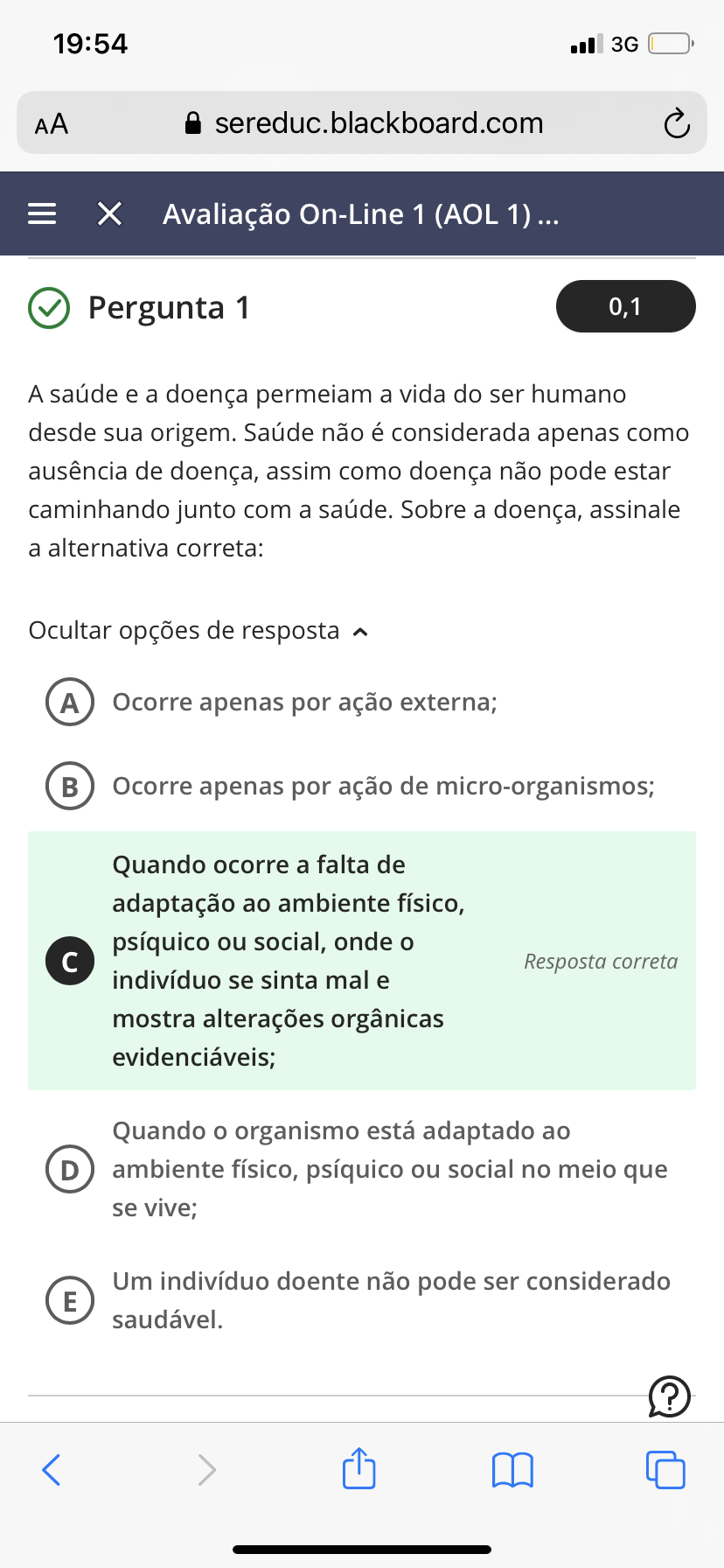 A saúde e a doença permeiam a vida do ser humano desde sua origem. Saúde não considerada apenas como ausência de doença, assim como doença não pode estar caminhando junto com a saúde. Sobre a doença, assinale a alternativa correta: A Ocorre apenas por ação externa; B Ocorre apenas por ação de micro-organismos; C Quando ocorre a falta de adaptação ao ambiente físico, psíquico ou social, onde o indivíduo se sinta mal e mostra alterações orgânicas evidenciáveis; D Quando o organismo está adaptado ao ambiente físico, psíquico ou social no meio que se vive; E Um indivíduo doente não pode ser considerado saudável.