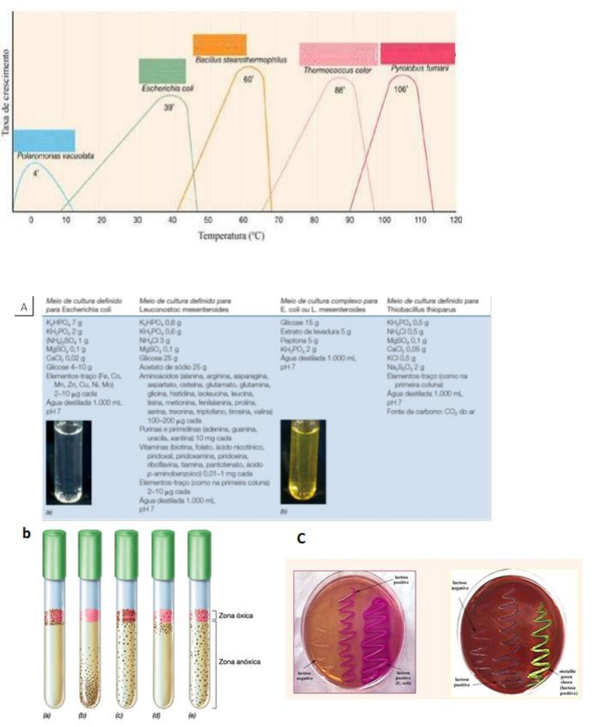 ENG07064- BIOENGENHARIA QUESTIONÁRIO 2-CRESCIMENTO E METABOLISMO MICROBIANO 1. De acordo com a figura abaixo, classifique os grupos de acordo com o crescimento dos microrganismos e suas respectivas faixas de temperaturas. 2. Analise a tabela e a figura abaixo e responda as seguintes questões: iPad 655 Mariana TERRA ZUCH Psicrófilo iPad 655 Mariana TERRA ZUCH Mesófilo iPad 655 Mariana TERRA ZUCH Termófilo iPad 655 Mariana TERRA ZUCH Hipertermófilo iPad 655 Mariana TERRA ZUCH Hipertermófilo iPad 655 Mariana TERRA ZUCH 4-12°C iPad 655 Mariana TERRA ZUCH 30-40°C iPad 655 Mariana TERRA ZUCH 50-60°C iPad 655 Mariana TERRA ZUCH 80-90°C iPad 655 Mariana TERRA ZUCH 100-110°C iPad 655 Mariana TERRA ZUCH As faixas de temperatura estão expressar para englobar a maioria dos microrganismos. a) Qual a diferença entre meio definido e meio complexo? A figura C mostra um microrganismo crescendo em ágar MacKonkey e Eosina Azul de Metileno. Explique o princípio destes meios para microbiologia. b) Em qual meio (figura A), definido ou complexo, você acredita que E. coli cresceria mais rapidamente? Por quê? E. coli não é capaz de crescer no meio descrito para Thiobacillus thioparus. Por quê? OBS: Thiobacillus thioparus é um microrganismo quimioautotrófico. c) Identifique baseado na figura B qual a condição de O2 para crescimento em cada caso. O que impede as bactérias anaeróbias de se desenvolverem em meios ricos em oxigênio? 3. O fósforo é essencial para o crescimento microbiano devido uma função específica, qual é ela? 4. Em termos de geração de energia, como um quimiorganotrófico se difere de um quimiolitotrófico? E um quimiotrófico de um fototrófico? Em termos de aquisição de carbono, como um autótrofo se difere de um heterótrofo? 5. Por que o meio seguinte não pode ser considerado um meio quimicamente definido: glicose, 5 gramas (g); NH4Cl, 1 g; KH2PO4, 1 g; MgSO4, 0,3 g; extrato de levedura, 5 g; água destilada, 1 litro. METABOLISMO MICROBIANO 1. Pesquise e responda: que características têm a molécula de ATP que a habilita a exercer a função de “moeda metabólica”? Existem outras moléculas capazes de exercer tal função? 2. Durante os períodos de abundância de nutrientes, como as células podem preparar-se para os períodos de carência nutricional? 3. Qual a diferença entre catabolismo e anabolismo? Preencha as lacunas da figura abaixo indicando o que acontece em cada fase da reação: iPad 655 Mariana TERRA ZUCH Moléculas complexas iPad 655 Mariana TERRA ZUCH Reações catabólicas quebram essas moléculas complexas liberando energia na forma de ATP( energia vai da molécula complexa para o ATP) iPad 655 Mariana TERRA ZUCH Moléculas simples geradas pela quebra das moléculas complexas iPad 655 Mariana TERRA ZUCH Reações anabólicas que transferem energia para as moléculas complexas 4. Observe os esquemas a seguir e responda as seguintes questões: Para produzir energia, a partir da glicose, os microrganismos utilizam dois processos gerais. Quais processos são representados pelos esquemas 1 e 2 ? Explique detalhadamente cada um deles. 5. A fermentação conduz, geralmente, a cisão parcial de moléculas orgânicas. O conceito clássico define fermentação como a decomposição microbiana de carboidratos independente de oxigênio. De acordo com os produtos finais formados, as fermentações recebem denominações. Cite 3 principais tipos de fermentações microbianas e os respectivos produtos finais formados. iPad 655 Mariana TERRA ZUCH CRESCIMENTO E METABOLISMO MICROBIANO 2- a) Meio definido é um meio onde conhecemos a sua composição química específica, ou seja, tudo que está presente, enquanto que no meio complexo não temos a composição exata do meio. O meio artificial por ter uma composição definida,ele é mais complexo e mais caro devido aos reagentes utilizados. Já a meio complexo ou natural e mais barato mas por causa disso é usado para microrganismos menos exigentes. Ao analisarmos a figura C, temos dois meios de cultura. O meio Ágar Mac Conkey o qual é um meio diferencial pois permite a distinção de micro-organismos fermentadores de lactose dos não fermentadores. isto é possível pela diferença de coloração das colônias; fermentadores produzirão lactose diminuindo o pH do meio dando uma cor rosa; enquanto os não fermentadoras geram íons amônio que possuem caracter básico dando origem a colônias brancas. O segundo meio é o EMB o qual é seletivo pois inibe em certo grau as bactérias gram positivas com o uso de certos corantes e diferencial pois permite a diferenciação de fermemtadores de lactose e/ou sacarose dos não fermentadores. Neste caso a E. coli fica com uma colocarão escura de reflexos verdes devido a redução do pH pela fermentação. Já a K. pneumoniae e S. enteritidis não são fermentadoras logoficam sem cor ou de um roxo claro. A coloração é dada pelo eosina enquanto que a inibição das gram positivas é feita pelo azul de metileno. b) Em um meio definido são colocadas todas as necessidades de crescimento dos microrganismos na forma de reagentes enquanto que no meio complexo a natureza química não é bem definida. Desta forma, por exemplo, um microrganismo poderia ter necessidade do nutriente X que se encontra no alimento Y. Ao colocar o alimento Y no meio garantimos a presença do nutriente X mas não necessariamente na quantidade adequada e com a adição do alimento Y temos outros compostos não necessário ao desenvolvimento da E. coli. Assim, eu acredito que um meio definido, mesmo sendo mais caro, proporcionaria um crescimento mais adequado. A E. coli não é capaz de crescer no meio de um organismo quimioautótrofico devido a diferença de compostos presentes no meio, uma vez que a E. coli é um quimioheterotrófico. Desta forma, caso a E. coli fosse colocada neste meio, faltaria fonte de carbono para assegurar seu desenvolvimento porque ela não é capaz de captar car