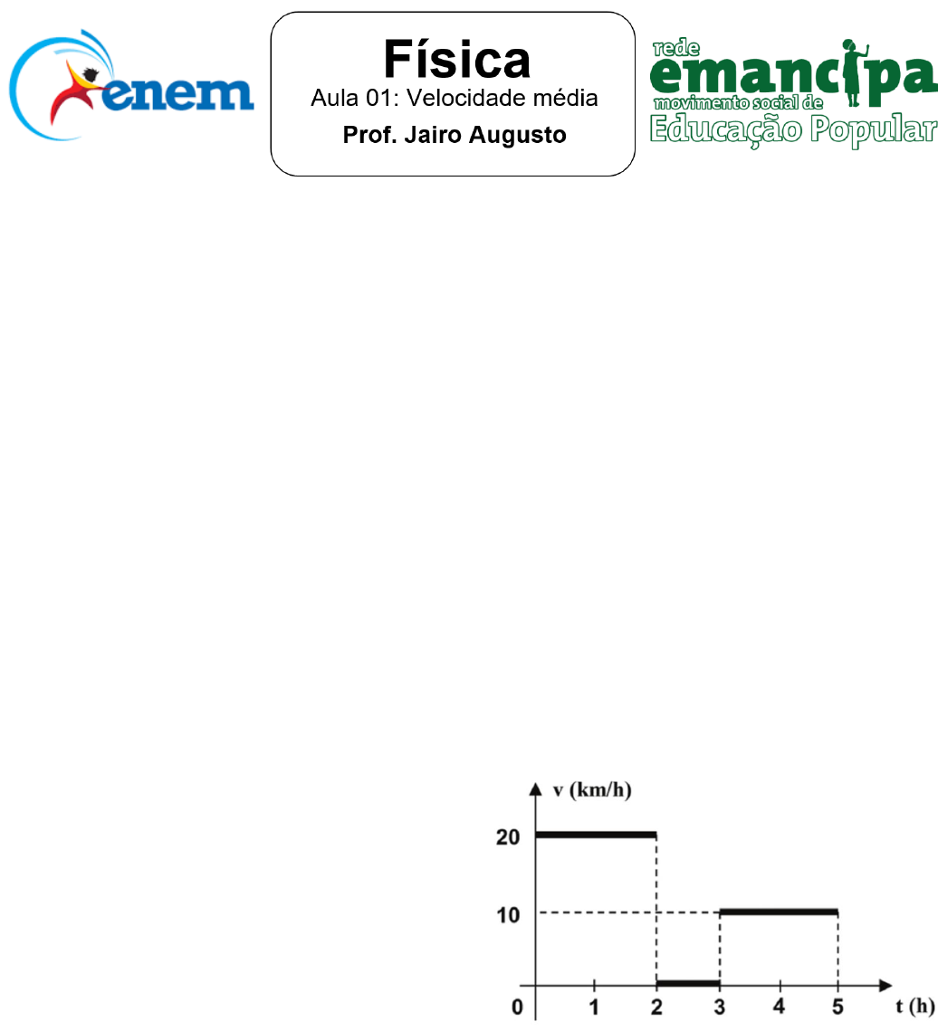 Exercícios 1) (Unicamp 2017)Em 2016 foi batido o recorde de voo ininterrupto mais longo da história. O avião solar impulse 2, movido a energia solar; percorreu quase 6.480 Km em aproximadamente 5 dias, partindo de Nagoya no Japão até o Havaí nos estados Unidos da América. A velocidade escalar média desenvolvida pelo avião foi de aproximadamente: a) 54 km/h b) 15 km/h c) 1.296 km/h d) 198 km/h 2) (UEL-PR) Um homem caminha com velocidade Vh=3,6 Km/h, uma ave, com velocidade Va=30 m/min, e um inseto, com Vi=60 cm/s. Essas velocidades satisfazem a relação: a) Vi>Vh>Va b) Va>Vh>Vi c) Vh>Va>Vi d) Va>Vi>Vh e) Vh>Vi>Va 3) (UFPA) Maria saiu de Mosqueiro às 6 horas e 30 minutos, de um ponto da estrada onde o marco quilométrico indicava Km 60. Ela chegou a Belém às 7 horas e 15 minutos, onde o marco quilométrico da estrada indicava Km 0. A velocidade média, em quilômetros por hora, do carro de Maria, em sua viagem de Mosqueiro até Belém, foi de: 4) (PucPR) Considere os dados a seguir. O guepardo é um velocista por excelência. O animal mais rápido da terra, atinge uma velocidade máxima de cerca de 110 km/h. O que é ainda mais notável, leva apenas três segundos para isso. Mas não consegue manter esse ritmo por muito tempo, a maioria das perseguições é limitada a menos de meio minuto, pois o exercício anaeróbico intenso produz um grande débito de oxigênio e causa elevação abrupta da temperatura do corpo (até quase 41°C, perto do limite letal). Um longo período de recuperação deve se seguir. O elevado gasto de energia significa que o guepardo deve escolher sua presa cuidadosamente, pois não pode se permitir muitas perseguições infrutíferas. (ASHCROFT,Francis. A vida no limite) Considere um guepardo que, partindo do repouso com aceleração constante, atinge 108 km/h após três segundos de corrida, mantendo essa velocidade nos oito segundos subsequentes. Nesses onze segundos de movimento, a distância total percorrida pelo guepardo foi de: a) 180 m b) 215 m c) 240 m d) 285 m e) 305 m 5)(Mackenzie 2018) Uma pessoa realiza uma viagem de carro em uma estrada retilínea, parando para um lanche, de acordo com o gráfico acima. A velocidade média nas primeiras 5 horas deste movimento é: a) 10 km/h b) 12 Km/h c) 15 Km/h d) 30 Km/h e) 60 Km/h 6)(Imed 2018) Um motorista se desloca de passo fundo em direção a soledade, num treco da pista que é horizontal e retilínea. A sua frente um segundo automóvel está a uma distância segura. O primeiro motorista percebe que durante alguns segundos essa distância parece inalterada, nesse instante olha para o velocímetro e verifica que a rapidez de 80 km/h se mantém, de acordo com o uso da função piloto automático. Baseado na situação descrita, qual das alternativas abaixo está correta? a) Os dois móveis, nesses instantes, se encontraram em MRUV. b) O primeiro móvel se encontra em repouso em relação a um referencial na pista. c) O segundo móvel está freando. d) Nesses instantes, a rapidez do segundo móvel é de 100 km/h em relação a um referencial na pista. e) A rapidez relativa entre eles é nula. 7)(UFRGS) Em grandes aeroportos e shoppings, existem esteiras móveis horizontais para facilitar o deslocamento de pessoas. Considere uma esteira com 48m de comprimento e uma velocidade de 1,0 m/s. Uma pessoa ingressa na esteira e segue caminhando sobre ela com velocidade constante no mesmo sentido de movimento da esteira. A pessoa atinge a outra extremidade 30s após ter ingressado na esteira. Com que velocidade em m/s a pessoa caminha sobre a esteira? a) 2,6 b) 1,6 c) 1,0 d) 0,8 e) 0,6 8)(CPS 2018) Para exemplificar uma aplicação do conceito de velocidade média, um professor de ciências explica aos seus alunos como é medida a velocidade de um veículo quando passa por um radar. Os radares usam a tecnologia dos sensores magnéticos. Geralmente são três sensores instalados no asfalto alguns metros antes do radar. Esse equipamento mede quanto tempo o veículo demora para ir de um sensor ao outro, calculando a partir daí, a velocidade média do veículo. Considere um veículo trafegando numa pista cuja velocidade máxima permitida seja de 40 km/h (aproximadamente 11m/s) e distância média entre os sensores consecutivos seja de 2 metros. O mínimo intervalo de tempo que o veículo leva para percorrer a distância entre um sensor e outro consecutivo, a fim de não ultrapassar o limite de velocidade é, aproximadamente, de: a) 0,10s b) 0,18 s c) 0,20 s d) 0,22 s e) 1,00 s 9)(Upf)Considerando as informações apresentadas, assinale a alternativa que indica o pássaro mais veloz. a) Beija-flores voam a aproximadamente 88 Km/h. b) Gaivotas voam a aproximadamente 50 m/s. c) Faisões voam a aproximadamente 1,5 km/min. d) Pardais voam a aproximadamente 583 m/min. e) Perdizes voam a aproximadamente 100 cm/s. 10) Um móvel parte do km 50, indo até o Km 60, onde, mudando o sentido do movimento, vai até o km 32. O deslocamento escalar e a distância efetivamente percorrida são, respectivamente: a) 28 km e 28 km b) 18 km e 38 km c) – 18 km e 38 km d) – 18 km e 25 km e) 38 km e 18 km