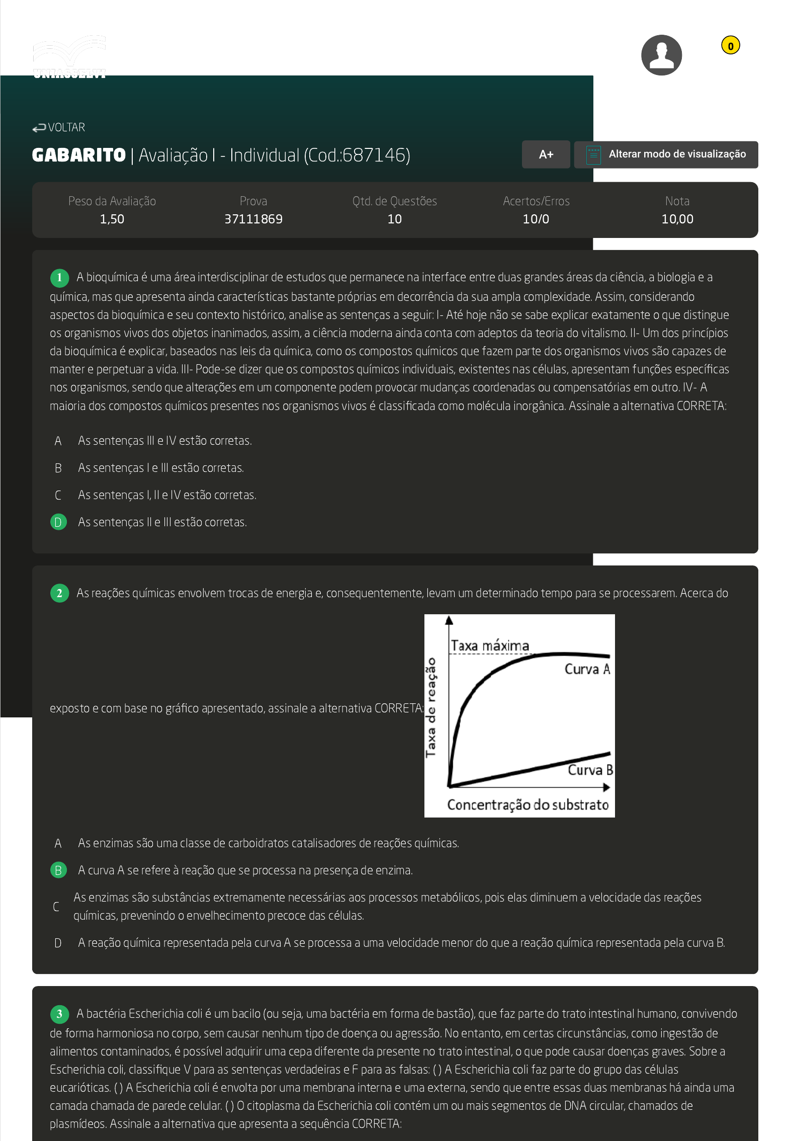 GABARITO | Avaliação I - Individual (Cod.:687146) Peso da Avaliação 1,50 Prova 37111869 Qtd. de Questões 10 Acertos/Erros 10/0 Nota 10,00 A bioquímica é uma área interdisciplinar de estudos que permanece na interface entre duas grandes áreas da ciência, a biologia e a química, mas que apresenta ainda características bastante próprias em decorrência da sua ampla complexidade. Assim, considerando aspectos da bioquímica e seu contexto histórico, analise as sentenças a seguir: I- Até hoje não se sabe explicar exatamente o que distingue os organismos vivos dos objetos inanimados, assim, a ciência moderna ainda conta com adeptos da teoria do vitalismo. II- Um dos princípios da bioquímica é explicar, baseados nas leis da química, como os compostos químicos que fazem parte dos organismos vivos são capazes de manter e perpetuar a vida. III- Pode-se dizer que os compostos químicos individuais, existentes nas células, apresentam funções específicas nos organismos, sendo que alterações em um componente podem provocar mudanças coordenadas ou compensatórias em outro. IV- A maioria dos compostos químicos presentes nos organismos vivos é classificada como molécula inorgânica. Assinale a alternativa CORRETA: A As sentenças III e IV estão corretas. B As sentenças I e III estão corretas. C As sentenças I, II e IV estão corretas. D As sentenças II e III estão corretas. As reações químicas envolvem trocas de energia e, consequentemente, levam um determinado tempo para se processarem. Acerca do exposto e com base no gráfico apresentado, assinale a alternativa CORRETA: A As enzimas são uma classe de carboidratos catalisadores de reações químicas. B A curva A se refere à reação que se processa na presença de enzima. C As enzimas são substâncias extremamente necessárias aos processos metabólicos, pois elas diminuem a velocidade das reações químicas, prevenindo o envelhecimento precoce das células. D A reação química representada pela curva A se processa a uma velocidade menor do que a reação química representada pela curva B. A bactéria Escherichia coli é um bacilo (ou seja, uma bactéria em forma de bastão), que faz parte do trato intestinal humano, convivendo de forma harmoniosa no corpo, sem causar nenhum tipo de doença ou agressão. No entanto, em certas circunstâncias, como ingestão de alimentos contaminados, é possível adquirir uma cepa diferente da presente no trato intestinal, o que pode causar doenças graves. Sobre a Escherichia coli, classifique V para as sentenças verdadeiras e F para as falsas: ( ) A Escherichia coli faz parte do grupo das células eucarióticas. ( ) A Escherichia coli é envolta por uma membrana interna e uma externa, sendo que entre essas duas membranas há ainda uma camada chamada de parede celular. ( ) O citoplasma da Escherichia coli contém um ou mais segmentos de DNA circular, chamados de plasmídeos. Assinale a alternativa que apresenta a sequência CORRETA: VOLTAR A+ Alterar modo de visualização 1 2 3 Paulo Henrique da Silva Nutrição (3165370) 0 A V - V - V. B V - F - V. C F - V - F. D F - F - V. Cientistas trabalhando no Congo podem ter descoberto a cura para uma das doenças mais mortais da humanidade, o ebola. (...) A Organização Mundial da Saúde, em conjunto com outras instituições médicas, anunciou que dois tratamentos experimentais conseguiram aumentar drasticamente as chances de sobrevivência dos pacientes. "De agora em diante, nós não vamos mais dizer que o ebola não tem cura", disse Jean-Jacques Muyembe, diretor do Instituto Nacional de Pesquisa Biomédica no Congo." A doença do vírus Ebola é uma doença grave, muitas vezes fatal, cujos sintomas incluem febre, diarreia e dores musculares (EXAME, 2019). Considerando essa temática, analise as sentenças a seguir: I- Os vírus são seres unicelulares. II- Os vírus são parasitas intracelulares obrigatórios, pois não conseguem se multiplicar se não estivem parasitando uma célula. III- Existem diversos tipos de vírus, sendo cada um relativamente específico para uma célula hospedeira. Assinale a alternativa CORRETA: FONTE: REVISTA EXAME. Cura para o ebola pode finalmente estar a caminho. 2019. Disponível em: https://exame.abril.com.br/ciencia/cura-para-o-ebola-pode-finalmente-estar-a-caminho/. Acesso em: 13 ago. 2019. A As sentenças I e III estão corretas. B As sentenças II e III estão corretas. C As sentenças I e II estão corretas. D Somente a sentença I está correta. A bioquímica é a área da ciência que busca explicar a vida por meio das interações químicas entre os diferentes compostos químicos presentes nas células. Assim, a grande pergunta que define a bioquímica é: que distingue os organismos vivos dos objetos inanimados? Com base na resposta a este questionamento, classifique V para as sentenças verdadeiras e F para as falsas: ( ) O número de objetos inanimados é muito superior ao número de organismos vivos no planeta Terra. ( ) O alto grau de complexidade química e organizacional observado nos organismos vivos. ( ) A capacidade dos organismos vivos em se autorreplicarem. ( ) A capacidades de os organismos vivos extraírem energia do ambiente para poderem realizar seus processos biológicos. Assinale a alternativa que apresenta a sequência CORRETA: A F - V - V - V. B V - F - F - V. C F - V - F - V. D F - V - V - F. Pode-se dizer que o "sistema de membranas" presente nas células procariontes é o que permite sua maior eficiência. Isso porque as membranas acabam direcionando as moléculas absorvidas para os diferentes processos metabólicos que ocorrem em cada uma das organelas celulares. Acerca das funções celulares, assinale a alternativa INCORRETA: A Complexo de Golgi: responsável pelo processamento e o endereçamento de proteínas. B Lisossomo: responsável pela atividade de replicação celular. C Mitocôndria: responsável pelo processo de produção de energia na forma de 
