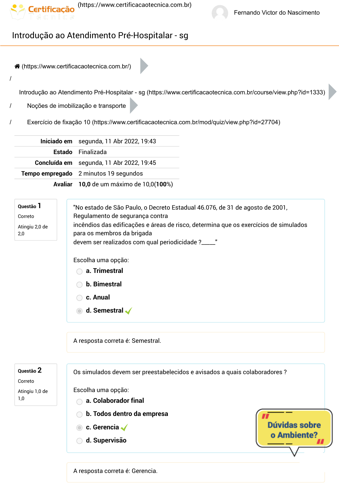 (https://www.certificacaotecnica.com.br) Fernando Victor do Nascimento Introdução ao Atendimento Pré-Hospitalar - sg Questão 1 Correto Atingiu 2,0 de 2,0 Questão 2 Correto Atingiu 1,0 de 1,0 / / / Iniciado em segunda, 11 Abr 2022, 19:43 Estado Finalizada Concluída em segunda, 11 Abr 2022, 19:45 Tempo empregado 2 minutos 19 segundos Avaliar 10,0 de um máximo de 10,0(100%) "No estado de São Paulo, o Decreto Estadual 46.076, de 31 de agosto de 2001, Regulamento de segurança contra incêndios das edificações e áreas de risco, determina que os exercícios de simulados para os membros da brigada devem ser realizados com qual periodicidade ?_____" Escolha uma opção: a. Trimestral b. Bimestral c. Anual d. Semestral A resposta correta é: Semestral. Os simulados devem ser preestabelecidos e avisados a quais colaboradores ? Escolha uma opção: a. Colaborador final b. Todos dentro da empresa c. Gerencia d. Supervisão A resposta correta é: Gerencia. (https://www.certificacaotecnica.com.br/) Introdução ao Atendimento Pré-Hospitalar - sg (https://www.certificacaotecnica.com.br/course/view.php?id=1333) Noções de imobilização e transporte Exercício de fixação 10 (https://www.certificacaotecnica.com.br/mod/quiz/view.php?id=27704) https://www.certificacaotecnica.com.br/ https://www.certificacaotecnica.com.br/ https://www.certificacaotecnica.com.br/course/view.php?id=1333 https://www.certificacaotecnica.com.br/mod/quiz/view.php?id=27704 Questão 3 Correto Atingiu 1,0 de 1,0 Questão 4 Correto Atingiu 2,0 de 2,0 Questão 5 Correto Atingiu 1,0 de 1,0 Em qual cidade foi iniciado o Primeiro PAM do País ? Escolha uma opção: a. Duque de Caxias/ RJ b. Paulinia/SP c. Cubatão/ SP d. Belo Horizonte/MG A resposta correta é: Cubatão/ SP. "Qual objetivo a simulação com vítimas ?_____" Escolha uma opção: a. verificar se as equipes terão coragem na hora de uma ocorrencia real b. Descobrir quem tera medo na hora do simulado para poder transformar em chacota na empresa depois c. Para produzir uma maior adrenalina e agilidade durante o simulado d. visa testar as habilidades das equipes de emergência em abordar a vítima, reconhecer as lesões, suas atitudes e condutas frente ao desafio. A resposta correta é: visa testar as habilidades das equipes de emergência em abordar a vítima, reconhecer as lesões, suas atitudes e condutas frente ao desafio.. Qual das normas descritas abaixo NÃO preve realização de simulados ? Escolha uma opção: a. NR - 10 b. NR - 29 c. NR - 33 d. NR - 23 A resposta correta é: NR - 10. Questão 6 Correto Atingiu 1,0 de 1,0 Questão 7 Correto Atingiu 2,0 de 2,0 Em que ano foi criado o Primeiro PAM do País ? Escolha uma opção: a. 1918 b. 1979 c. 1959 d. 1969 A resposta correta é: 1959. "Quando entrara em vigor o PAM ?_____" Escolha uma opção: a. Sempre que houver um incendio na empresa b. quando o corpo de bombeiros militar do estado autorizar seu acionamento c. quando os recursos de combate ou de emergência da empresa não são suficientes para o controle e passa ser necessário o auxílio de outras empresas d. Quando as empresas se reunirem e se fizer necessário em votação seu inicio A resposta correta é: quando os recursos de combate ou de emergência da empresa não são suficientes para o controle e passa ser necessário o auxílio de outras empresas.