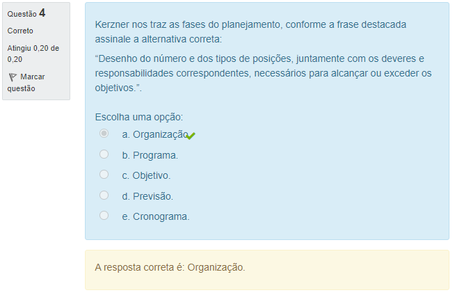 Kerzner nos traz as fases do planejamento, conforme a frase destacada. Atingiu 0,20 de 0,20 "Desenho do número e dos tipos de posições, juntamente com os deveres e responsabilidades correspondentes, necessários para alcançar ou exceder os objetivos." Escolha uma opção: a. Organização b. Programa. c. Objetivo. d. Previsão. e. Cronograma.