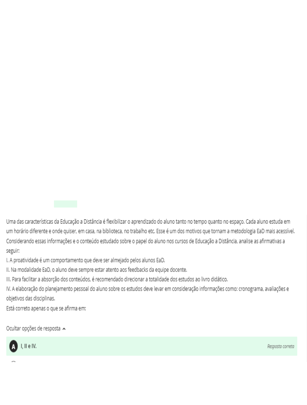 Ensino Digital Unidades 1, 2, 3 e 4 (40 questões) Uma das características da Educação a Distância é flexibilizar o aprendizado do aluno tanto no tempo quanto no espaço. Cada aluno estuda em um horário diferente e onde quiser, em casa, na biblioteca, no trabalho etc. Esse é um dos motivos que tornam a metodologia EaD mais acessível. Considerando essas informações e o conteúdo estudado sobre o papel do aluno nos cursos de Educação a Distância, analise as afirmativas a seguir: I. A Proatividade é um comportamento que deve ser almejado pelos alunos EaD. II. Na modalidade EaD, o aluno deve sempre estar atento aos feedbacks da equipe docente. III. Para facilitar a absorção dos conteúdos, é recomendado direcionar a totalidade dos estudos ao livro didático. IV. A elaboração do planejamento pessoal do aluno sobre os estudos deve levar em consideração informações como: cronograma, avaliações e objetivos das disciplinas. Está correto apenas o que se afirma em: Resposta Correta: I, II e IV. ___________________________________________________________________________________ A Educação a Distância pode ser encarada como uma tendência na educação e uma opção para muitos estudantes que procuram na flexibilidade da EaD uma forma de buscar conhecimento, aliando seus estudos à rotina puxada do dia a dia. Considerando essas informações e o conteúdo estudado sobre as características da Educação a Distância, é possível concluir que: _______________________________________________________________________________________ A Educação a Distância só é possível devido à evolução das Tecnologias de Informação e Comunicação (TICs). São elas que possibilitam o acesso aos conteúdos de maneira rápida, em um ambiente de aprendizagem interativo e inovador. Considerando essas informações e o conteúdo estudado sobre tecnologias aplicadas à EaD, responda: qual tecnologia de informação fornece um ambiente on-line onde o aluno pode acessar as aulas e realizar as atividades? _________________________________________________________________________________________ Leia o excerto a seguir: “Na EaD, o aluno deve se atentar aos calendários, aos prazos, às atividades, pois, por exemplo, caso existam trabalhos e provas para realizar em determinado período, se a data finalizar e o horário se encerrar às 23h59 no sistema, o processo simplesmente é finalizado e o estudante não tem mais possibilidades de entregá-lo. ” Fonte: MUNDO RH. EaD é mais fácil? A responsabilidade do aluno no ensino EAD. 2018. Disponível em: <https://www.mundorh.com.br/ead-e-mais-facil-a-responsabilidade-do-aluno-no-ensino-ead/>. Acesso em: 09 abr. 2020. (Adaptado). Considerando essas informações e o conteúdo estudado sobre tecnologias empregadas nos cursos EaD, é possível concluir que: _______________________________________________________________________________________ Leia o excerto a seguir: “A prática pedagógica deve preocupar-se em desenvolver quatro aprendizagens fundamentais: aprender a conhecer indica o interesse, a abertura para o conhecimento, que verdadeiramente liberta da ignorância; aprender a fazer mostra a coragem de executar, de correr riscos, de errar mesmo na busca de acertar; aprender a conviver traz o desafio da convivência que apresenta o respeito a todos e o exercício de fraternidade como caminho do entendimento; e, finalmente, aprender a ser, que, talvez, seja o mais importante por explicitar o papel do cidadão e o objetivo de viver”. Fonte: RODRIGUES, Z. B. Os quatro pilares de uma educação para o século XXI e suas implicações na prática pedagógica. Pedagogia ao pé da letra, 2020. Disponível em: <https://pedagogiaaopedaletra.com/os-quatro-pilares-de-uma-educacao-para-o-seculo-xxi-e-suas-implicacoes-na-pratica-pedagogica/>. Acesso em: 03 abr. 2020. Considerando essas informações e o conteúdo estudado sobre a educação do século XXI, é possível concluir que: Na metodologia de cursos que acontecem totalmente pela internet, também conhecidos como e-learning, não há nenhum tipo de contato físico entre aluno e professor, ou seja, todo o processo acontece por meio de plataformas que criam uma sala virtual. Considerando essas informações e o conteúdo estudado sobre a metodologia aplicada na EaD do grupo Ser Educacional, analise as afirmativas a seguir e assinale V para a(s) verdadeira(s) e F para a(s) falsa(s). I. ( ) A equipe técnica e pedagógica é responsável pela elaboração dos conteúdos das disciplinas. II. ( ) O suporte dos tutores especialistas é permanente e sofre supervisão de professores executores, que conduzem todo o processo de aplicação das disciplinas. III. ( ) O modelo de ensino do grupo Ser Educacional é focado na figura do professor, na qual é centrado o processo de aprendizagem. IV. ( ) O estudante possui liberdade para organizar seus estudos a partir dos recursos disponibilizados. Agora, assinale a alternativa que apresenta a seqüência correta: __________________________________________________________________________________________ Leia o excerto a seguir: “Fazer um curso que não exige presença diária na sala de aula e é você quem decide como, onde e quanto estudar parece fácil. Mas não é! Essa é a principal “surpresa” que os alunos costumam encontrar ao decidir cursar uma graduação a distância. Estudar sozinho em frente ao computador, sem um professor dando a matéria e sem a companhia dos colegas de turma, e ainda respeitar a carga horária das disciplinas, pesquisar na internet, assistir a vídeos, fazer as tarefas, participar de chats e fóruns não é pouca coisa. E se a instituição de ensino for boa, é preciso estudar até mais do que num curso presencial!” Fonte: GUIA DO ESTUDANTE. Cinco características para ser bem-sucedido em um curso de EaD. 2015. Disponível em: <https://guiadoestudante.abril.com.br/universidades/cinco-caracteristicas-fundamentais-para-v