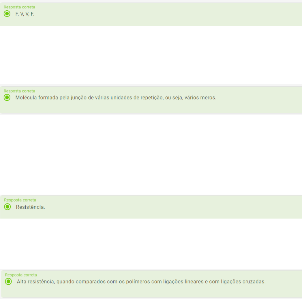 1 - Umas das principais classificações usualmente utilizadas para materiais poliméricos é em relação à periodicidade de sua rede, em que os polímeros podem ser classificados em amorfo ou semicristalino. A periodicidade da rede dos polímeros terá grande influência em suas propriedades. Considerando essas informações e conteúdo estudado sobre a periodicidade de rede dos polímeros, analise as afirmativas a seguir e assinale V para a(s) verdadeira(s) e F para a(s) falsa(s). I. ( ) Os materiais poliméricos podem ser classificados como materiais totalmente cristalinos. II. ( ) Os materiais poliméricos semicristalinos possuem regiões desordenadas e regiões ordenadas. III. ( ) Os materiais poliméricos amorfos são materiais que não possuem boa periodicidade. IV. ( ) Os materiais poliméricos amorfos possuem regiões ordenadas em sua rede cristalina. Agora, assinale a alternativa que apresenta a sequência correta: 2 - Os materiais poliméricos são formados, geralmente, por hidrocarbonetos, ou seja, materiais formados por carbono e hidrogênio. Além disso, os polímeros são formados por grandes moléculas, denominadas macromoléculas que são constituídas por meros. O termo monômero se refere a uma molécula que é formada por apenas um único mero, ou seja, apenas uma única unidade de repetição. Considerando essas informações e conteúdo estudado, responda: qual é o significado da palavra Polímero? 3 - Em algumas técnicas de fabricação de cerâmicas, a matéria-prima está em forma pó. Após a compactação ou a conformação dessas partículas pulverizadas na forma desejada, haverá poros ou espaços vazios entre as partículas do pó. Durante o tratamento térmico subsequente, a maior parte dessa porosidade será eliminada, entretanto, com frequência, esse processo de eliminação de poros é incompleto e certa porosidade residual permanece. Fonte: CALLISTER JUNIOR, W. D.; RETHWISCH, D. G. Ciência e engenharia de materiais: uma introdução. Rio de Janeiro: LTC, 2016. p. 513. Com base nessas informações, responda: qual é a propriedade mecânica que será mais afetada pela presença de porosidade? 4 - Os polímeros com ligações cruzadas são formados por cadeias que possuem ligações cruzadas umas às outras através de ligações covalentes, ou seja, ligações fortes. Um material polimérico que possui muitas ligações cruzadas é denominado um polímero com ligações em rede. Com base nessas informações, em comparação com os polímeros com ligações lineares, qual é a propriedade mecânica que melhor se encaixa nos polímeros que possuem muitas ligações cruzadas? 5 - As principais propriedades dos elastômeros são: alta elasticidade, macios e alta flexibilidade. Devido a essas propriedades, esses materiais são altamente aplicados em pneus, vedações, luvas, dentre outras aplicações. Apesar de possuírem excelentes propriedades que os proporcionam diversas aplicações, os elastômeros não possuem somente vantagens em suas aplicações. Com base nessas informações, responda: qual desvantagem dos elastômeros acabam restringindo esses materiais em diversas aplicações? 6 - A expressão fiberglass ou fabricado em fibra identifica um compósito que consiste em fibras de vidro, contínuas ou descontínuas, contidas em uma matriz polimérica; esse tipo de compósito é produzido em grande quantidade. A composição do vidro mais comumente estirado na forma de fibras é o Vidro-E. Fonte: CALLISTER JUNIOR, William D.; RETHWISCH, David G. Ciência e engenharia de materiais: uma introdução. Rio de Janeiro: LTC, 2016. p. 666. Considerando a classificação e propriedade das fibras de vidro, analise as afirmativas a seguir. I. As fibras de vidro podem ser classificadas como R e S. II. As fibras de vidro são um exemplo de utilização das fibras sintéticas. III. As fibras de vidro possuem baixa resistência pelo fato de possuírem uma quantidade pequena de defeitos submicroscópicos. IV. A classificação dos tipos de fibras de vidro deve ser feita entre os tipos C e E. 7 - O grau de cristalinidade pode variar desde completamente amorfo até quase totalmente (até aproximadamente 95%) cristalino; em comparação, as amostras de metais são quase sempre inteiramente cristalinas, enquanto muitas cerâmicas são totalmente cristalinas ou totalmente não cristalinas. Os polímeros semicristalinos são, em certo sentido, análogos às ligas metálicas bifásicas que foram consideradas anteriormente. Fonte: CALLISTER JUNIOR, W. D.; RETHWISCH, D. G. Ciência e engenharia de materiais: uma introdução. Rio de Janeiro: LTC, 2016. p. 579. Considerando que o grau de cristalinidade irá exercer influência sobre as propriedades dos materiais poliméricos, analise as afirmativas a seguir. I. O grau de cristalinidade é uma das principais propriedades dos materiais poliméricos, pois, através dele, será possível identificar algumas propriedades como: dureza, densidade, ductilidade e resistência a solvente e ao calor. II. O grau de cristalinidade está desassociado de influência quando os materiais poliméricos estiverem como componentes de um material compósito. III. À medida que o grau de cristalinidade aumenta, a ductilidade do material aumenta também. IV. À medida que o grau de cristalinidade aumenta, a dureza e a resistência ao calor aumentam. Está correto apenas o que se afirma em: 8 - A fase matriz dos compósitos pode ser formada por polímeros, metais ou cerâmicos. A matriz tem como principais funções ligar o reforço, geralmente na forma de fibra, uns aos outros, e distribuir as tensões dentre eles. Além disso, a matriz tem como função manter o espaçamento entre as fibras e também manter sua orientação. Considerando essas informações e conteúdo estudado sobre compósitos, analise as afirmativas a seguir e assinale V para a(s) verdadeira(s) e F para a(s) falsa(s). I. ( ) A matriz cerâmica é responsável por dar exce