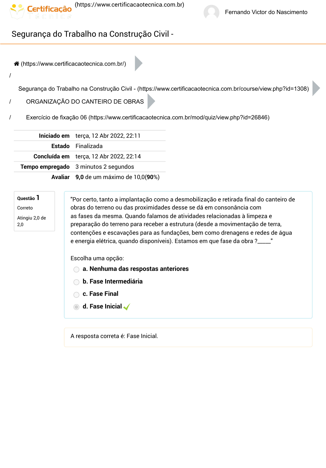 (https://www.certificacaotecnica.com.br) Fernando Victor do Nascimento Segurança do Trabalho na Construção Civil - Questão 1 Correto Atingiu 2,0 de 2,0 / / / Iniciado em terça, 12 Abr 2022, 22:11 Estado Finalizada Concluída em terça, 12 Abr 2022, 22:14 Tempo empregado 3 minutos 2 segundos Avaliar 9,0 de um máximo de 10,0(90%) "Por certo, tanto a implantação como a desmobilização e retirada final do canteiro de obras do terreno ou das proximidades desse se dá em consonância com as fases da mesma. Quando falamos de atividades relacionadas à limpeza e preparação do terreno para receber a estrutura (desde a movimentação de terra, contenções e escavações para as fundações, bem como drenagens e redes de água e energia elétrica, quando disponíveis). Estamos em que fase da obra ?_____" Escolha uma opção: a. Nenhuma das respostas anteriores b. Fase Intermediária c. Fase Final d. Fase Inicial A resposta correta é: Fase Inicial. (https://www.certificacaotecnica.com.br/) Segurança do Trabalho na Construção Civil - (https://www.certificacaotecnica.com.br/course/view.php?id=1308) ORGANIZAÇÃO DO CANTEIRO DE OBRAS Exercício de fixação 06 (https://www.certificacaotecnica.com.br/mod/quiz/view.php?id=26846) https://www.certificacaotecnica.com.br/ https://www.certificacaotecnica.com.br/ https://www.certificacaotecnica.com.br/course/view.php?id=1308 https://www.certificacaotecnica.com.br/mod/quiz/view.php?id=26846 Questão 2 Correto Atingiu 1,0 de 1,0 Questão 3 Correto Atingiu 1,0 de 1,0 Questão 4 Correto Atingiu 1,0 de 1,0 Quais são as primeiras medidas para o adequado processamento da produção em todos os tipos de indústria ? Escolha uma opção: a. Abertura de aceiro e delimitação de área b. planejamento e o estabelecimento do arranjo físico c. Execução imediata e cercamento de área d. Derrubada de arvores e execução de estrutura em qualquer lugar A resposta correta é: planejamento e o estabelecimento do arranjo físico. Qual Norma Brasileira defini o conceito de canteiro de obra ? Escolha uma opção: a. NBR 17711/2000 b. NBR 12284/1991 c. NBR 12280/1998 d. NBR 12284/1992 A resposta correta é: NBR 12284/1991. "Por certo, tanto a implantação como a desmobilização e retirada final do canteiro de obras do terreno ou das proximidades desse se dá em consonância com as fases da mesma. Quando falamos de revestimento e de acabamento da obra, etapa de grande diversidade de atividades e de atuação de distintos profissionais especializados. Estamos em que fase da obra ?_____" Escolha uma opção: a. Fase Intermediária b. Nenhuma das respostas anteriores c. Fase Final d. Fase Inicial A resposta correta é: Fase Final. Questão 5 Correto Atingiu 1,0 de 1,0 Questão 6 Correto Atingiu 1,0 de 1,0 Questão 7 Incorreto Atingiu 0,0 de 1,0 Quais dos setores descritos abaixo não se classifica como de Pré Produção ? Escolha uma opção: a. Serraria e Carpintaria b. Soldagem e corte a quente c. Centrais de concreto e de argamassa d. Escritorios e Lazer A resposta correta é: Escritorios e Lazer. Qual a definição para canteiro de obra ? Escolha uma opção: a. Conjunto de áreas destinadas à execução e apoio dos trabalhos da indústria da construção, dividindo-se em áreas operacionais e áreas de vivência. b. Terreno a ser limpo e nivelado para construção c. Espaço destinado a construir d. Local onde fica um responsavel com vários colaboradores executando atividades de alvenaria no local A resposta correta é: Conjunto de áreas destinadas à execução e apoio dos trabalhos da indústria da construção, dividindo-se em áreas operacionais e áreas de vivência.. "Por certo, tanto a implantação como a desmobilização e retirada final do canteiro de obras do terreno ou das proximidades desse se dá em consonância com as fases da mesma. Quando falamos de preparação e produção da estrutura em si, passando pela alvenaria e instalações em geral. É a etapa de maior ocupação de mão de obra e de consumo de insumos, sendo considerada a fase dos “grandes volumes” de pessoal e de material. Estamos em que fase da obra ?_____" Escolha uma opção: a. Fase Final b. Fase Intermediária c. Nenhuma das respostas anteriores d. Fase Inicial A resposta correta é: Fase Intermediária. Questão 8 Correto Atingiu 2,0 de 2,0 "Dentre as ações relacionadas ao planejamento e implantação dos canteiros de obras, esta previsto a comunicação prévia da obra à SRTE, devendo ser informado I - endereço; II - nomes e contatos dos responsáveis ou interessados; III - tipo de obra; IV - datas de início e conclusão; e V - número máximo de trabalhadores previsto. Quais dos itens não sera necessário informar ?_____" Escolha uma opção: a. I e III b. III e V c. todos devem ser informados d. II e IV A resposta correta é: todos devem ser informados.