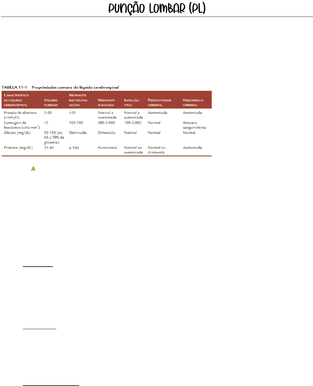 CIRURGIA Carolina Ferreira -A punção lombar (PL) é um procedimento diagnóstico e terapêutico comum, é realizada + comumente p/ obter uma amostra de líquido cerebrospinal (LCR) p/ ajudar a estabelecer diagnósticos neurológicos -O LCR é um ultrafiltrado do plasma que tem como função a proteção mecânica do SNC e biológica contra agentes infecciosos. Seu volume total é de 125 a 150 mL, sendo formado principalmente nos plexos coroides dos ventrículos laterais e reabsorvido nas vilosidades subaracnóideas por meio da circulação venosa. -Durante uma PL, a agulha espinal penetra a pele, o tecido subcutâneo, o ligamento espinal, a dura-máter e a aracnoide antes de entrar no espaço subaracnóideo. Geralmente são obtidas 4 amostras de LCR -Exames usuais incluem: cultura bacteriana e coloração de Gram do tubo 1, proteína e glicose do tubo 2, contagem das células sanguíneas e diferencial do tubo 3 e exames opcionais como culturas virais, culturas p/ fungos, imunoeletroforese, exames c/ tinta da Índia ou aglutinação do látex do tubo 4 -Achados sugestivos de meningite bacteriana: contagem absoluta de leucócitos no LC de >500 μL, glicose sanguínea ≤0,4, um nível de lactato de ≥31,5 e a presença de bactérias na coloração de Gram Contudo, a ausência de bactérias na coloração de Gram ñ exclui meningite bacteriana - A punção lombar frequentemente é reservada p/ bebês que demonstram hipotermia, hipertermia, má alimentação 24 horas após o nascimento, coma ou convulsões. O US de beira de leito tem substituído a PL no diagnóstico de hemorragia intracraniana. Apenas cerca de metade das PL em RN são completadas c/ sucesso, e as punções traumáticas (c/ sangue) são comuns. A complicação + comum é a cefaleia pós-PL (espinal), que ocorre em 10 a 25% dos pacientes. A cefaleia frequentemente persiste por dias. -Uma complicação potencial + grave é a herniação cerebral pela elevação da PIC que frequentemente é causada por uma massa supratentorial. Antes de realizar uma PL, sempre verificar o fundo de olho p/ a presença de papiledema. Se houver suspeita de de pressão por um tumor ou sangramento intracraniano, uma TC ñ contrastada de emergência deve ser obtida antes p/ reduzir o potencial de herniação. -A aspiração inadvertida das raízes nervosas ao se retirar a agulha pode ser evitada c/ a reposição do estilete antes de retirá-la. MATERIAIS • Bandeja de punção lombar • Agulha atraumática (Sprotte ou Pajunk), que tem uma abertura no lado ao final da agulha, ou agulha padrão (Quincke), que tem um bisel padrão, com introdutor, 22 a 26G • Anestesia local p/ injeção • Iodopovidona ou clorexidina (Chlorohex) p/ esterilização do campo • 4 tubos estéreis p/ coleta com etiquetas de 1 a 4 • Manômetro p/ medida da pressão do LCR, se necessário • Curativo para aplicação após o procedimento INDICAÇÕES • Processos infecciosos do sistema nervoso e seus envoltórios • Processos desmielinizantes • Processos granulomatosos com imagem inespecífica • Leucemias e linfomas (estadiamento e tratamento) • Imunodeficiências (particularmente a Aids) • Processos infecciosos com foco não definido • Hemorragia subaracnóidea • Aplicação, por via raquiana, de medicamentos ou de substâncias utilizadas para fins diagnósticos • Punção esvaziadora ou de “alívio” nos casos de hidrocefalia a pressão normal e hidrocefalia comunicante de qualquer etiologia CONTRAINDICAÇÕES • Instabilidade hemodinâmica • Vigência de síndrome de hipertensão intracraniana c/ efeito de massa • Sinais de herniação cerebral • Sinal neurológico focal • Distúrbios de coagulação • Infecções cutâneas na região lombar, nos pontos em que pode ser feita a punção • Bacteremia, quando ñ há ainda controle adequado das condições gerais do paciente, sobretudo antes da instalação da antibioticoterapia. O pertuito aberto pela agulha pode servir de ponta de entrada p/ o agente infeccioso atingir as meninges CIRURGIA Carolina Ferreira PROCEDIMENTO 1. Explicar todo o procedimento p/ o paciente. 2. Posicionar o paciente e marcar o local de punção (entre L3-l4 ou L4-L5). Posicionar o pct em decúbito lateral esquerdo, c/ as costas próximo à borda da cama ou mesa de exame e c/ a coluna fletida e os joelhos próximos ao tórax. Assegurar que os ombros e as costas estejam perpendiculares à mesa. Colocar um travesseiro sob a cabeça do pct p/ manter a coluna o + reta possível. Um método alternativo é colocar o paciente em posição sentada, apoiado sobre uma mesa ou c/ 2 travesseiros grandes no colo, c/ a coluna fletida anteriormente. Evitar uma flexão forçada do pescoço durante o procedimento porque isso pode provocar uma parada cardiorrespiratória em crianças. Se o pct estiver girado, então a inserção da agulha pode ser lateral e ñ penetrar o espaço subaracnóideo. 3. Antissepsia c/ material de preferência incolor 4. Fazer botão anestésico c/ lidocaína sem vasoconstritor (discutível na literatura) 5. Introduzir a agulha de forma perpendicular ao plano do corpo, no espaço intervertebral, com uma leve inclinação no sentido cefálico, mas sempre em linha média; bisel lateralizado 6. Usar os indicadores unidos como ponto de apoio na pele p/ empurrar a agulha até o espaço subaracnóideo. 7. Remover o mandril para observação do fluxo pela agulha 8. Se ñ houver drenagem de liquor, repassar o mandril e continuar avançando em pequenas progressões (2 a 3 mm) 9. Quando a dura-máter é vencida, tem-se uma sensação abrupta de perda de resistência 10. Se a resistência é intensa, analisar a possibilidade de punção do corpo vertebral. Retirar a agulha até uma posição média e reordená-la, sempre em linha média 11. Caso o fluxo ñ apareça, deve-se tentar uma rotação suave da agulha. Estar atento à manutenção do bisel da agulha p/ cima após chegar ao espaço subaracnóideo 12. d