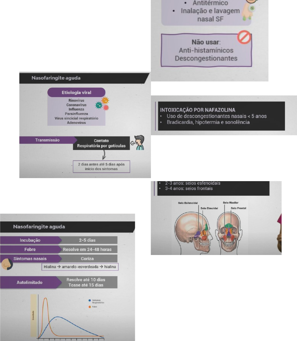 IVAS nasofarigite aguda(resfriado comum ) outono→rinovirus e parainflueza inverno→adenovius e cornavirus periodo de febre pode ter sintomas sistemicos ( mialgia, cefaleia , dor de garganta ) sintomas respiratorios atinem o pico quando ja acabou o pico da febre, tosse pode persistir po 15 dias a 3 semanas mesmo apos ter resolvido os outros sintomas TRATAMENTO tratamento apenas de suporte no ps ( melhora apos 12 / 24 horas ), nunca prescrever para menores de 5 anos SINUSITE BACTERIANA aeracao é progressiva ao longo da infancia , etmodial, esfenoidal e maxilares so estarao totalmente aerados aoss 13/14 anos, os frontais continuam sofrer aeracao depois dos 18 anos ( raio x de seios da face é dificl de interpretar em criancas pois naoe stao bem desenvolvidos ainda ) inflmacao da mucosa que reveste a cavidade dos seios parasais ( rinossinusite quando acomete a mucosa nasal tambem ) maioria dos casos é viral, em 10% dos casos evoluem para sinusite bacteriana bacteriana mais comum :criancas tem fator anatomico para obstrucao, acumulo de secrecao de etiolgia viral e a bacteria se prolifera na regiao ( situacoes anatomicas→ hipertrofia de adenoide, desvio septo, polipo nasal ) aspergillus em imunodeprimidos DIAGNOSTICO diagnostico quando quadro viral nao se resolve espontaneamente, SINTOMAS PERSISTENTES DE RESFRIADO ( CORIZA, TOSSE DIURNO QUE PIORA A NOITE POR MAIS DE 10 DIAS , PASSOU DISO A CHANCE DE TER OCORRIDO INFECCAO BACTERIANA É GRANDE ) EXAMES COMPLEMENTARES rx inutil pois quadros virais sao autolimitados e podem causar com a mesma imagem de sinusite bacteriana ( nao faz dx diferencial ) nao fazer tomo sempre MECANIMSO DE RESISTENCIA BACTERIANA h influenza e m. catharralis→nao adianta aumentar a dose de penicilina, associar um inibidor de beta lactamase → CEFALOSPORINAs CONDUTA pode ser feita observacao por 3 dias ( quando o dx foi feito pela persistencia dos sintomas por mais de 10 dias ) pode esperar mais 3 dias ai entra com ATB ou ATB imediato ( dx foi feito pela piora dos sintomas OU paciente que ja inicou com sinotmas graves Ou pacientes com faotres de risco para maior resistencia bacteriana - atb nas ultimas 4 semanas, outras infeccoes bacteriasna associas - otite, suspeita de complicacao supurativa ou criancas com doencas cronicas - asma , fibrose cistica, imunodeficiencai ) amoxi→ 2 anos ou mais com quadro leve ou moderado , nao frequenta creche, sem atb nos ultimos 30 dias ( dobrar dose em ambiente com resistencia elevada ao pneumocoo) amoxicilina -clavulanato→possibilidade de ressitencia por producao de b lactamase, < 2 anos com doenca mis grave, freuqnta creche, atb recente axetilcefuroxima→ alergia a amoxi mas sem alergia a cefalosporina claritomicina→paicentes mt alergicos ( cefalos e amoxi ), quadros de anafilaxia a amoxi 10 dias ou apos 7 dias de melhora clinica do paciente FALHA TERAPEUTICA aumentar o espcetro do atb, levar em consideracao mecanismo de resistencia bacteriana COMPLICACOES CELULITE PERIORBITAL ( pre septal ) sinusite etmoidal comprometea drenagem venosa da regiao perioerbitaria leve→ considerar internacao se nao melhorar com atb por 24/48 horas tc para diferenciar de celulite intraorbitaira CELULITE INTRAORBITARIA ( POS SEPTAL )alteracao da mobildiade dos musculos extra oculares ( limitacao da aducao do olho ) OTITE MEDIA AGUDA orelha media → tuba auditiva(comunica o ouvido medico om a rinofaringe, protege contra secrecao, gradiente de pressao da nasofaringe, permite a drenagem da secrecao da orelha media em direcao a rinofaringe, equalizacao com a pressao atm ), membrana timpanica , ossiculos → martelo, bigorna e estribo ( transformacao das ondas sonoras em energia mecanica que vai ser transmitida oara a orelha interna ate o SNC) tuba auditiva nessa idade é mais curta e horizontalidzada, prejudica o mecanismo antirrefluxo e dificulta o mecanismo de drengaem de secrecao da orelha media ) edema causa obstrucao da tuba auditiva, gera presao negativa na o media, facilita o acumulo de secrecoes, ocorre replicacao bacteriana QUADRO CLINICO E EXAME FISICO CONDUTA observar por 3 dias ( se nesse periodo piorar ou persistir os sintomas, dar ATB ) ATB IMEDIATO ( imunodeficiente ou implante coclear ) amoxi→ 50 mg < 2 anos ou sintomas graves→ 10 dias > 2 anos com sintomas nao graves → 5 a 7 dias sempre dar analgesico mamadeira deitada→ horizontaliza a tuba auditiva ( passagem do leite da rinofaringe para a orelha media ) fator de risco→ alietamneto amenroe xlcusivo < 3 meses, tabagismo apssivo, masculino, frequentar creche pode ser necessario aumentar o espectro do ATB caso ja tenha utilizado sem efeito FARINGOTONSILITE AGUDA Anel linfatico de Waldeyer → estruturas que fazem defesa de primeira linha contra agente que queiram entrar no trato respiratorio e digestivo, linfocitos B atividade linfatica dessas estruturas maior entre 4 e 10 anos, apos reduz a atividade inflamacao da mucosa faringea ( inflamacao das tonsilas ) maioria dos casos é viral e autolimitado ( uso de sintomaticos ) s, pyogenes ( respossanvel por 30 a 40 % , pode ser colinizadora de via aerea superior ) QUADRO CLINICO diarreia e vesiculas, faringotonsilite aguda achados especificos herpangina → vesiculas localizadas em plato mole, amgidalsa e uvulas, se rompem e causam ulceras rasas febre muito alta febre por 10 a 14 dias que se associam a amigdalite exsudativa, pode causar exantema apos uso de amoxi ( hiper sensibildiade tansitoria a beta lactamico ) achados sugestivos de bacterias exantema em lixa colher exame em pacientes usgetsuvos de infeccao bacteriana cultura de orofaringe→ strep teste negativo e suspeita clinica de bacteria persite, fazer a cultura de orofaringe s,pyogenes pode ser uma bacteria que pode colonizar a orofaringe, produrar apenas com sintomas sugetsivos, nao fazer dx etiologico em todos os pacientes tratamento em ate 9 dias( precoce ) do inicio do quadro, consegue prevenir febre reumatica (crianca deixa de ser contagiante em 24 horas ) s