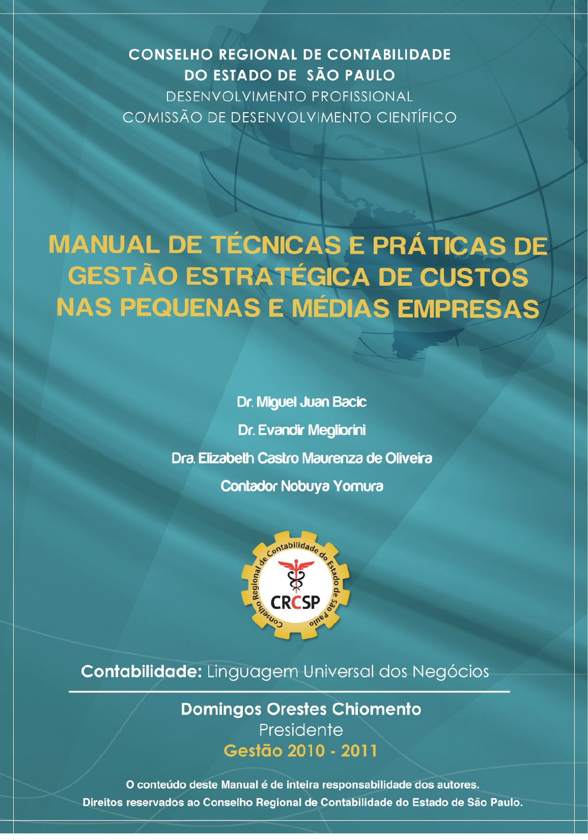 i MANUAL DE TÉCNICAS E PRÁTICAS DE GESTÃO ESTRATÉGICA DE CUSTOS NAS PEQUENAS E MÉDIAS EMPRESAS ii MANUAL DE TÉCNICAS E PRÁTICAS DE GESTÃO ESTRATÉGICA DE CUSTOS NAS PEQUENAS E MÉDIAS EMPRESAS Miguel Juan Bacic Professor Associado do Instituto de Economia da Universidade Estadual de Campinas. Presidente da Associação Brasileira de Custos (gestão 2010-2012) e ex-presidente do Instituto Internacional de Custos (gestão 2003-2007). Autor do livro “Gestão de custos: uma abordagem sob o enfoque do processo competitivo e da estratégia”, Juruá Editora, 2008. Evandir Megliorini Professor da Universidade Federal do ABC – UFABC. Autor do livro “Custos – Análise e Gestão”, Pearson Prentice Hall, 2007. Co-autor do livro “Administração Financeira – uma abordagem brasileira”, Pearson Prentice Hall, 2009. Organizador e Autor de capítulos do livro “Contabilidade gerencial”, Atlas, 2011. Nobuya Yomura Contador, conselheiro do CRC SP, Coordenador do curso de Escolas Particulares do Grande ABC, Co-autor do livro Ciências Contábeis da Faculdade Uniesp – Sto André e professor de contabilidade da Faculdade Anchieta –SBC, Diretor da Associação das Capital Intelectual, consultor de custos e formação de preço. Elizabeth Castro Maurenza de Oliveira Coordenadora do Curso de Ciências Contabeis e docente nos cursos de graduação e pós-graduação da FAE na Universidade Metodista de São Paulo, conselheira do CRC SP nas gestões 2008/2010 e 2011/2012 atuando como membro em comissões de assessoria na Camara de Desenvolvimento Profissional. Membro do Comitê Executivo e do Comitê Científico dos Congressos de Iniciação Científica e Produção de Pesquisa e Extensão da Universidade Metodista. Co-autora do livro Capital Intelectitual – Reconhecimento & Mensuração – Juruá Editora – 1ª ed. 2008 / Reimpressão 2009. Colaboradora em outras obras e revistas especializadas. iii MANUAL DE TÉCNICAS E PRÁTICAS DE GESTÃO ESTRATÉGICA DE CUSTOS NAS PEQUENAS E MÉDIAS EMPRESAS AGRADECIMENTOS 1. Ao Contador Domingos Orestes Chiomento, Presidente do Conselho Regional de Contabilidade (colocar a gestão) que, pelo Ofício SEC n° 151/2009 de 08.12.2009, propôs a criação da Comissão de Desenvol- vimento Científico (CDC). 2. Ao Doutor Nelson Carvalho, ex-Presidente do Comitê Executivo do Interna- tional Accounting Standards Board (IASB) e docente da FEA/USP, que desde o início ofereceu seu apoio à criação da Comissão de Desenvol- vimento Científico (CDC) no CRC SP. 3. A todos os Conselheiros desta Gestão que, por unanimidade, aprovaram a proposta do Ofício CRC SP, SEC n°151/2009. 4. Aos Membros das Diretorias das Entidades Congraçadas que, desde o início, apoiaram a criação da Comissão de Desenvolvimento Científico (CDC) do CRC SP. 5. A todos os Diretores, Funcionários e Colaboradores do CRC SP que apoia- ram e deram a sua melhor contribuição à apresentação dos projetos e elaboração dos “Manuais de Técnicas e Práticas” da Comissão de Desenvolvimento Científico (CDC). iv MANUAL DE TÉCNICAS E PRÁTICAS DE GESTÃO ESTRATÉGICA DE CUSTOS NAS PEQUENAS E MÉDIAS EMPRESAS SUMÁRIO JUSTIFICATIVA ............................................................................................................................ 1 APRESENTAÇÃO ......................................................................................................................... 2 CAPÍTULO 1 – ASPECTOS CONCEITUAIS ................................................................................ 3 1.1. INTRODUÇÃO ................................................................................................................... 3 1.2. IMPORTÂNCIA DAS MICROEMPRESAS E EMPRESAS DE PEQUENO PORTE .......... 3 1.3. CUSTOS NAS MICROEMPRESAS E EMPRESAS DE PEQUENO PORTE .................... 8 1.4. IMPORTÂNCIA DA GESTÃO DE CUSTOS ...................................................................... 9 1.5. CONTROLE DOS GASTOS ............................................................................................ 10 1.6. O QUE SÃO CUSTOS? ................................................................................................... 11 1.7. O QUE SÃO DESPESAS? .............................................................................................. 13 1.8. O QUE SÃO INVESTIMENTOS? .................................................................................... 14 1.9. COMPORTAMENTO DOS CUSTOS .............................................................................. 15 1.10. DETERMINAÇÃO DO CUSTO DOS MATERIAIS E DA MÃO DE OBRA ..................... 17 1.11. OUTROS CUSTOS ........................................................................................................ 28 1.12. CUSTOS DO PONTO DE VISTA ECONÔMICO ........................................................... 29 1.13. LUCRO DO PONTO DE VISTA ECONÔMICO E DO PONTO DE VISTA CONTÁBIL . 30 CAPÍTULO 2. ANÁLISE ESTRUTURAL DE CUSTOS ............................................................... 33 2.1. ESTRUTURA DE CUSTOS ............................................................................................. 33 2.2. ANÁLISE CUSTO – VOLUME – LUCRO, MARGEM DE SEGURANÇA OPERACIONAL E ALAVANCAGEM OPERACIONAL ...................................................................................... 36 2.2.1. Margem de contribuição ........................................................................................... 36 2.2.2. Ponto de equilíbrio .................................................................................................... 36 2.2.3. Tipos de Ponto de Equilíbrio .................................................................................... 40 2.2.4. Margem de segurança operacional .......................................................................... 42 2.2.5. Alavancagem operacional ..............................................