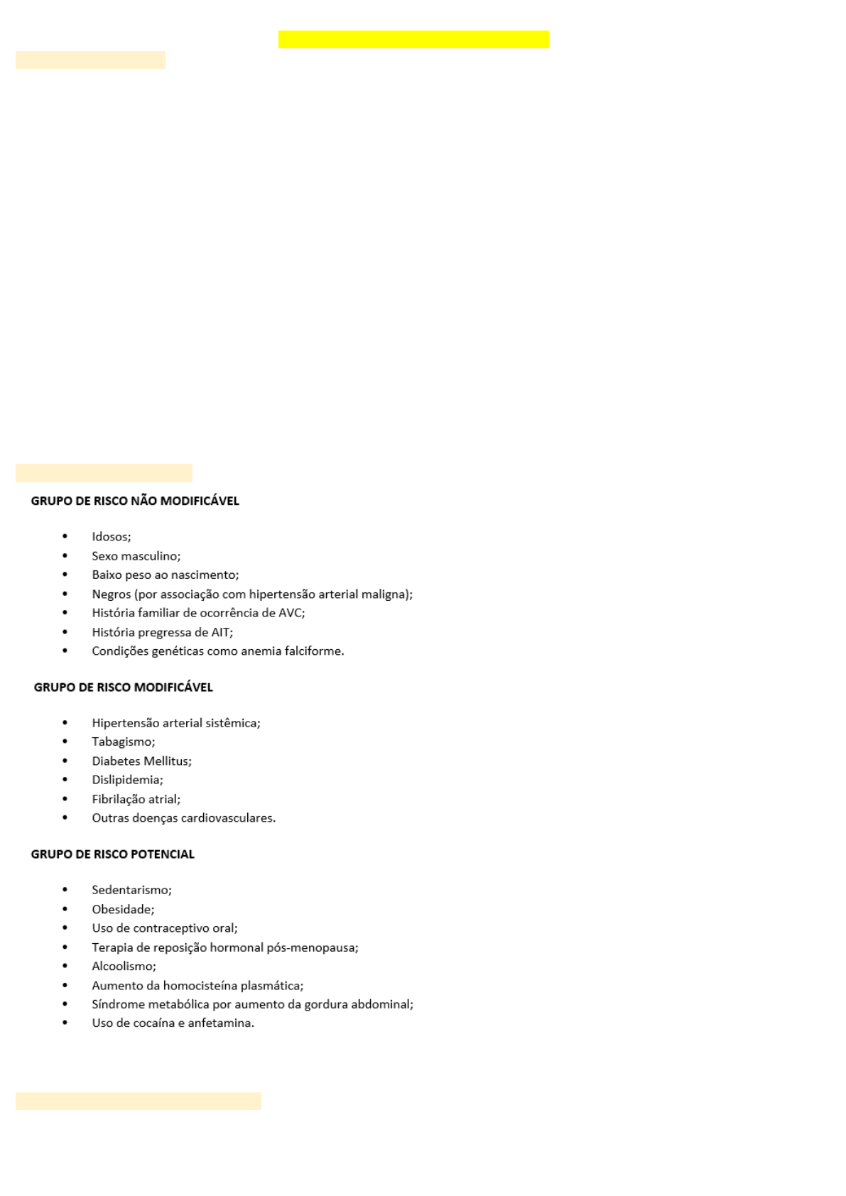 ACIDENTE VASCULAR ENCEFÁLICO 1. EPIDEMIOLOGIA ➔ Segunda maior causa de morte (10% dos óbitos) e incapacidade no país ➔ Incidência anual de 108 casos por 100 mil habitantes ◆ incidência dobra a cada década após os 55 anos e é maior após os 65 anos ➔ Taxa de fatalidade: ◆ 30 dias → 18,5% ◆ 12 meses → 30,9% ◆ índice de recorrência em 1 ano → 15,9% ➔ Ocorre em sua maioria em moradores da zona urbana ➔ Mesma incidência para ambos sexos ➔ Prevalência dos 30 aos 59 anos ➔ Nas últimas décadas houve uma diminuição de 42% do número de AVE em países desenvolvidos, enquanto nos subdesenvolvidos houve um aumento de 100% das taxas ➔ Mortalidade maior em brancos ➔ Recorrência: ◆ As estatísticas apontam que uma a cada três pessoas que tiveram AVC, sofrem desse mal novamente. Isso significa mais ou menos 40% de chance de recorrência nos primeiros 5 anos. ◆ O risco de recorrência de um AVC é maior nos primeiros 30 dias, ainda maior nas primeiras 48h. ◆ O diabetes pode aumentar a probabilidade de AVC em 13%, o estresse em 23%. 2. FATORES DE RISCO 3. CARGA GLOBAL DA DOENÇA 4. FISIOPATOLOGIA A interrupção do fluxo sanguíneo gera isquemia, privando neurônios e células gliais de oxigênio e glicose, e causando disfunção neuronal (quando o fluxo cerebral do oxigênio cai abaixo de 20ml/100mg/min). Caso essa não haja reversão dessa situação, acontece o infarto do núcleo isquêmico, a morte do tecido e uma lesão irreversível. Ao redor da região infartada, existe a zona de penumbra, onde um mecanismo de extração aumentada de oxigênio apesar do baixo fluxo permite que a lesão causada seja potencialmente reversível, contanto que o fluxo sanguíneo seja restaurado (por recanalização do vaso ocluído ou circulação colateral, altamente dependente da pressão arterial – Atenção na fase aguda). Após o infarto neuronal, instala-se principalmente o edema citotóxico (intracelular, devido ao desbalanço da bomba de Na/K pela falta de ATP), mas o edema vasogênico também pode acontecer (mais raramente e principalmente nos estágios tardios do infarto, extracelular, por extravasamento do líquido dos vasos para o parênquima em razão da permeabilidade capilar aumentada), e têm seu pico de 3-4 dias após o AVE, podendo causar complicações como hipertensão intracraniana e herniação cerebral. Nas primeiras 48 horas após o AVE, há migração de neutrófilos e monócitos para a região infartada, contribuindo para a inflamação local e edema cerebral. Após cerca de 10 dias, o edema citotóxico é resolvido, e a zona infartada fica nítida na fotografia. Após esse período, as células fagocitárias produzem necrose de liquefação nessa região, deixando um aspecto cístico pelo centro liquefeito. 5. DIAGNÓSTICO HEMORRÁGICO: ➔ TC de crânio: hiperdensa (áreas brancas brilhantes) ➔ ECG: sinais de isquemia do miocárdio e arritmias ➔ Hemograma completo → normal ➔ Eletrólitos → normais ➔ Ureia/creatinina → normal ➔ TP/TTPA → alteradas ISQUÊMICO ➔ realizar exame neurológico → escala de NIHSS ➔ tc de crânio → hipodensidade → preto ➔ RM → area branca ➔ Anamnese: importante saber hora de início ➔ glicemia: hipo ou hiperglicemia ➔ hemograma ➔ eletrólitos: hipo/hiper calemia/natremia ➔ ureia e creatinina: exclui insuficiência renal ➔ TP/TTPA: excluir coagulopatias ➔ ECG: excluir arritmias cardíacas e isquemias 6. CONDUTA/MANEJO AVC AGUDO → MANEJO INICIAL + SAMU ➔ Se início dos sintomas for MENOR ou Igual que 24 horas → Encaminhar para Emergência da Unidade Hospitalar. ➔ Se inicio dos sintomas for MAIOR que 24 horas e até 1 mês, sem outros sinais de gravidade clínica → Orientar o paciente a procurar um Serviço de Emergência Hospitalar. A. Determinar a data do início de sinais e sintomas; a. Se o início de sintomas ocorreu nas últimas 24 horas, determinar o horário do início. b. No caso dos sintomas serem observados ao acordar, será considerado o último momento em que o paciente foi visto sem sintomas, antes de dormir; B. Verificar história de diabetes, epilepsia, demência (excluir delirium → insuficiência cerebral reversível causada infecções, distúrbios metabólicos ou medicamentos) e dependência química (álcool → abstinência) C. Aplicar as escalas de Cincinnati e Glasgow D. Verificar os sinais vitais (pressão arterial, pulso, saturação, temperatura axilar); E. Checar glicemia capilar: hipoglicemia pode causar sinais focais e simular um AVC. Se a glicemia for < 70 mg/dl, administrar 20 ml de glicose hipertônica 50%, via endovenosa, 1 vez. Repetir hemoglicoteste em 1 hora; F. Considerar intubação orotraqueal em pacientes com rebaixamento de consciência (Glasgow <=8), com claro sinal clínico de insuficiência respiratória (pO2 < 60mmHg ou pCO2 > 50 mmHg), ou se for evidente o risco de aspiração G. Manter o paciente com cabeceira a 0°, posicionar a 30° em caso de vômitos; Instalar acesso venoso periférico em membro superior não parético; Manter a permeabilidade das vias aéreas e a ventilação adequada; H. Administrar oxigênio suplementar por cateter nasal ou máscara se saturação de oxigênio for < 94% (atentar para pacientes com doença pulmonar obstrutiva crônica); I. Não reduzir níveis pressóricos, exceto se a pressão arterial sistólica for ≥ 220 mmHg ou se a pressão arterial diastólica for ≥ 120 mmHg; J. Utilizar antitérmico se a temperatura axilar for > 37,5°C ; K. Acionar o Serviço de Atendimento Móvel / SAMU (192) o mais rápido possível para ser regulado e transferido ao hospital mais apropriado para o caso. Deverá ser solicitado UTI móvel medicalizada. Quando não disponível, considerar avaliação do regulador do Serviço de Atendimento Móvel / SAMU (192) HEMORRÁGICO ➔ Controle da PA ➔ Drenagem cirúrgica do hematoma ➔ Reabilitação ➔ Paciente com história de convulsão → fenit