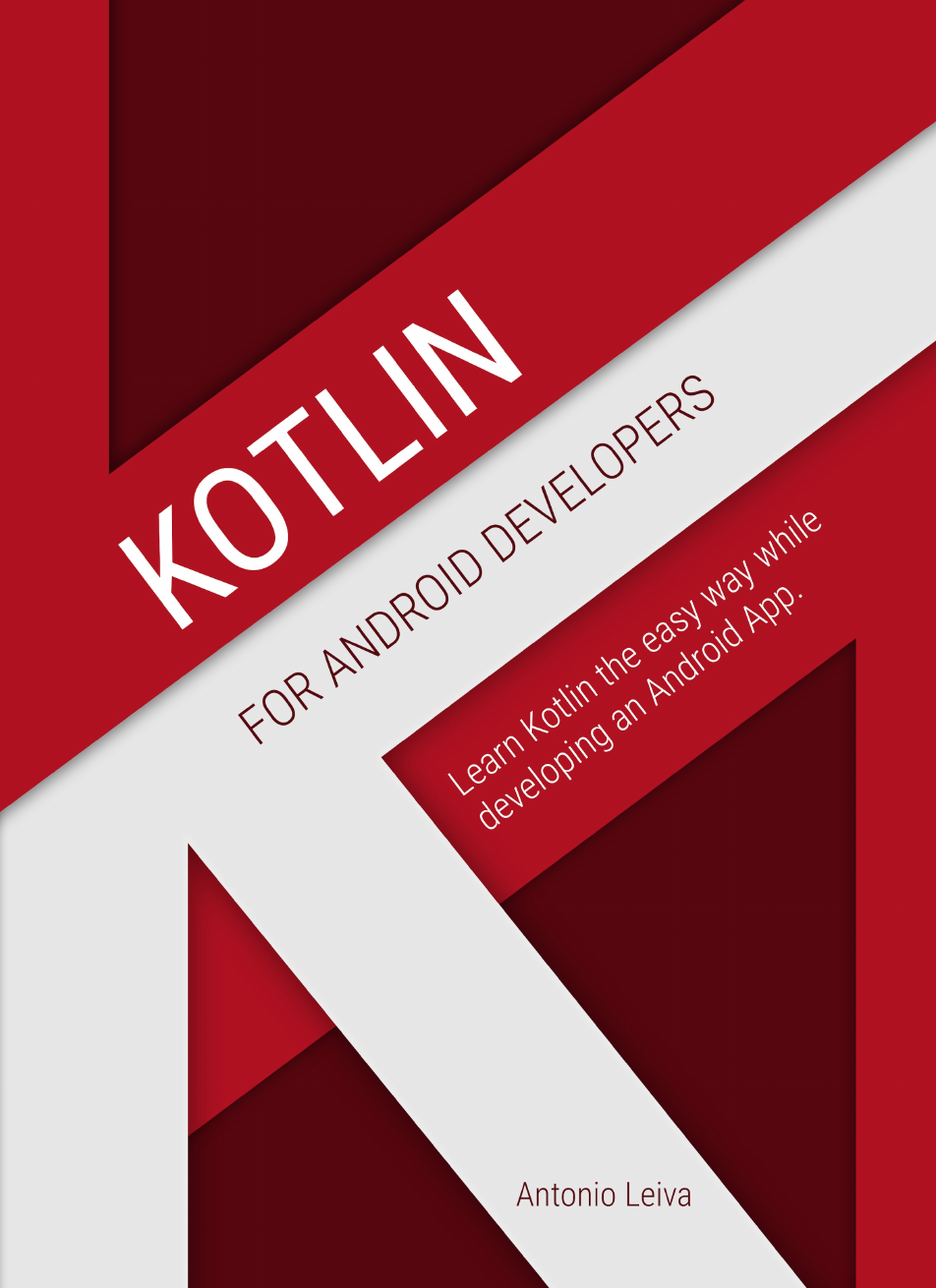 Contents I. About this book . . . . . . . . . . . . . . . . . . . . . . . . . . . . . . . . 1 What is “Kotlin for Android Developers” about . . . . . . . . . . . . . . 1 II. Is this book for you? . . . . . . . . . . . . . . . . . . . . . . . . . . . . . 3 III. About the author . . . . . . . . . . . . . . . . . . . . . . . . . . . . . . 4 1 Introduction . . . . . . . . . . . . . . . . . . . . . . . . . . . . . . . . . . 5 1.1 What is Kotlin? . . . . . . . . . . . . . . . . . . . . . . . . . . . . . . 5 1.2 What do we get with Kotlin? . . . . . . . . . . . . . . . . . . . . . . 6 2 Getting ready . . . . . . . . . . . . . . . . . . . . . . . . . . . . . . . . . 11 2.1 Android Studio . . . . . . . . . . . . . . . . . . . . . . . . . . . . . . 11 2.2 Install Kotlin plugin . . . . . . . . . . . . . . . . . . . . . . . . . . . 12 3 Creating a new project . . . . . . . . . . . . . . . . . . . . . . . . . . . . 13 3.1 Create a new project in Android Studio . . . . . . . . . . . . . . . . 13 3.2 Convert MainActivity to Kotlin code . . . . . . . . . . . . . . . . . . 14 3.3 Configure Kotlin in project . . . . . . . . . . . . . . . . . . . . . . . 14 3.4 Include some other useful configuration . . . . . . . . . . . . . . . . 15 3.5 Test that everything works . . . . . . . . . . . . . . . . . . . . . . . 17 4 Classes and functions . . . . . . . . . . . . . . . . . . . . . . . . . . . . . 19 4.1 How to declare a class . . . . . . . . . . . . . . . . . . . . . . . . . . 19 4.2 Class inheritance . . . . . . . . . . . . . . . . . . . . . . . . . . . . . 20 4.3 Functions . . . . . . . . . . . . . . . . . . . . . . . . . . . . . . . . . 20 4.4 Constructor and functions parameters . . . . . . . . . . . . . . . . . 21 Kotlin for Android Developers Learn Kotlin the easy way while developing an Android App Antonio Leiva This book is for sale at http://leanpub.com/kotlin-for-android-developers This version was published on 2017-06-20 This is a Leanpub book. Leanpub empowers authors and publishers with the Lean Publishing process. Lean Publishing is the act of publishing an in-progress ebook using lightweight tools and many iterations to get reader feedback, pivot until you have the right book and build traction once you do. © 2015 - 2017 Antonio Leiva Tweet This Book! Please help Antonio Leiva by spreading the word about this book on Twitter! The suggested hashtag for this book is #kotlinandroiddev. Find out what other people are saying about the book by clicking on this link to search for this hashtag on Twitter: https://twitter.com/search?q=#kotlinandroiddev This book is dedicated to all the loyal readers of antonioleiva.com, who made me believe that writing about Android development was a powerful tool to help others learn about it. I felt this book as a necessary step forward. I also want to do a special mention to Luis Herrero Jiménez, who has designed the awesome cover of this book, and to Gautier Mechling for helping me so much by reviewing this book. It’s thanks to him that this pages are not full of typos and mistakes. And, of course, this is specially dedicated to you. With your support and your help this book is growing, and I hope it will become a reference. So any claim or suggestion you think it will improve the quality of this book will be welcomed. Feel free to write anytime to contact@antonioleiva.com. CONTENTS 28 Testing your App . . . . . . . . . . . . . . . . . . . . . . . . . . . . . . . 165 28.1 Unit testing . . . . . . . . . . . . . . . . . . . . . . . . . . . . . . . 165 28.2 Mocking closed classes . . . . . . . . . . . . . . . . . . . . . . . . . 169 28.3 Instrumentation tests . . . . . . . . . . . . . . . . . . . . . . . . . . 171 29 Extra concepts . . . . . . . . . . . . . . . . . . . . . . . . . . . . . . . . 176 29.1 Nested classes . . . . . . . . . . . . . . . . . . . . . . . . . . . . . . 176 29.2 Enum classes . . . . . . . . . . . . . . . . . . . . . . . . . . . . . . 177 29.3 Sealed classes . . . . . . . . . . . . . . . . . . . . . . . . . . . . . . 178 29.4 Exceptions . . . . . . . . . . . . . . . . . . . . . . . . . . . . . . . . 179 30 Conclusion . . . . . . . . . . . . . . . . . . . . . . . . . . . . . . . . . . 181 CONTENTS 5 Writing your first class . . . . . . . . . . . . . . . . . . . . . . . . . . . . 24 5.1 Creating the layout . . . . . . . . . . . . . . . . . . . . . . . . . . . 24 5.2 The Recycler Adapter . . . . . . . . . . . . . . . . . . . . . . . . . . 25 6 Variables and properties . . . . . . . . . . . . . . . . . . . . . . . . . . . 28 6.1 Basic types . . . . . . . . . . . . . . . . . . . . . . . . . . . . . . . . 28 6.2 Variables . . . . . . . . . . . . . . . . . . . . . . . . . . . . . . . . . 30 6.3 Properties . . . . . . . . . . . . . . . . . . . . . . . . . . . . . . . . . 31 7 Anko and Extension Functions . . . . . . . . . . . . . . . . . . . . . . . 33 7.1 What is Anko? . . . . . . . . . . . . . . . . . . . . . . . . . . . . . . 33 7.2 Start using Anko . . . . . . . . . . . . . . . . . . . . . . . . . . . . . 33 7.3 Extension functions . . . . . . . . . . . . . . . . . . . . . . . . . . . 34 8 Retrieving data from API . . . . . . . . . . . . . . . . . . . . . . . . . . . 36 8.1 Performing a request . . . . . . . . . . . . . . . . . . . . . . . . . . . 36 8.2 Performing the request out of the main thread . . . . . . . . . . . . . 37 9 Data Classes . . . . . . . . . . . . . . . . . . . . . . . . . . . . . . . . . . 39 9.1 Extra functions . . . . . . . . . . . . . . . . . . . . . . . . . . . . . . 39 9.2 Copying a data class . . . . . . . . . . . . . . . . . . . . . . . . . . . 39 9.3 Mapping an object into variables . . . . . . . . . . . . . . . . . . . . 40 10 Parsing data . . . . . . . . . . . . . . . . . . . . . . . . . . . . . . . . . . 42 10.1 Converting json to data classes . . . . . . . . . . . . . . . . . . . . . 42 10.2 Shaping the domain layer . . . . . . . . . . . . . . . . . . . . . . . 44 10.3 Drawing the data in the UI . . . . . . . .